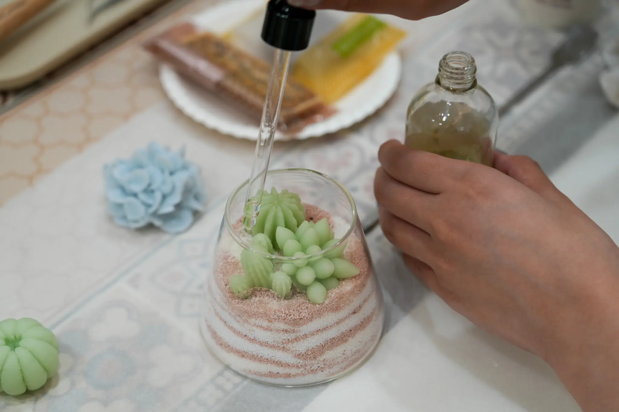 ▼最後就是放入多肉,實際嘗試後發現大概兩個小的一個大的就是極限了,然後再滴入剛剛選擇的香精,就大功告成啦!