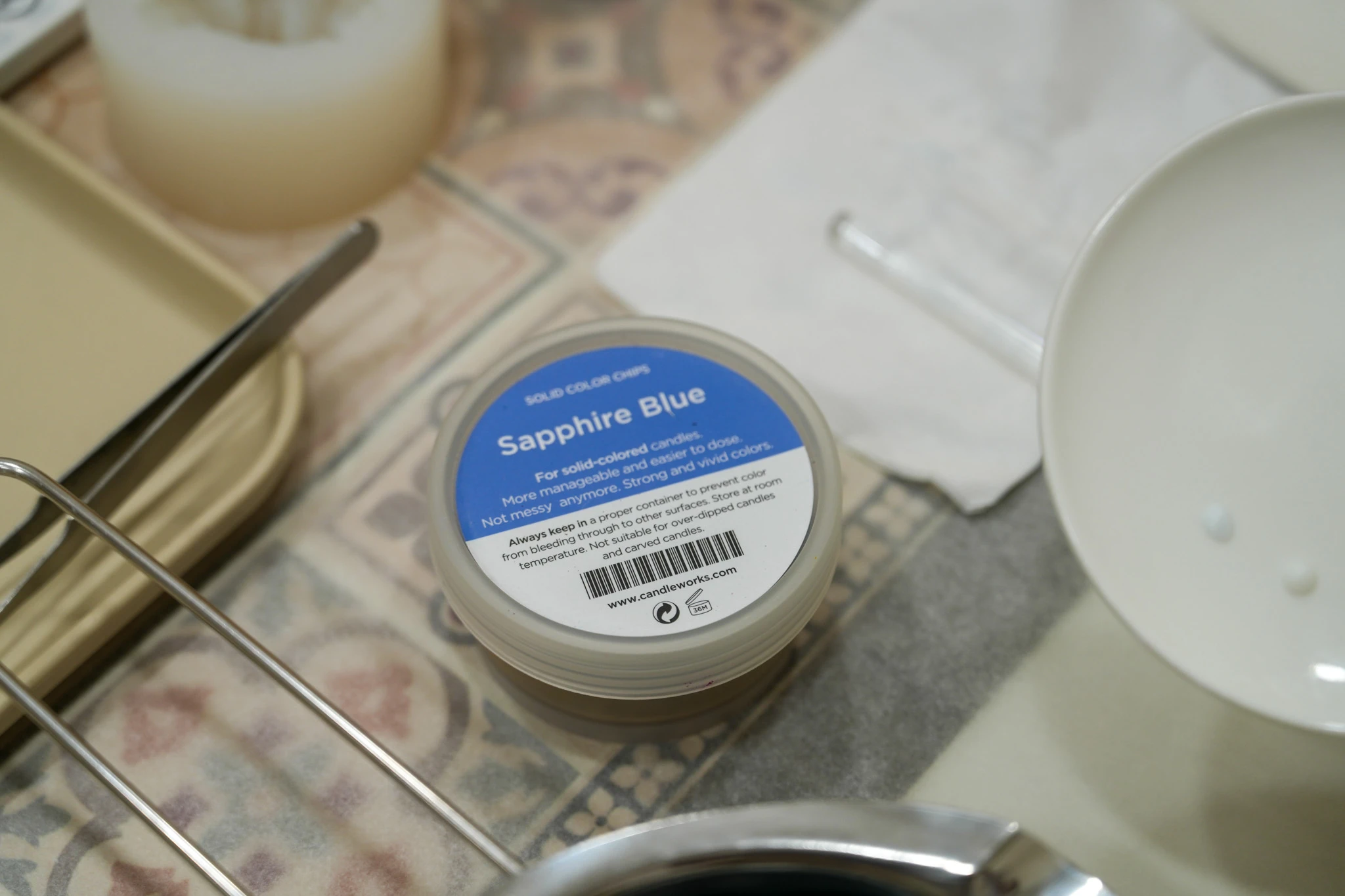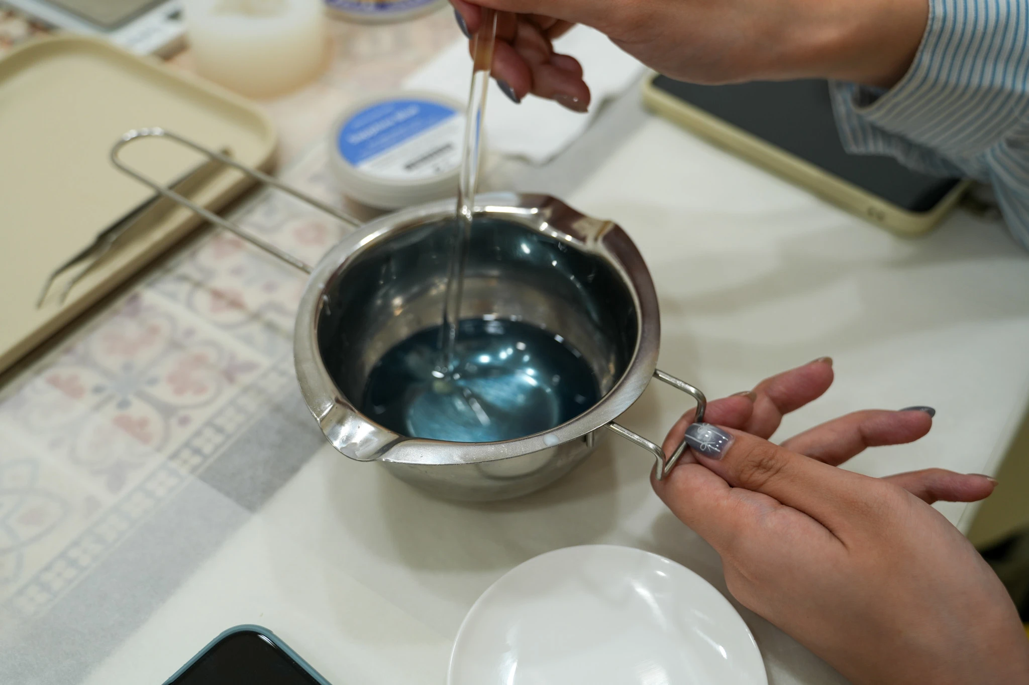 ▼接著會調蠟燭的顏色,桌上會有一盤色片給你選擇,建議先選小的避免顏色過濃,將其放到蠟液裡面攪拌,然後滴在盤子上確認顏色的深淺。