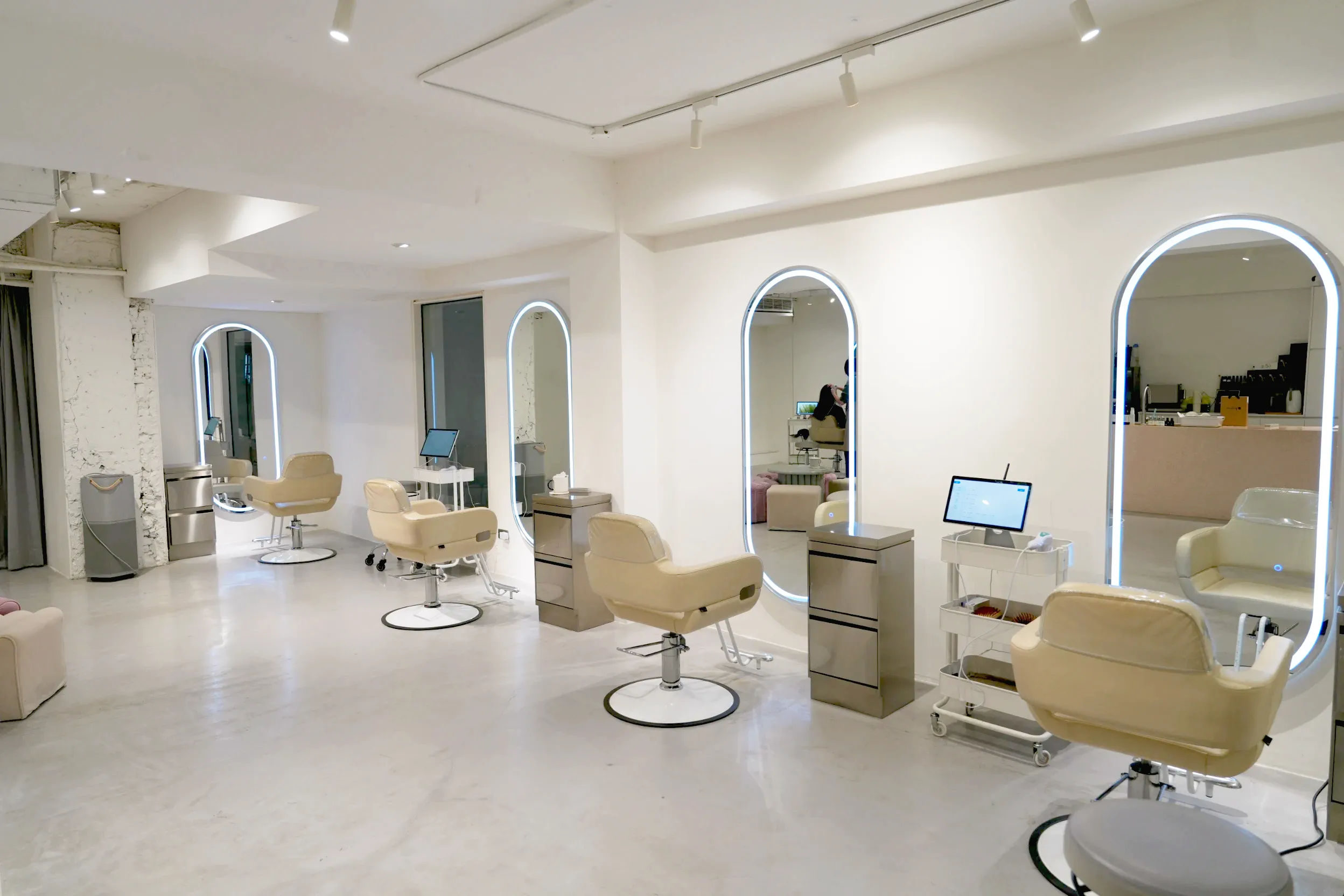▼店家內裝潢都是以白色系和淡色系為主,搭配有環狀燈光的鏡子,看起來簡約又時尚,還放著輕音樂,讓人一走進來就很放鬆。