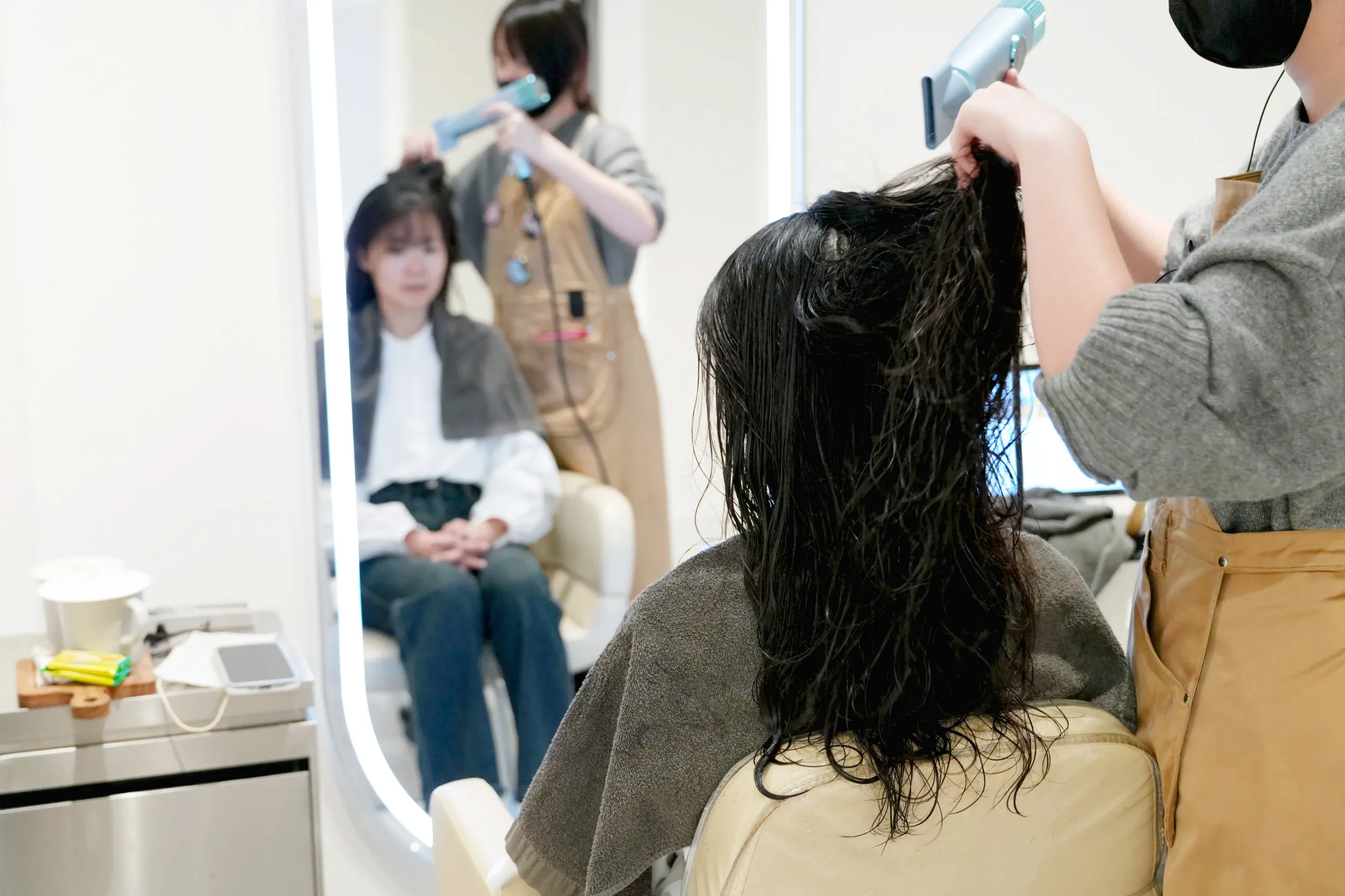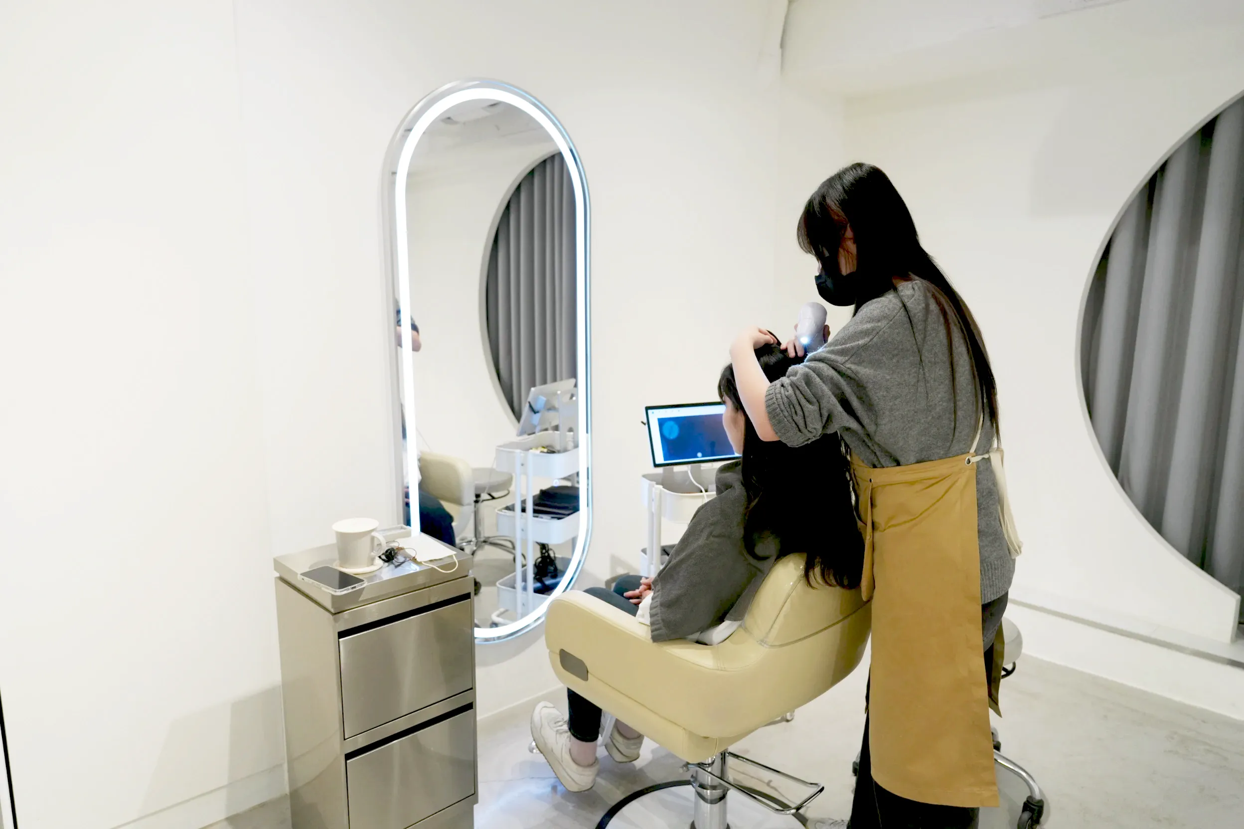 ▼每個座位旁邊有抽屜可以放置自己的隨身物品,放不進去的包包和外套店員也會幫忙額外拿去衣櫃掛好,座位的間距都至少有一公尺左右,在進行頭皮養護的時候不用擔心跟其他客人彼此干擾,可以好好地享用課程。