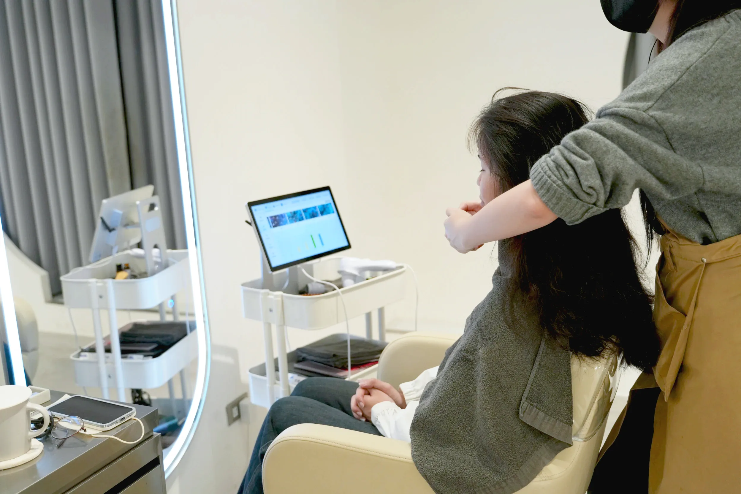 ▼接下來會進行第二次頭皮檢測,檢測完會再將頭髮吹整,店家只有幫忙進行分髮線和基本繞捲,並不會有其他額外的造型服務,不過用完後頭髮明顯整個亮起來,看起來非常滑順。