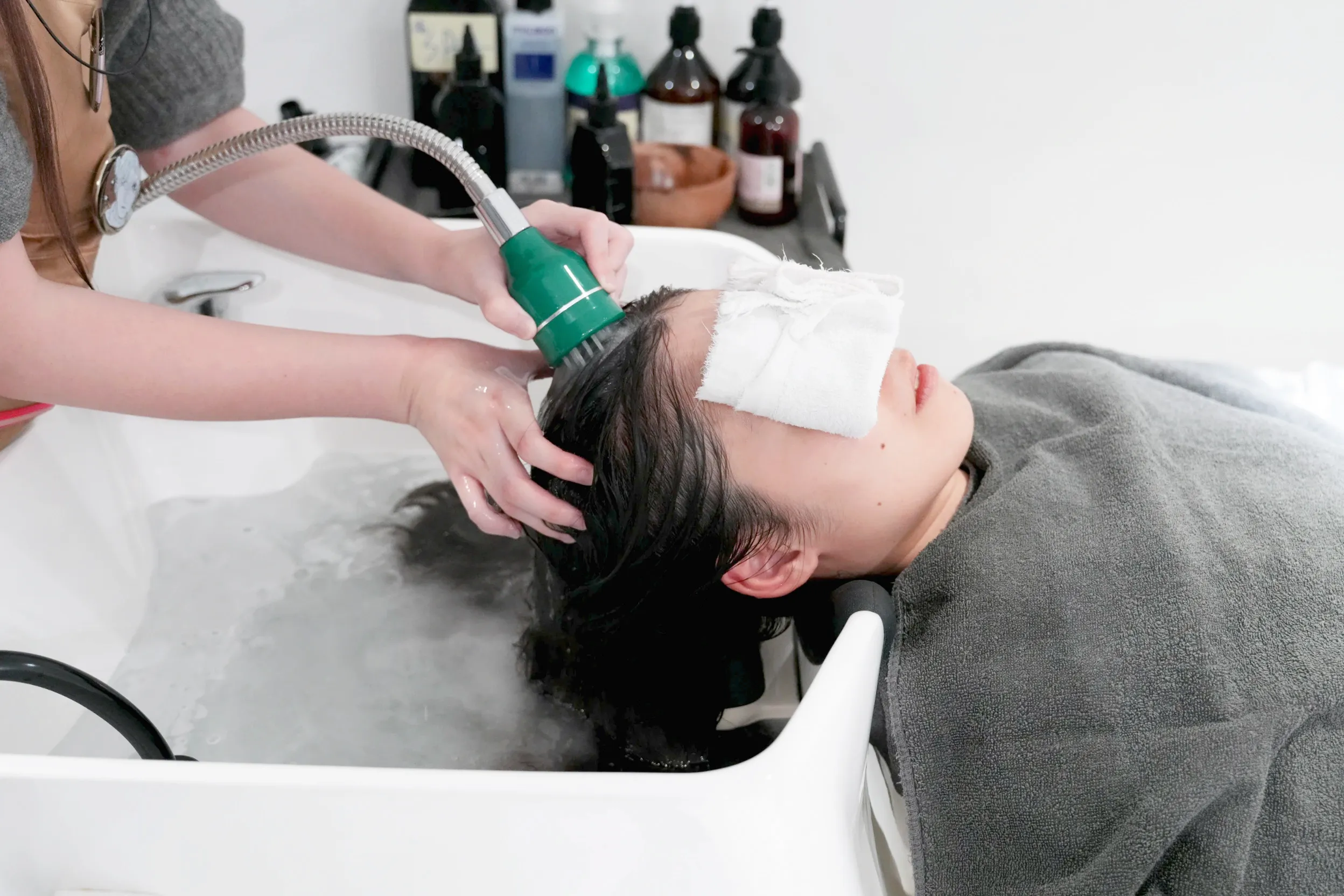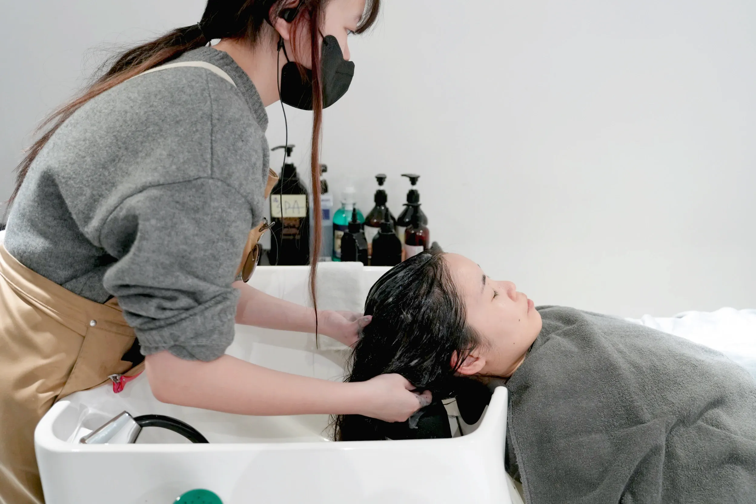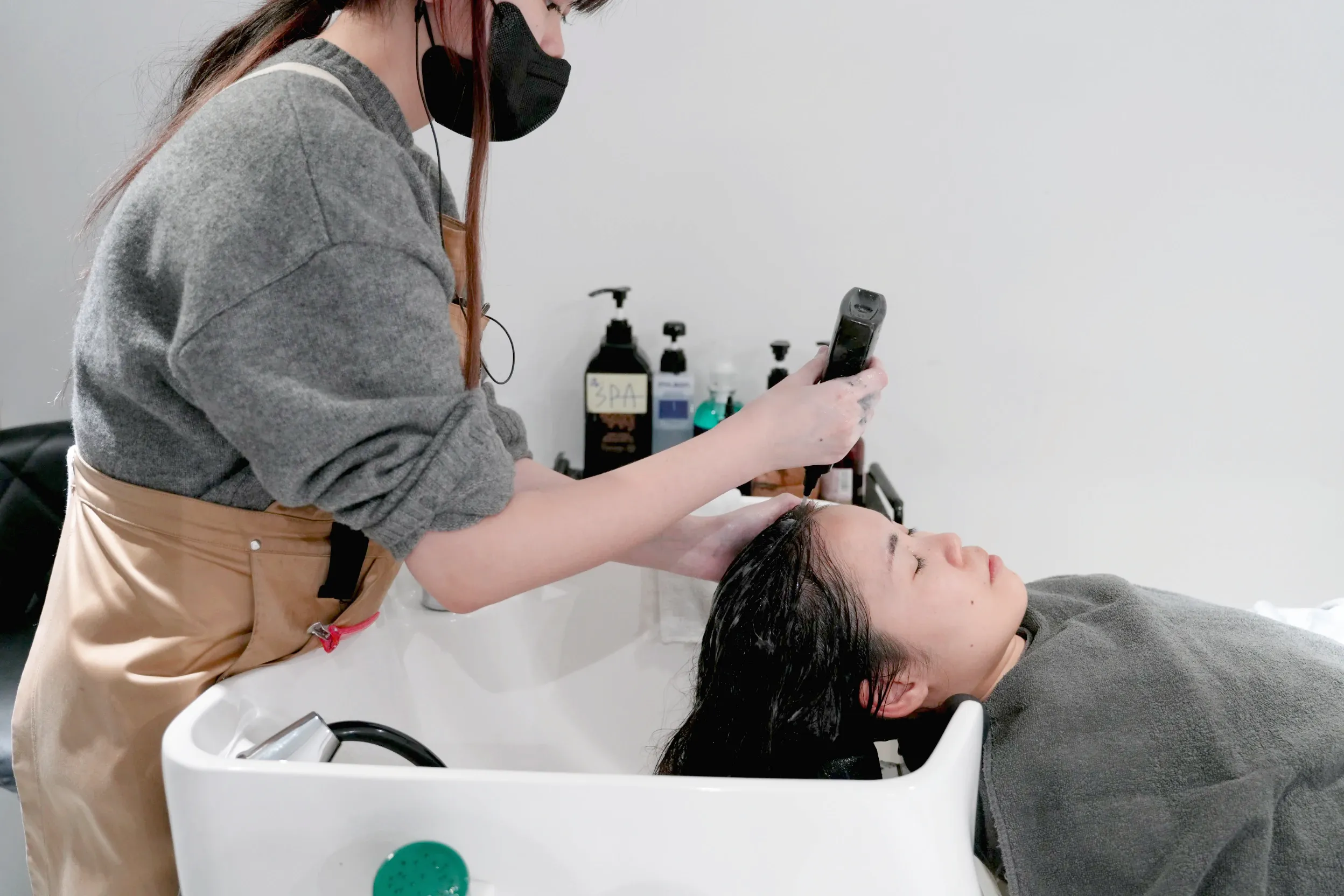 ▼接下來第二次洗頭使用的保濕洗髮精,洗完後會在頭皮上潤澤霜,在髮尾上護髮霜,處理的非常細緻。