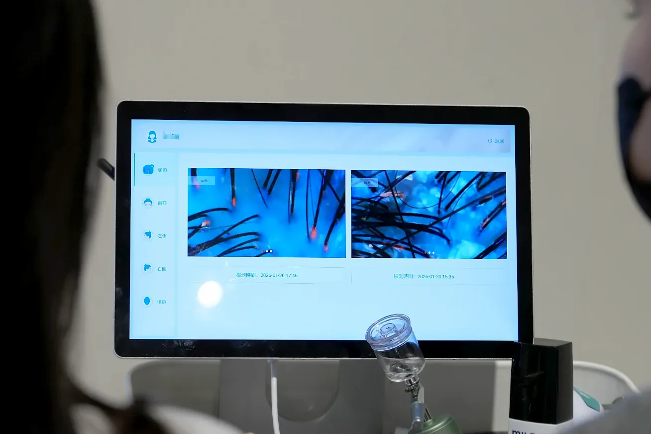 ▼頭皮檢測的照片會清楚標示有問題的地方,養護師也會很仔細的講解,像是我自己一直以來都以為我是油性頭皮,所以只使用控油洗髮精,但檢測結果顯示我是頭頂偏油、側邊有乾屑的中性頭皮,所以養護師建議我要洗兩次頭,第一次先使用控油洗髮精,第二次則是使用保濕洗髮精。