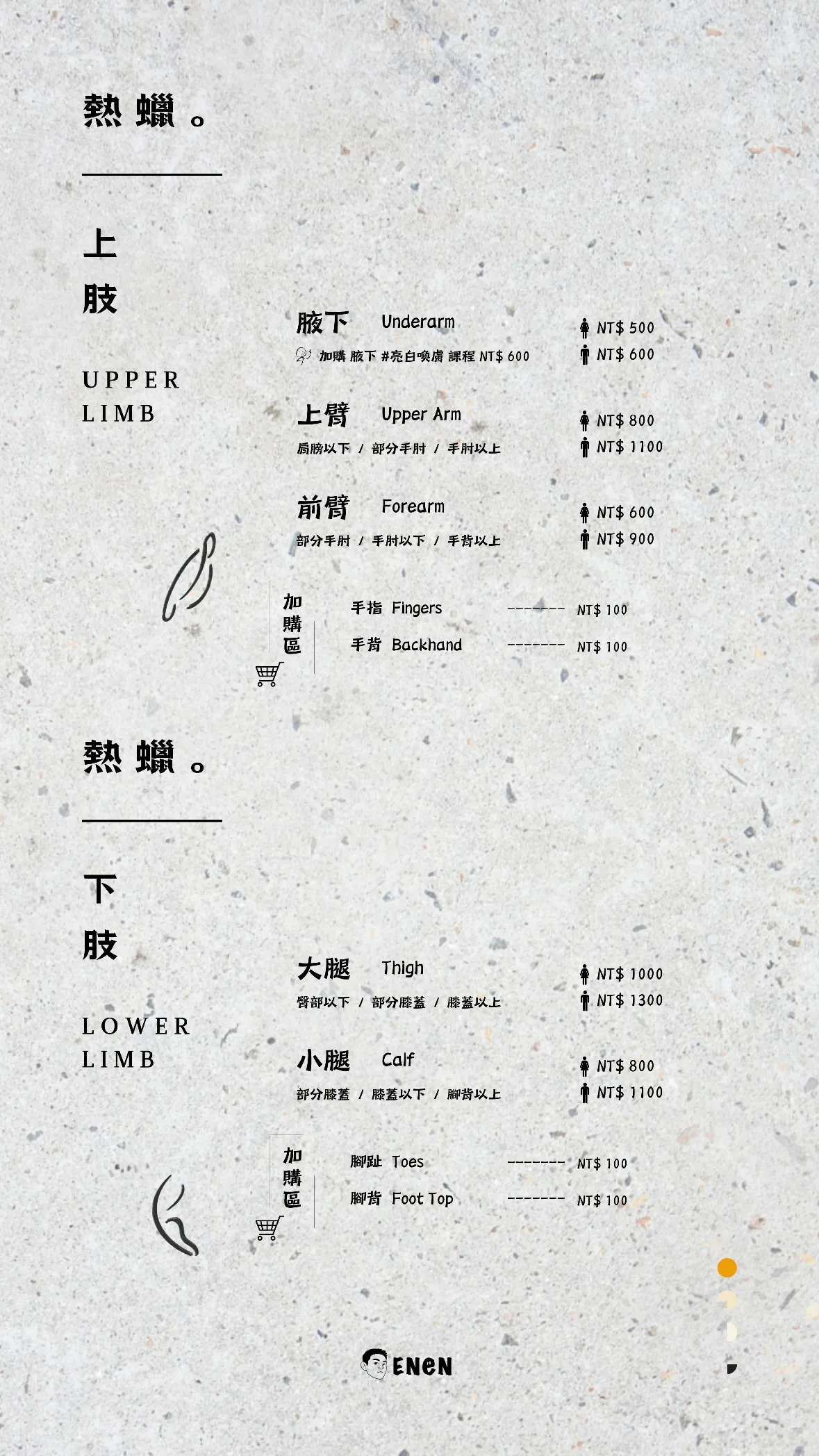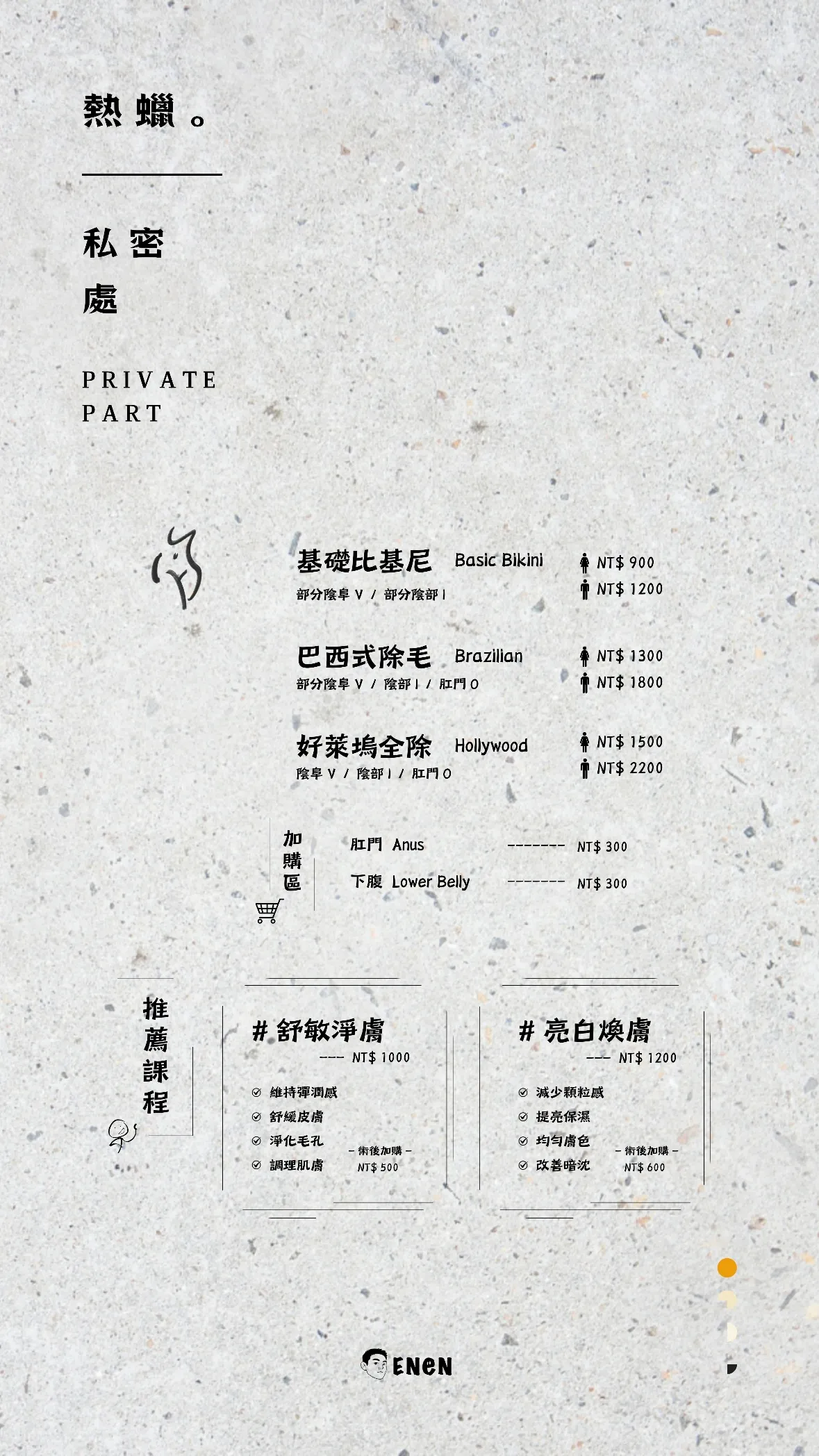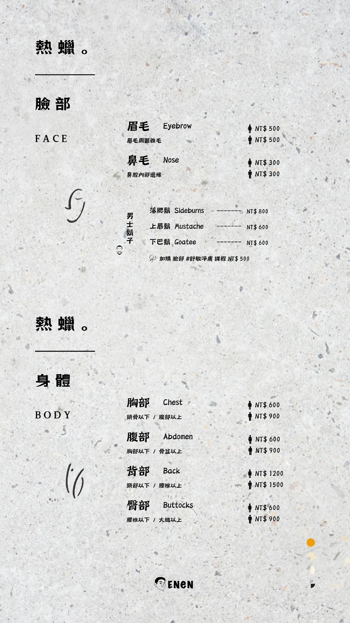 ▼「ENEN WAXING」專精於熱蠟除毛,除了提供常見的腋下、腿部、私密處等部位以外,也有臉部和胸部、臀部等部位的除毛服務,男女生價格不一樣,但都很公開透明,如果有問題也可以先在官方Line帳號詢問喔!