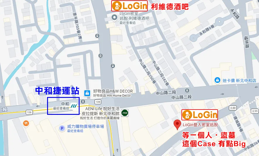 「LoGin密室逃脫」目前在新北有兩個店址,『一間為等一個人‧盜墓』、『這個Case有點Big』的館場,另外步行7分鐘距離的店址為『利維德酒吧』大型主題館場,兩處相距不遠。
