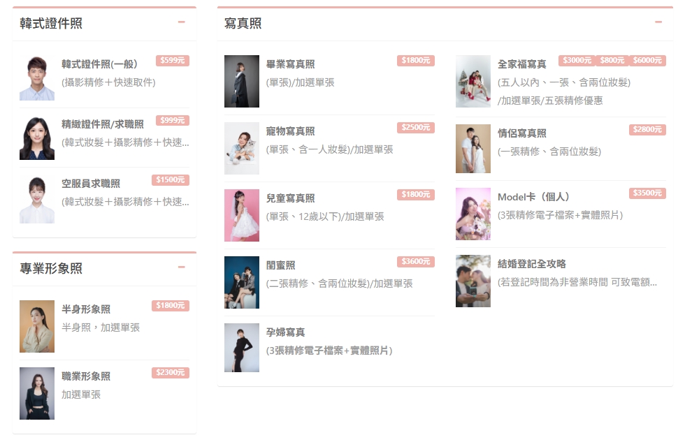 「奧莫照相館板橋江翠店」主要提供三大類的照相服務:韓式證件照、專業形象照、寫真照,都可以直接於官網上看到價格,點開項目也都有詳細的服務說明。
