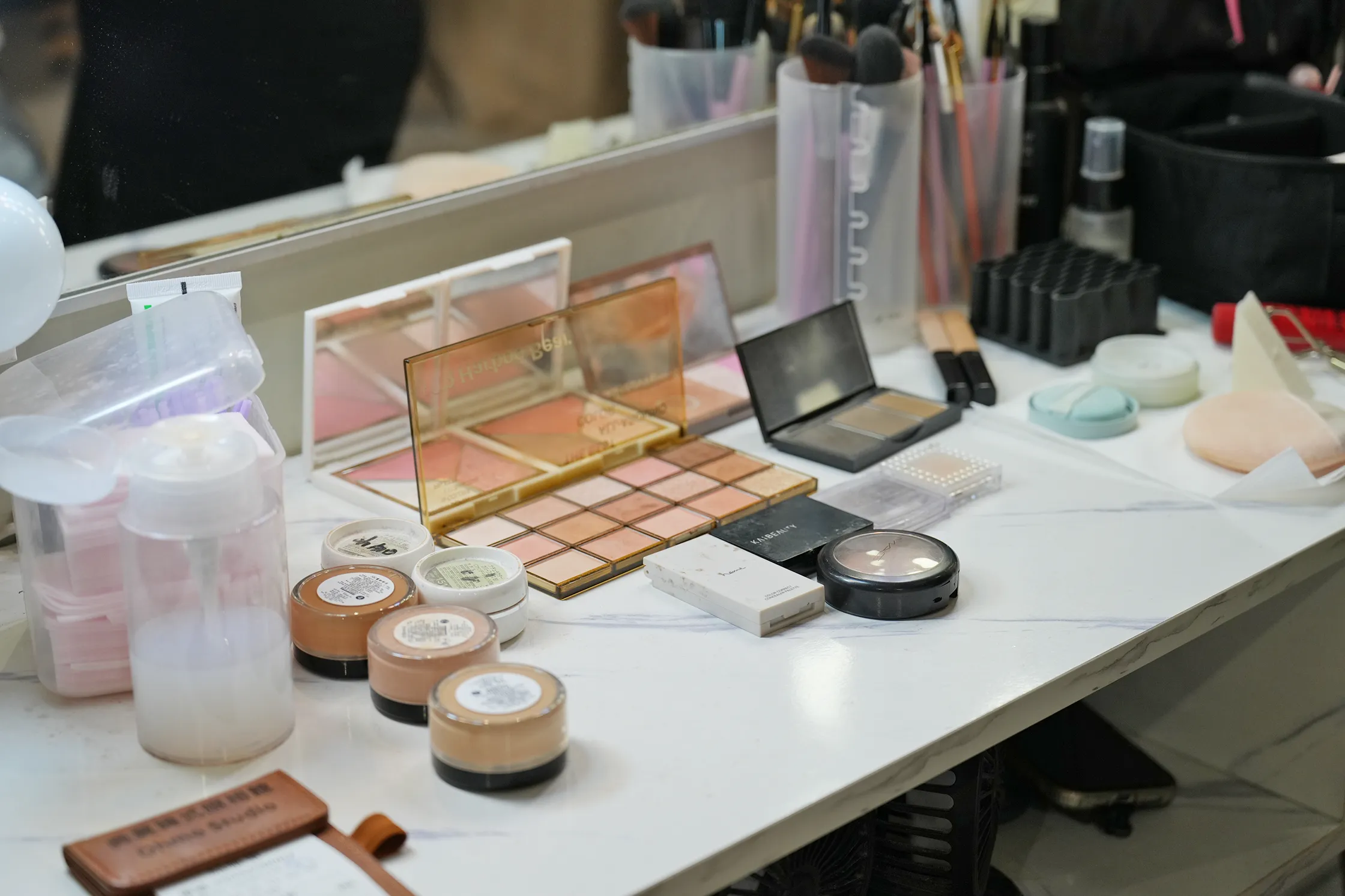 ▼桌上擺滿了各式各樣的化妝品,造型師會選擇最適合你的妝感色系。