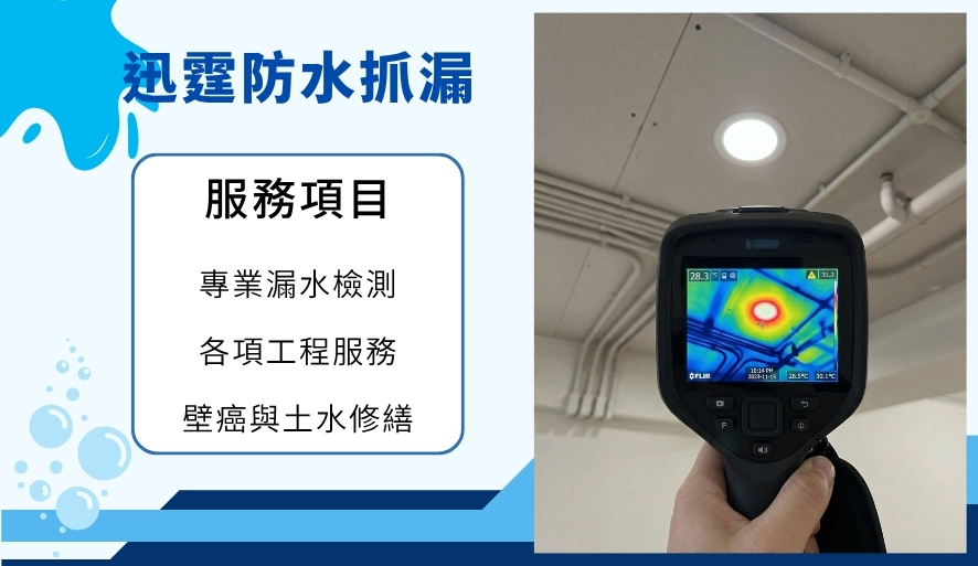 「迅霆防水抓漏工程行」專精處理各類建築漏水問題,並引進多項先進科技儀器,包括熱顯像儀、水分計、內視鏡、透地雷達等,能精準鎖定漏水源頭,快速解決屋頂滲水、牆壁滲漏、浴室漏水、管道間滲水問題以及地下室積水等棘手狀況。