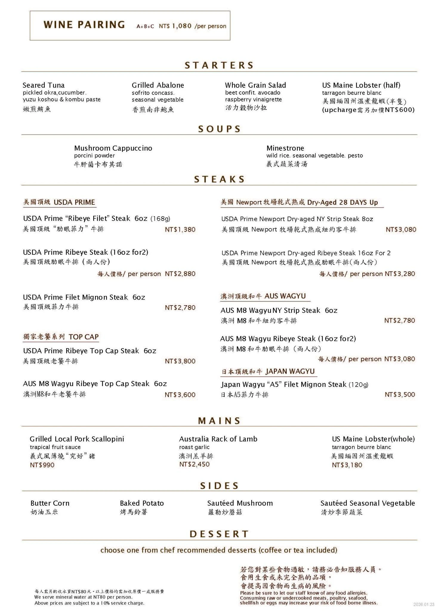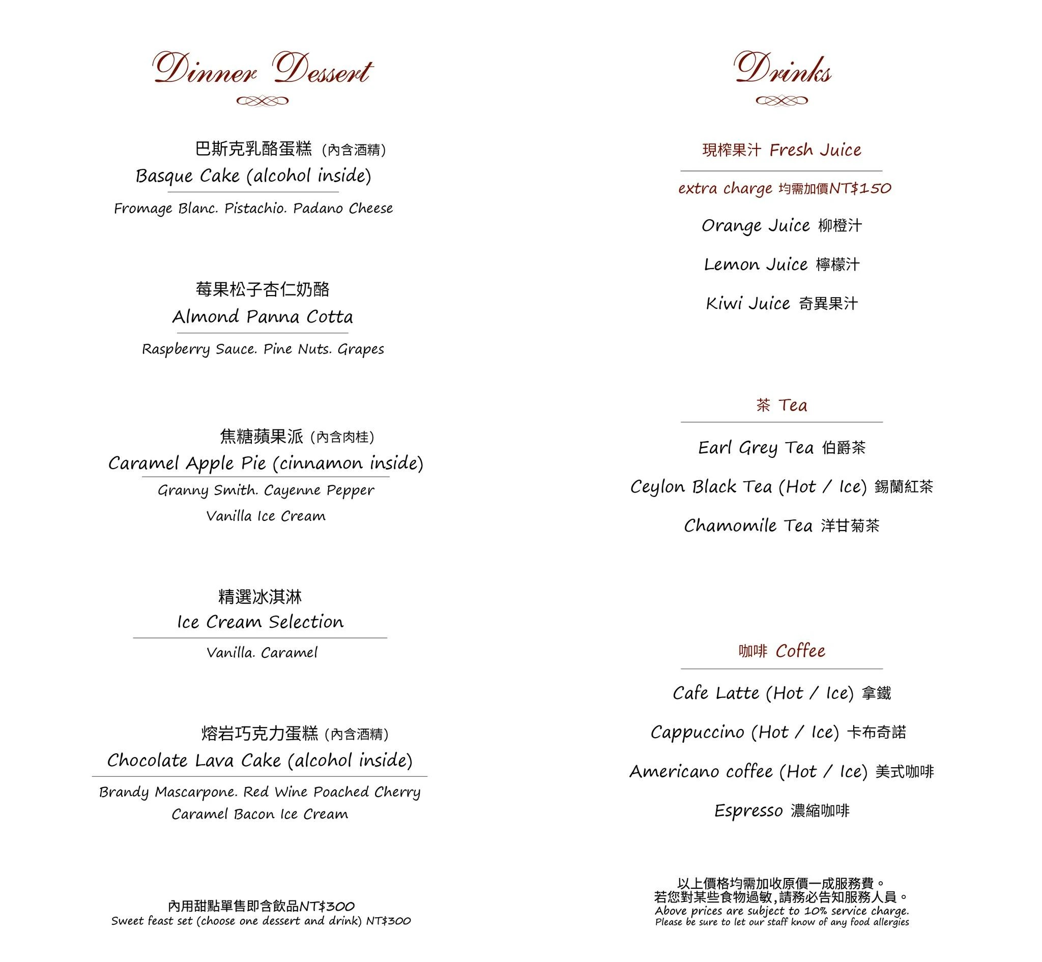▼晚餐菜單就相對較貴一點,不過前菜、甜點和配餐的選擇變的比較多,主餐也多了菲力老饕牛排的選擇。