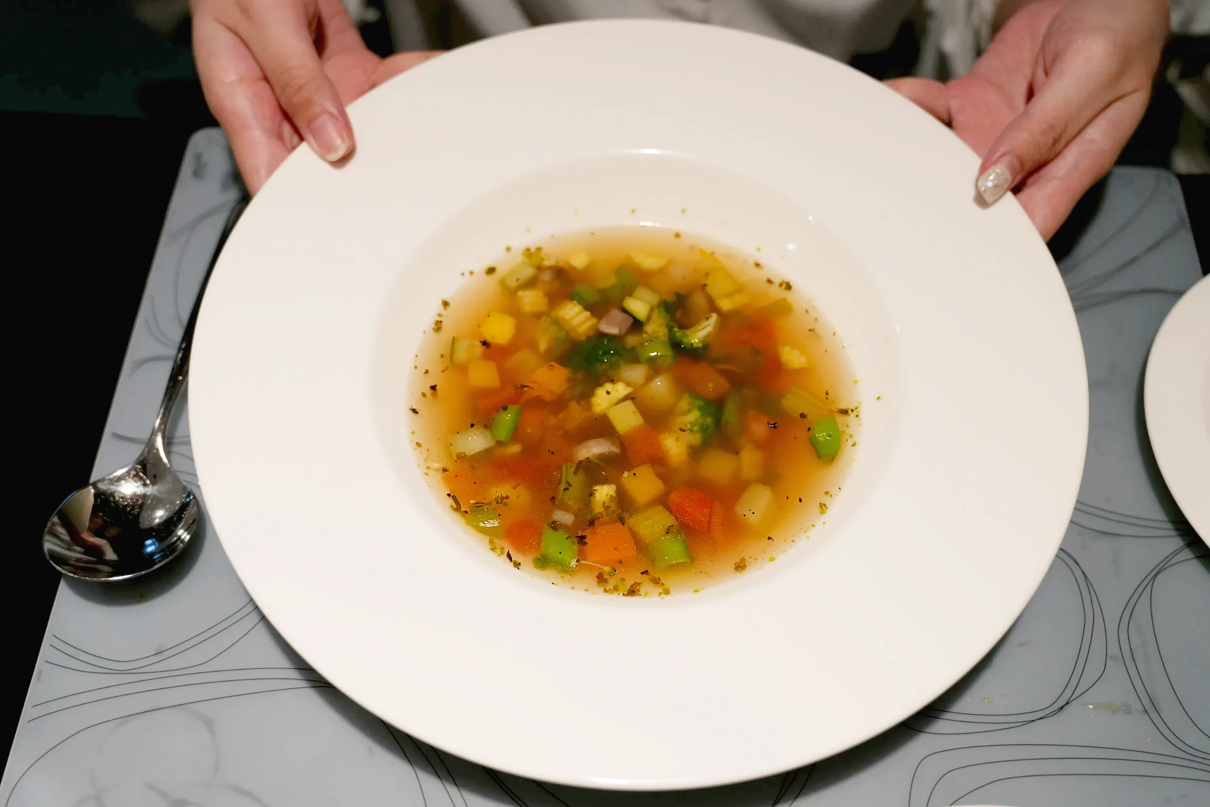 ▼如果想要清淡一點的湯品,我個人比較推薦義式蔬菜清湯,湯底喝起來是鮮甜的番茄味,還有些許義式香料的香氣,裡面有很多肉塊和蔬菜塊,暖胃又不會有太大的負擔。
