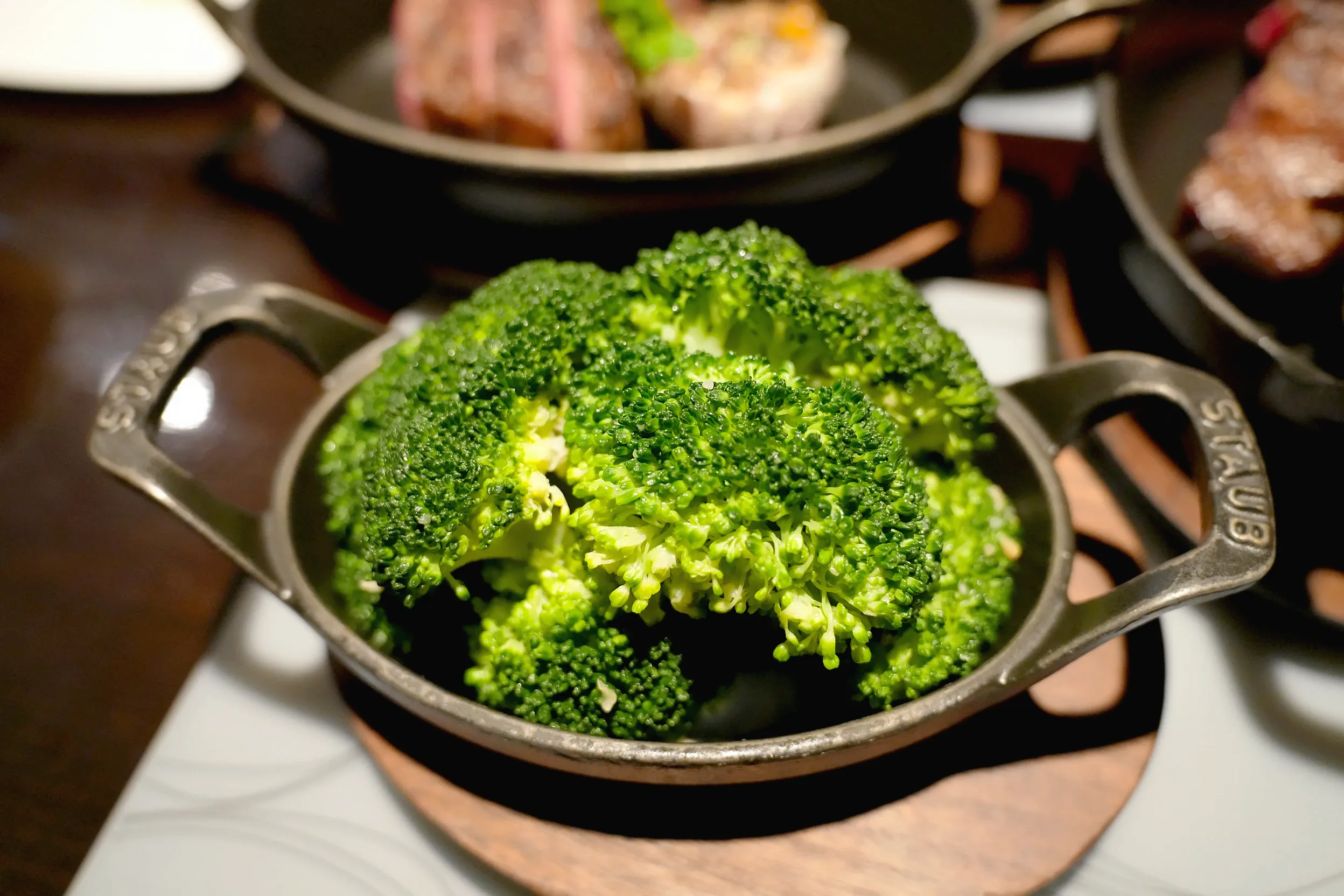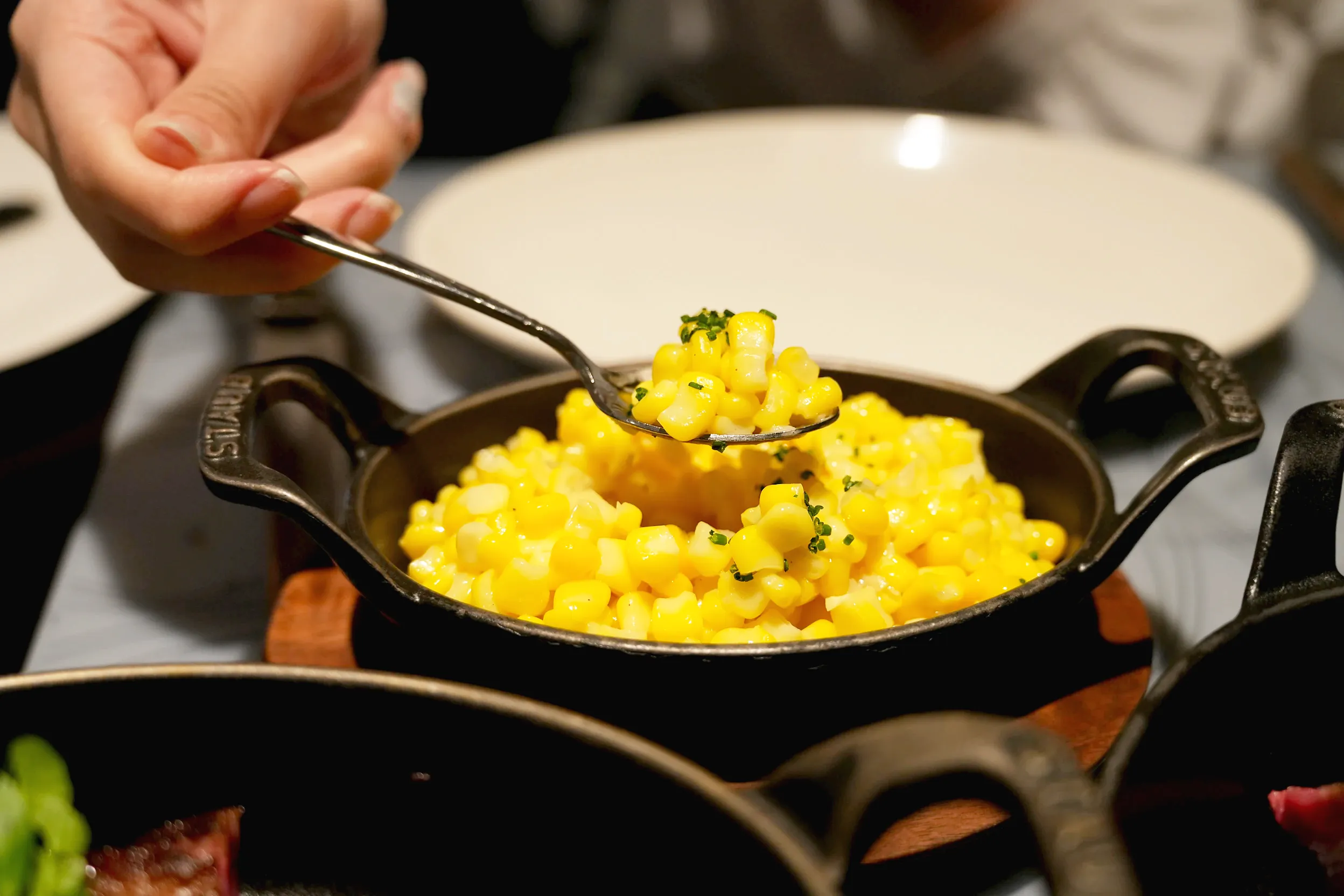 ▼配餐我們選擇的是奶油玉米和清炒季節蔬菜,會在主餐上菜的時候一起送過來。玉米奶油的部分在香氣比較明顯,整體吃起來的味道還是以玉米的甜味為主。當天的清炒季節蔬菜是花椰菜,軟硬度非常剛好,味道是有鹹味的蒜香。