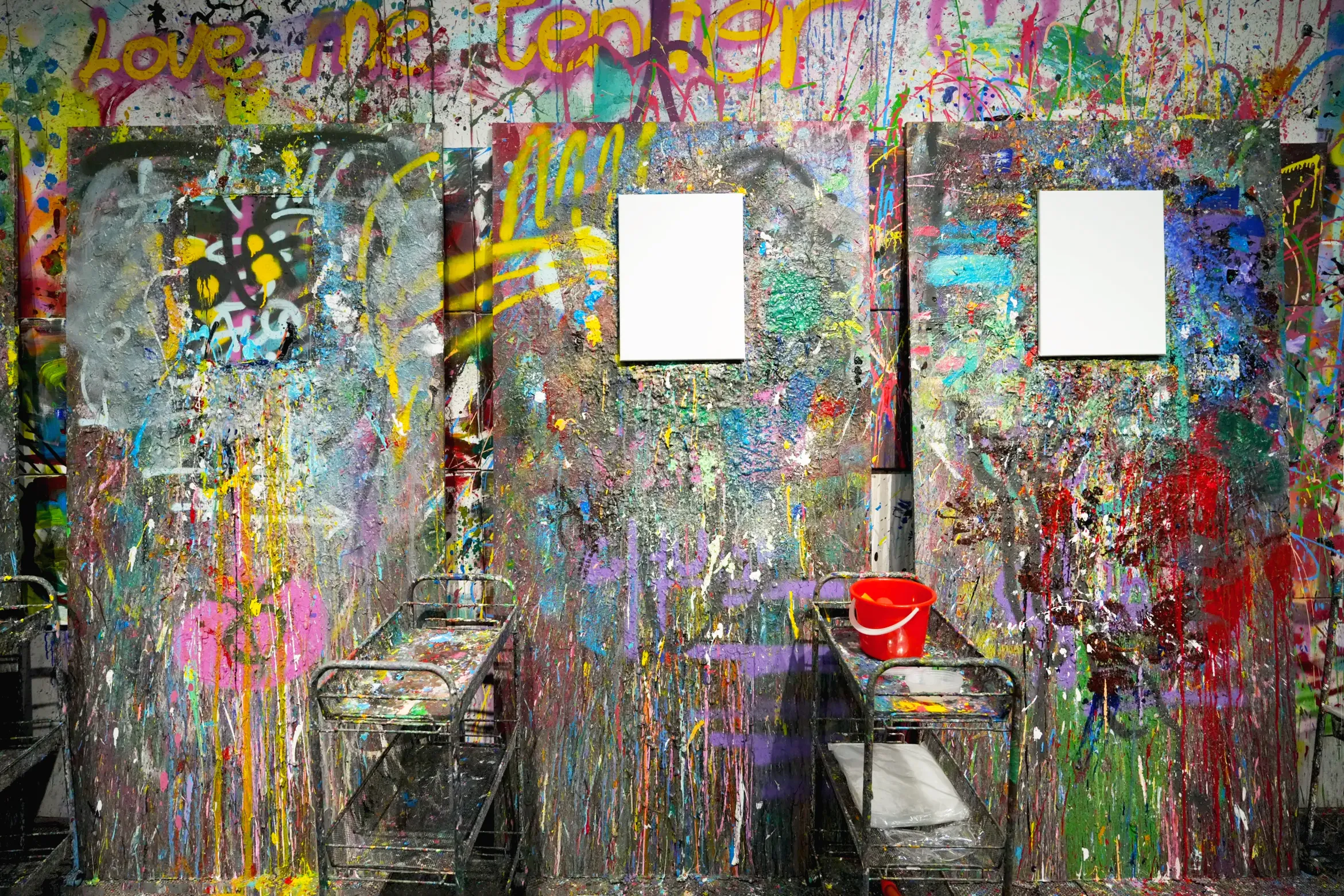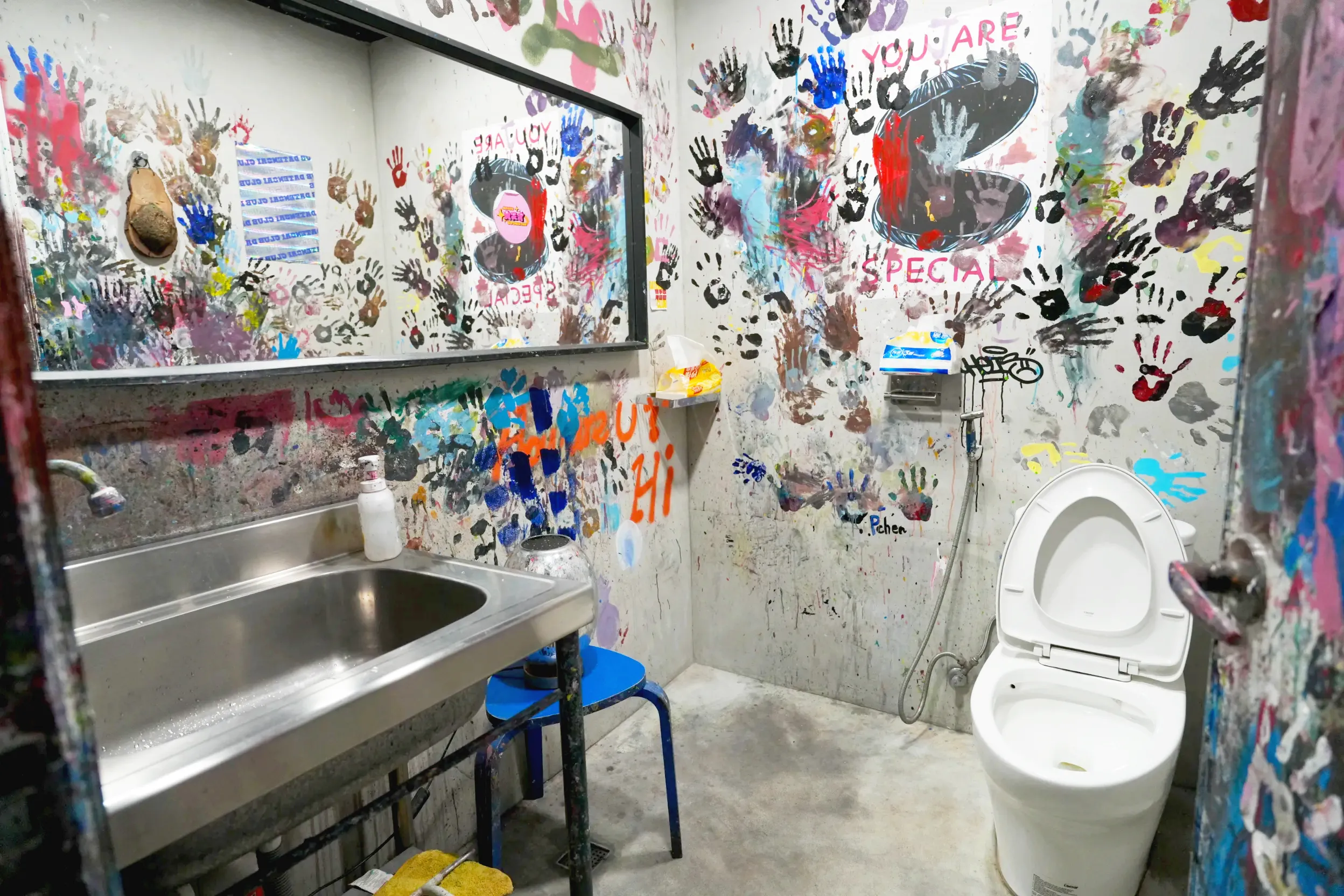▼廁所和洗手台也創作空間內,雖然牆面有許多藝術家留下的手印,不過整體打掃得非常乾淨,想要清洗身上的顏料也很方便。