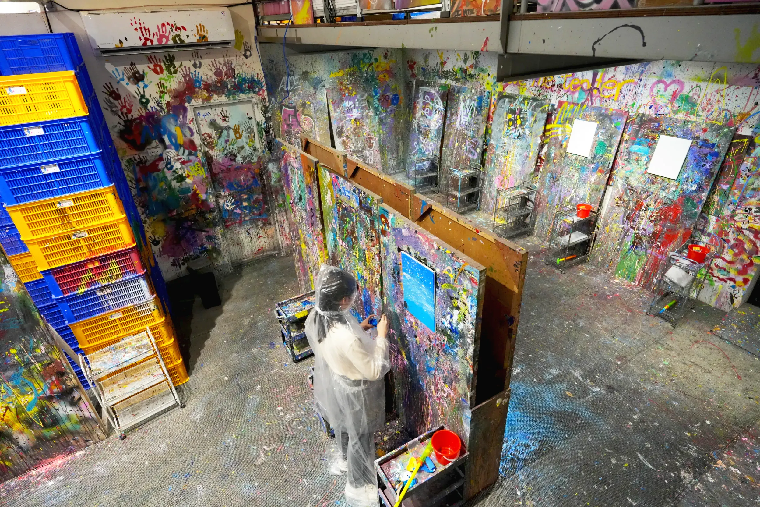 「大天才動感の沙龍」是一家人人都可以盡情創作的畫室,除了顏料是吃到飽無限量供應以外,還有提供各種畫具和可以玩得很髒的水槍,和親朋好友一起來除了畫畫也能互相用顏料往對方身上創作XD不過小缺點就是畫室位於一個社區內,社區門口會擋住外部的汽車,我們當天搭Uber過去就被擋在外面,只能自己走進去,離開也是要走出來才能叫車,下雨天會稍微有點不方便~