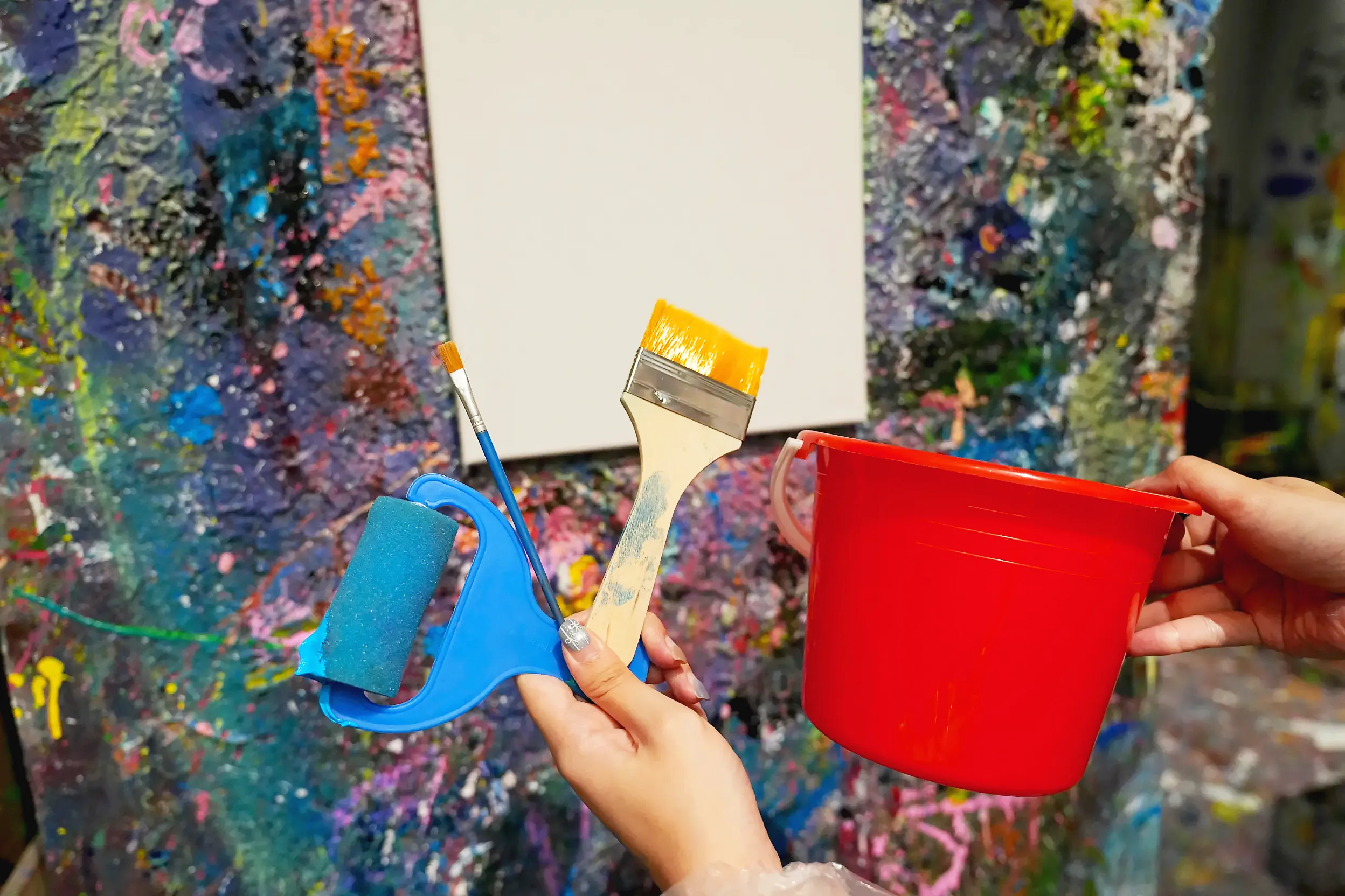 ▼畫具的部分有適合大面積創作的海綿滾輪和油漆刷、描繪細節用的水彩筆,以及一個讓你可以用來進行比較狂野潑撒創作的水桶,不過我個人比較沒那麼嗨,所以就拿水桶來裝我的畫具們XD