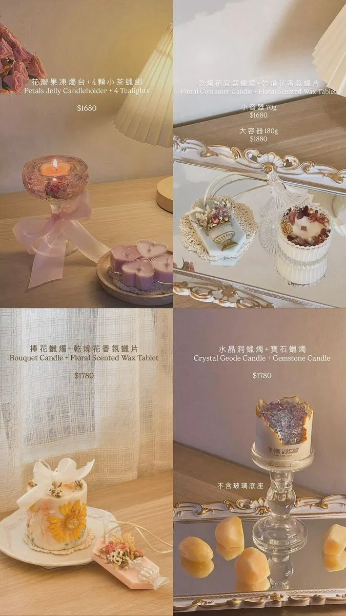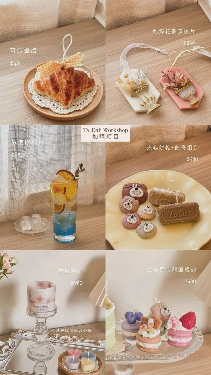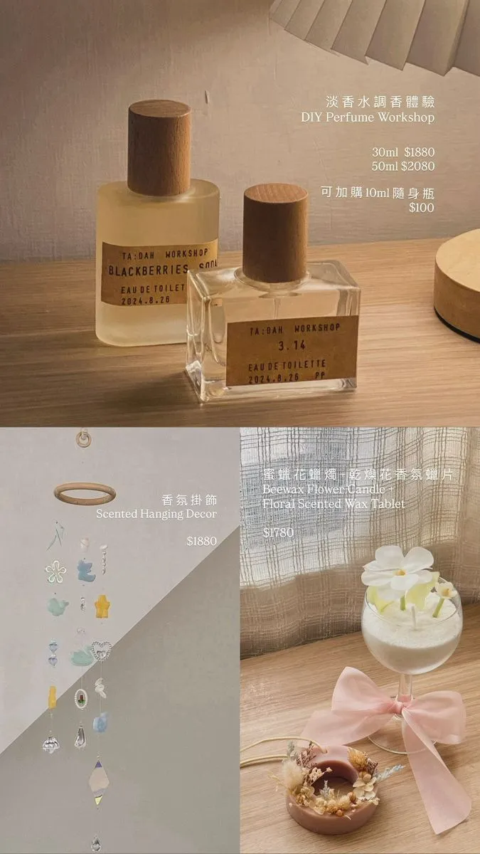 ▼「TA :DAH WORKSHOP」除了有各種蠟燭體驗課程以外,也有淡香水的調香體驗和加購其他手作蠟燭的選擇,蠟燭體驗課程的價格大概是1580~1880元左右。