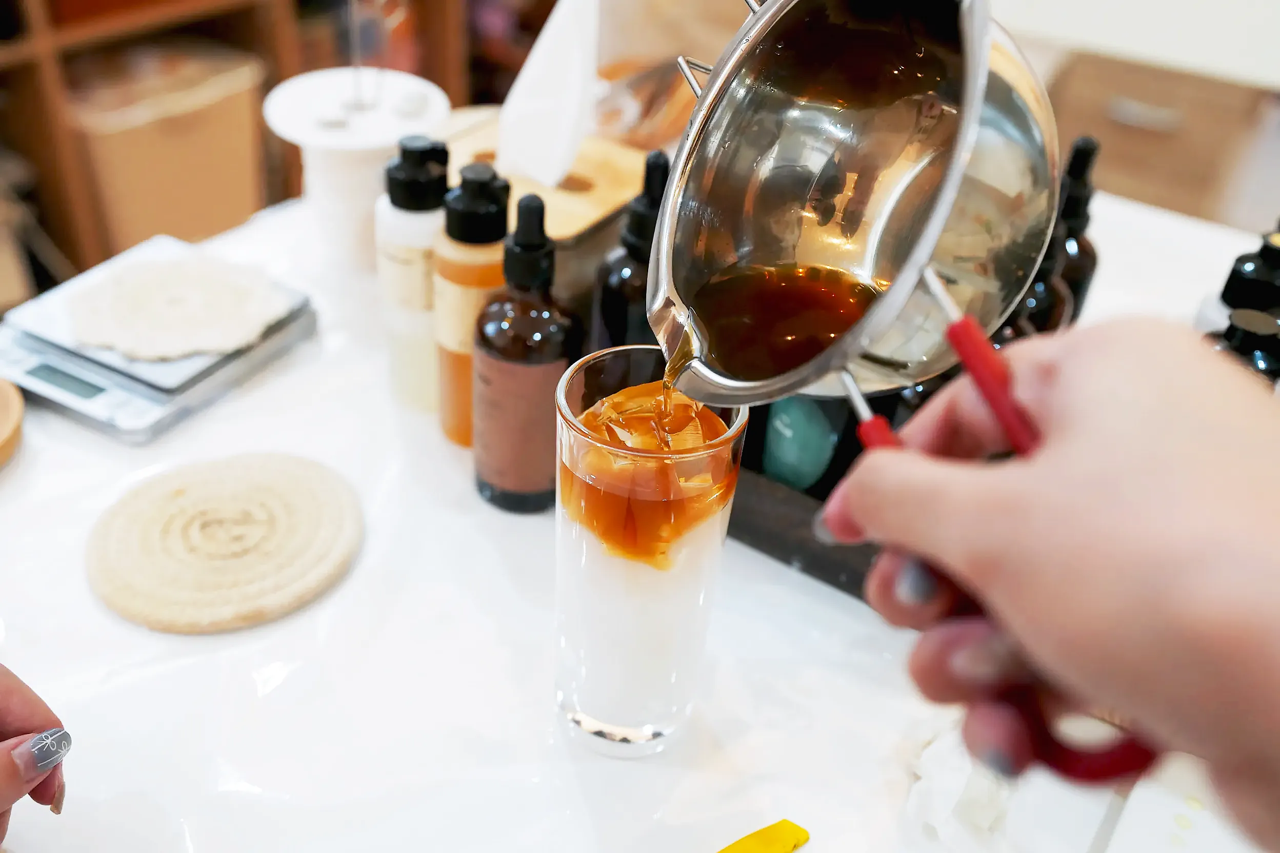 ▼拿鐵蠟燭的顏色是已經固定的了,所以按照老師的教學調好牛奶、咖啡的顏色後,一層層倒入杯子就可以了。