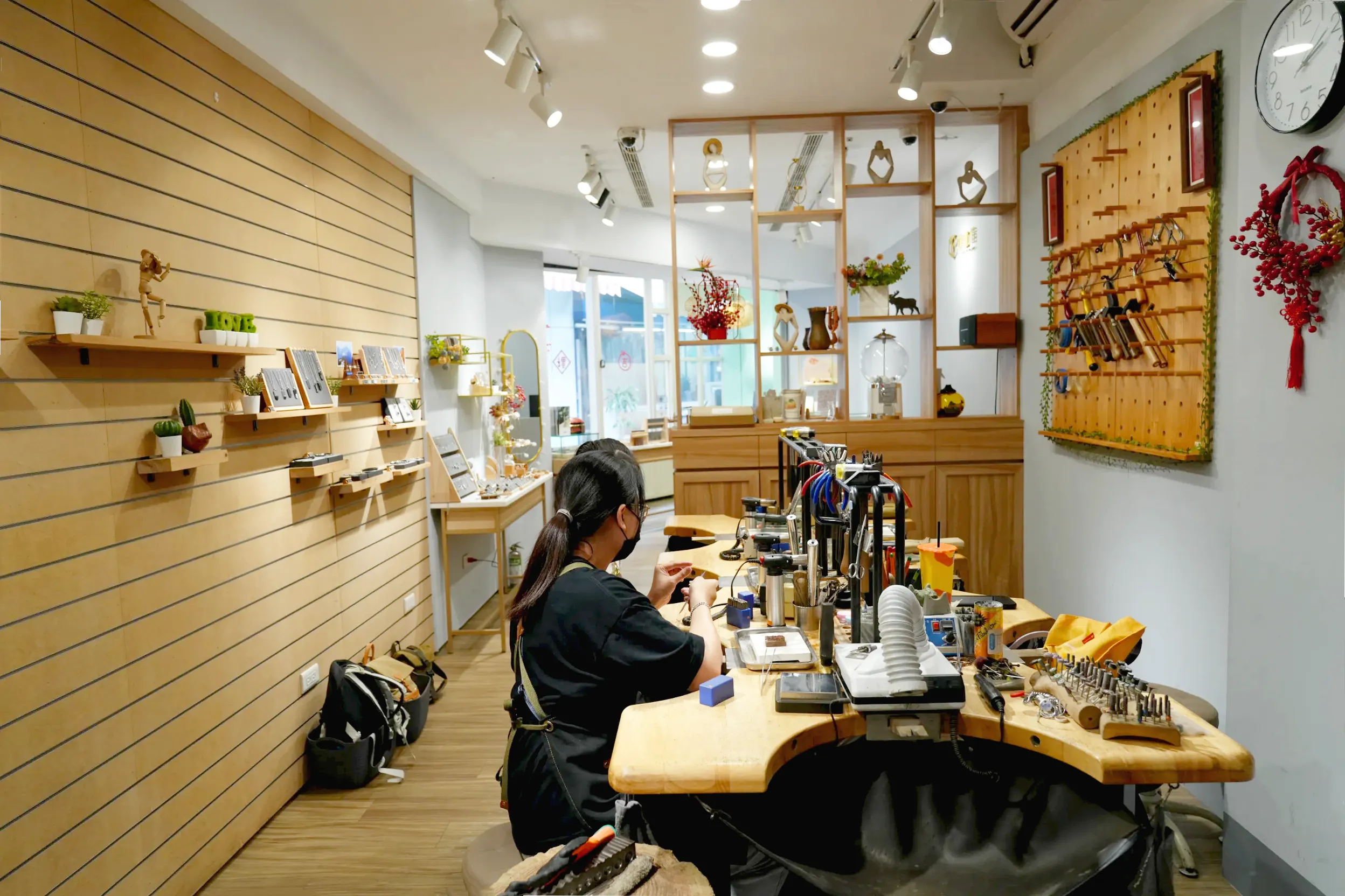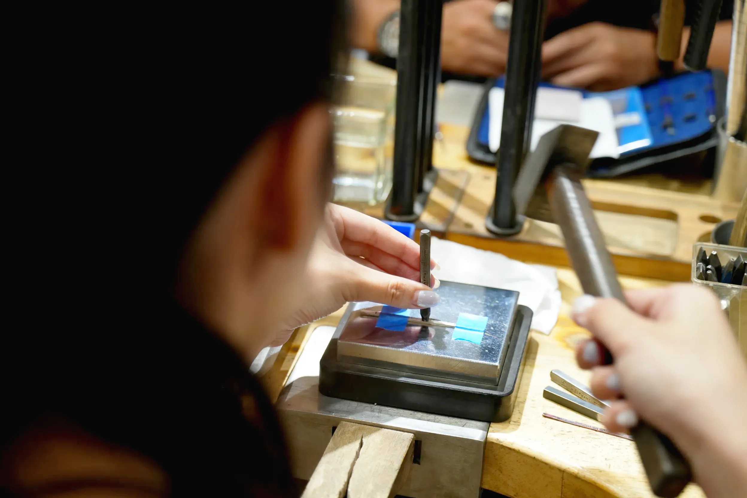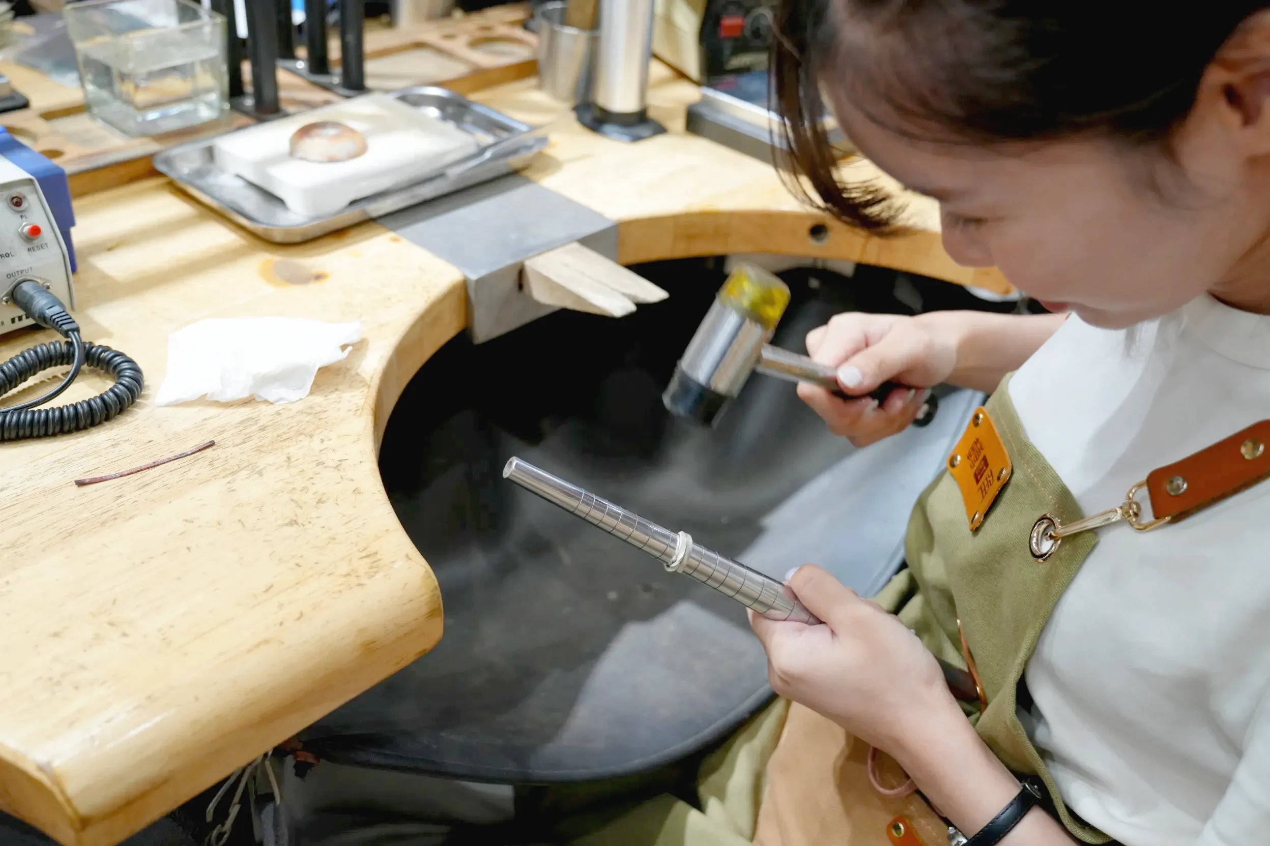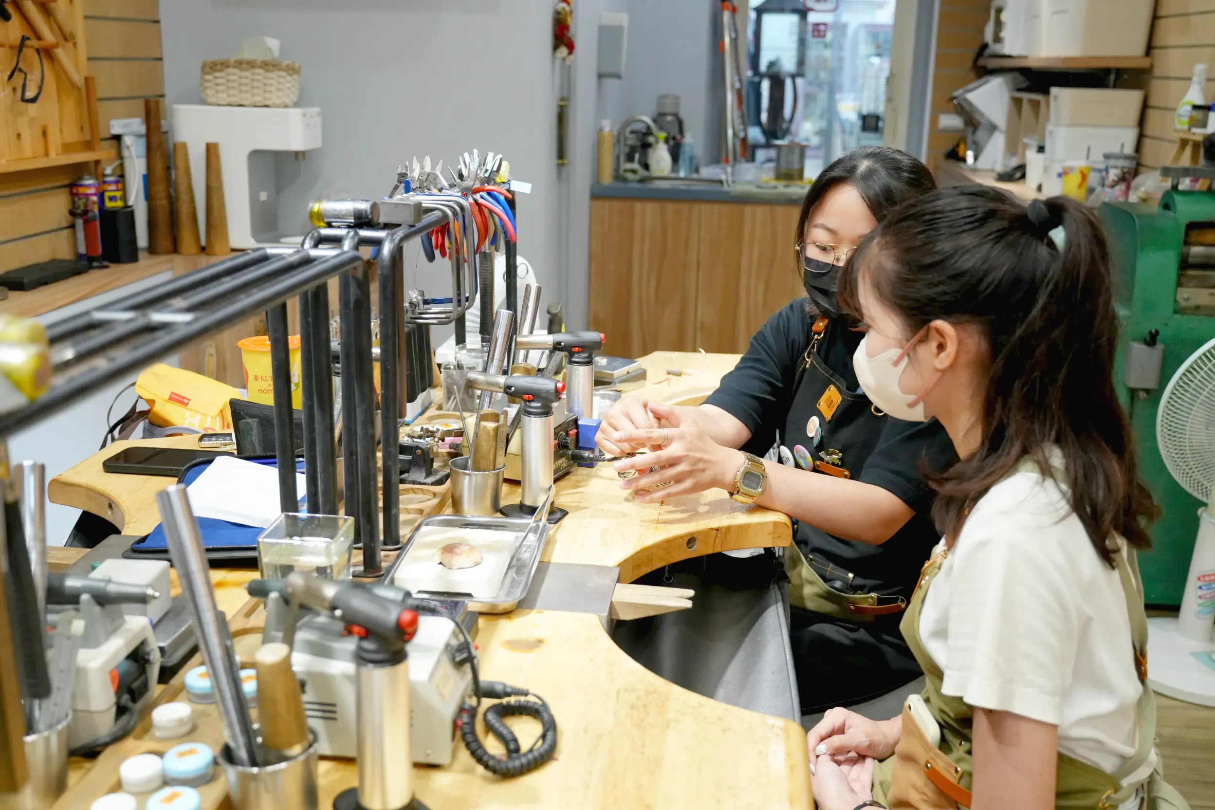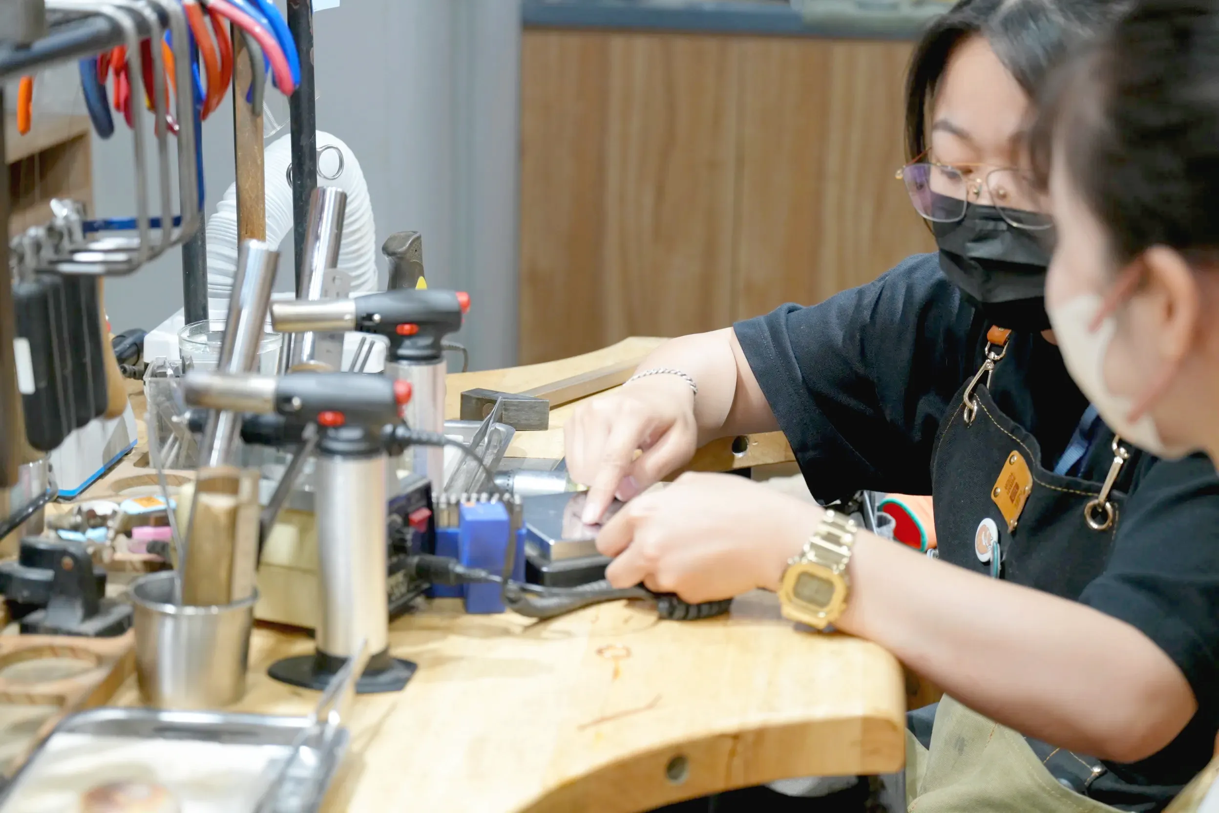 「轉角金工」的手作戒指課程,從頭到尾包含敲字、用噴火槍等製作流程都會讓學員實際操作,途中老師也會在一旁協助,整個課程下來非常有參與感和成就感~店家內的空間比較小,但是工作區都有明顯的位置劃分,所以在上課的時候並不會覺得擁擠,也很適合情侶、親子、好友一同來體驗製作對戒或是友誼戒指,是不用怕曬太陽又很療癒的完美行程選擇喔~