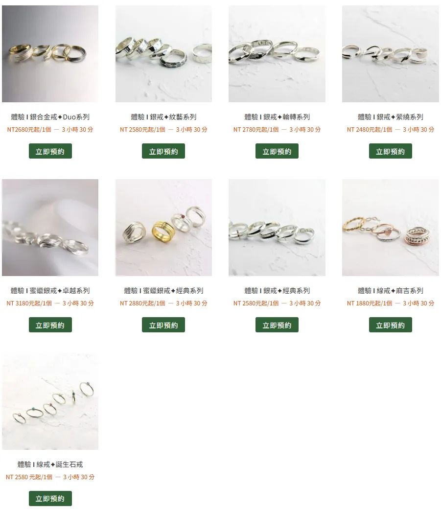 ▼「轉角金工」的戒指體驗課程價格介於1880元~3180元之間,除了有常見的925銀戒可以選擇以外,還有比較特別的蜜蠟銀戒課程喔!