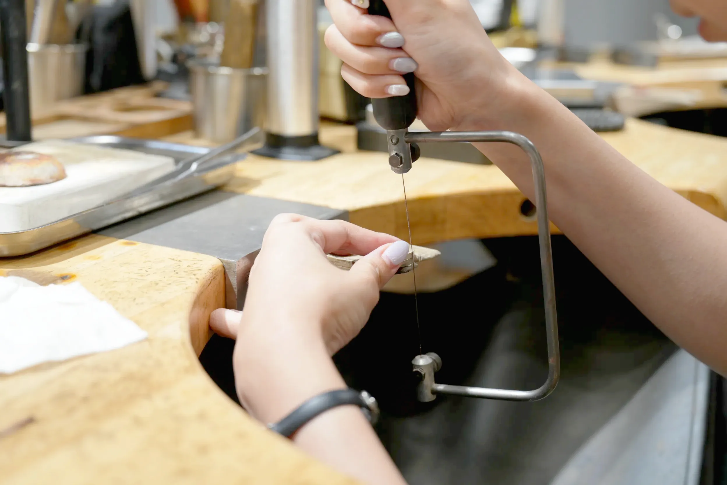 ▼完成後用線鋸割斷多餘的銀條,線鋸雖然看起來只有一條線,不過還是很銳利的,這邊要特別小心自己的手,也要花比較久時間有耐心的慢慢割。