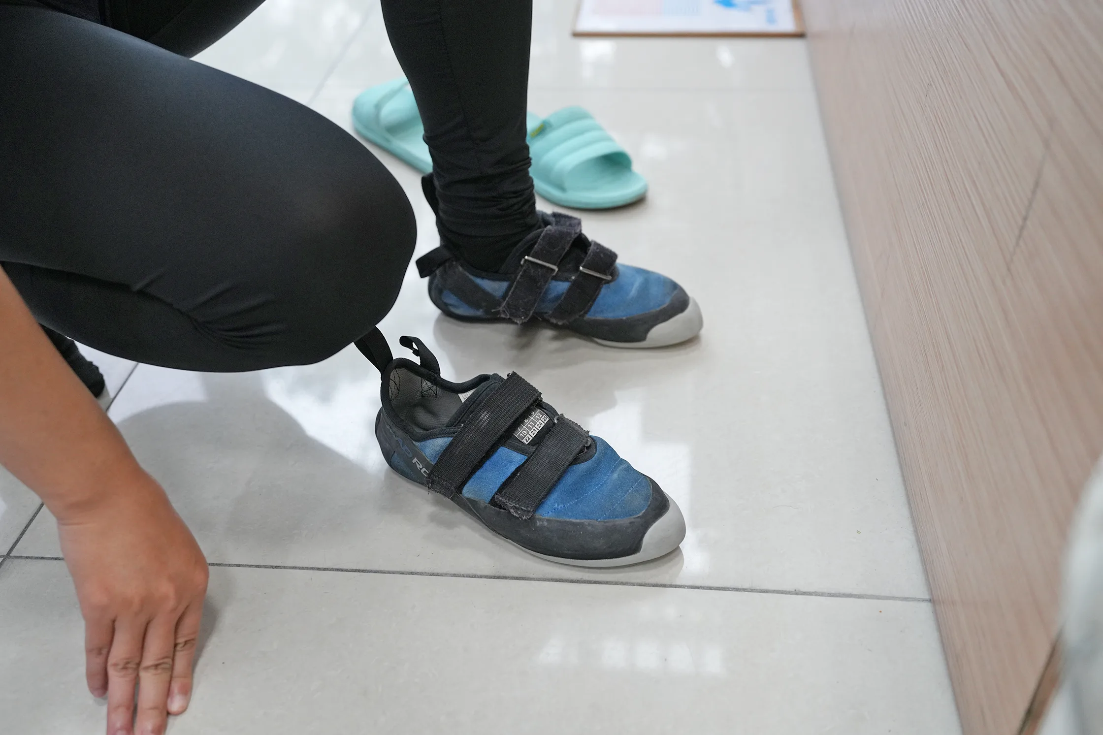▼在上場前,要先換攀岩專用鞋,有點意外攀岩鞋是要穿的比較緊、腳趾必須頂到鞋頭甚至像芭蕾舞鞋那樣的緊度才行。