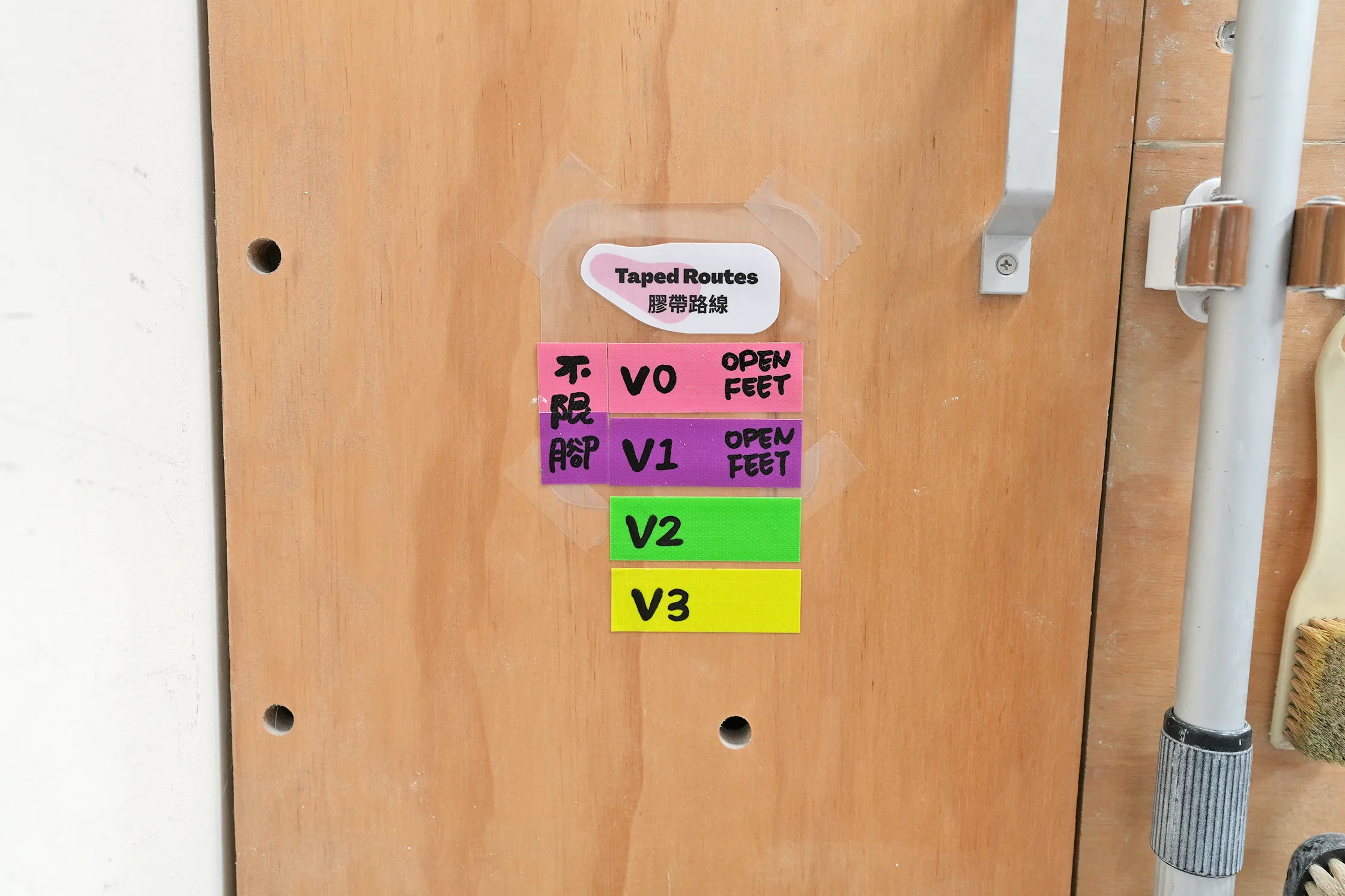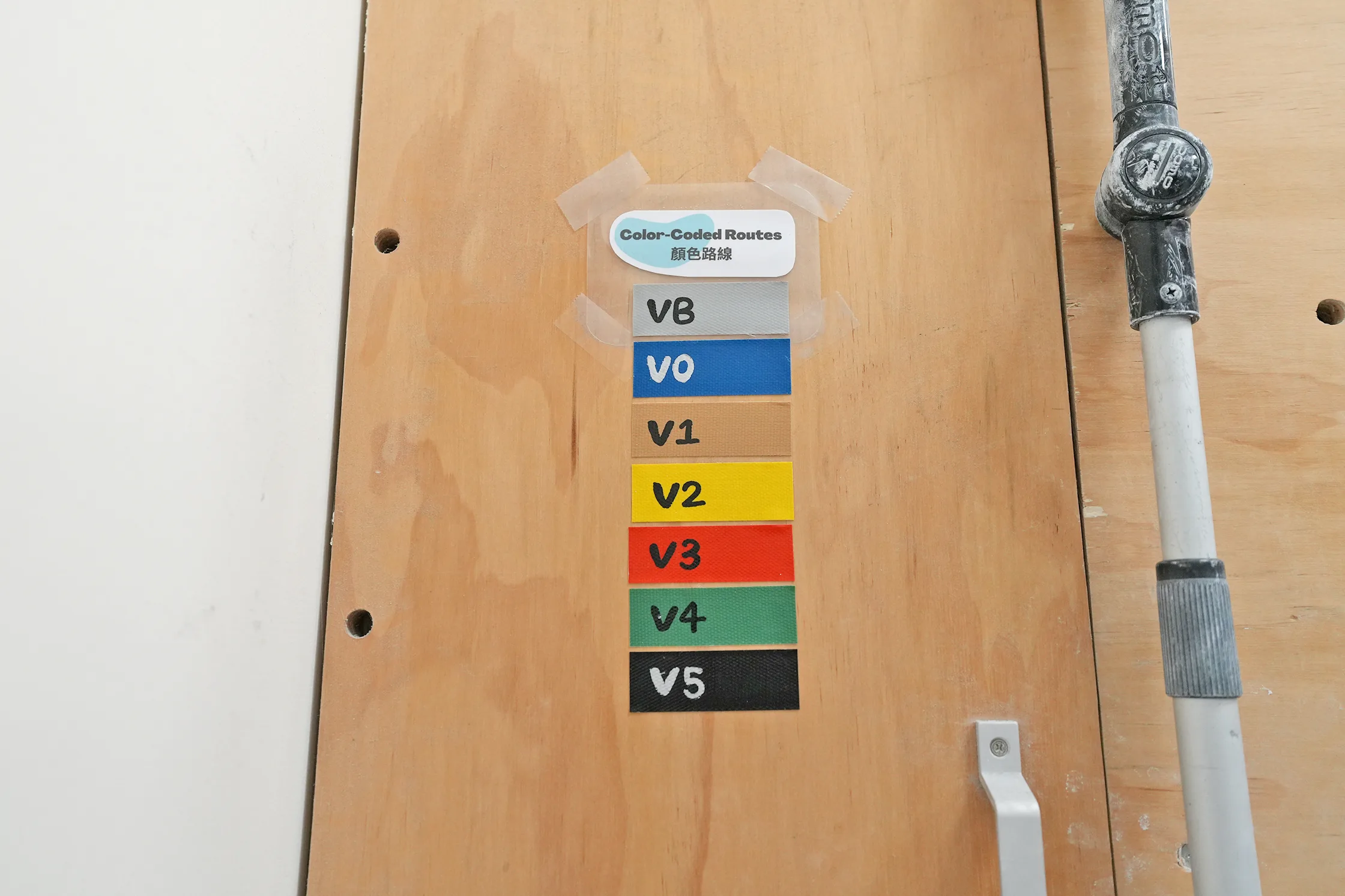 ▼教練會先介紹各種路線圖,通常體驗課主要是攀爬V0、V1不限腳的簡單路線;再來到進階一點的學員才會開始走較難的顏色路線。