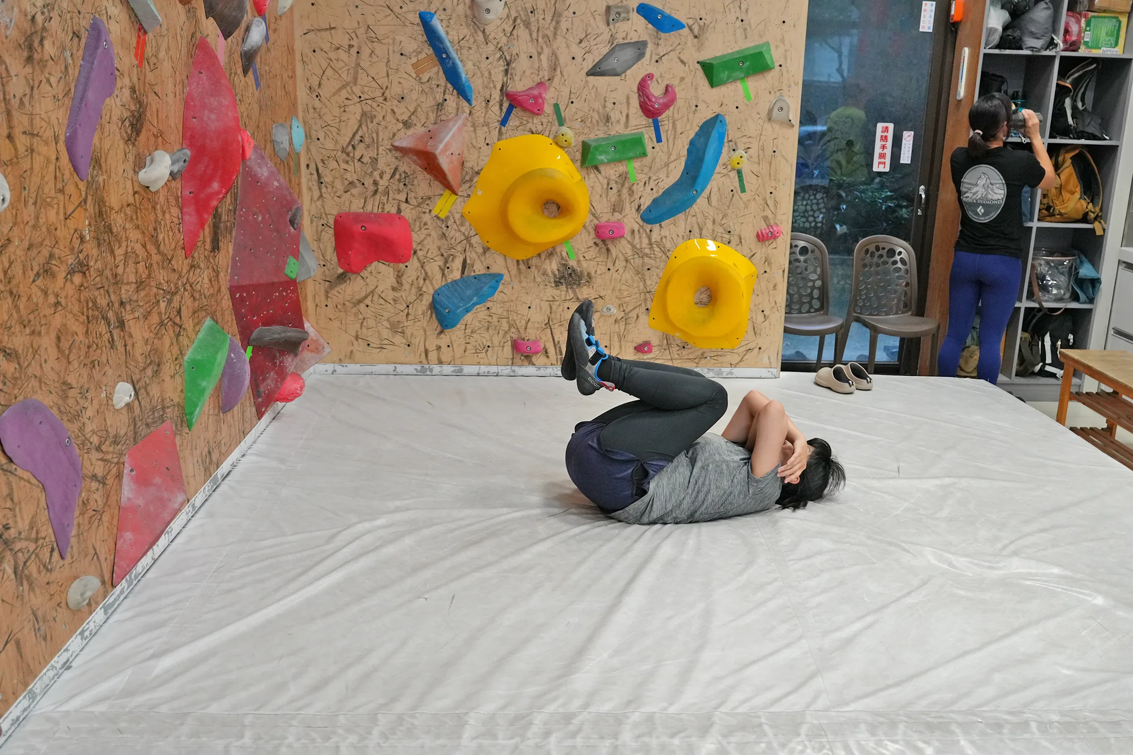 ▼實際演練絕對是必要的,稍微爬上牆有一些高度,再後倒練習安全跌落姿勢。