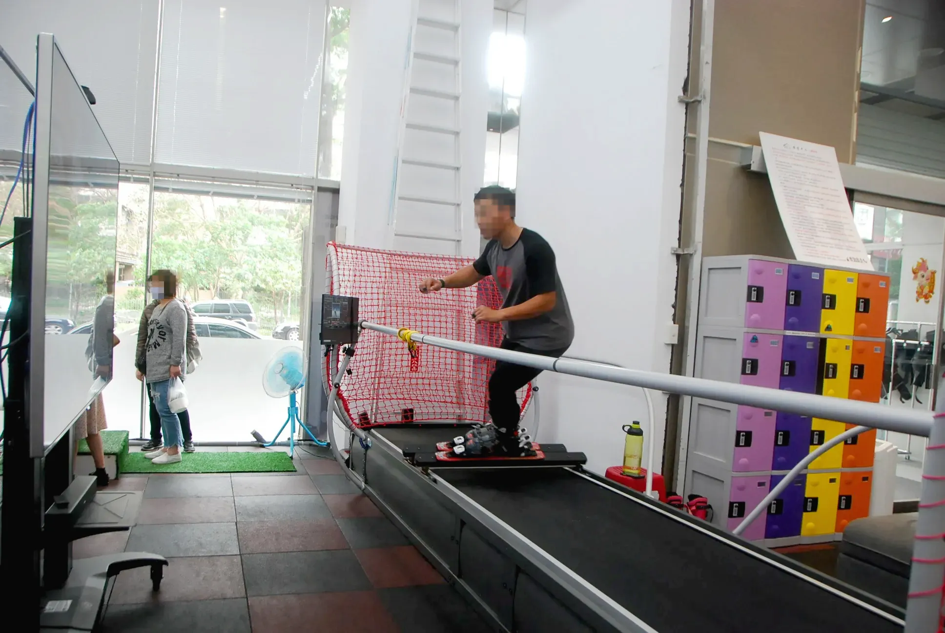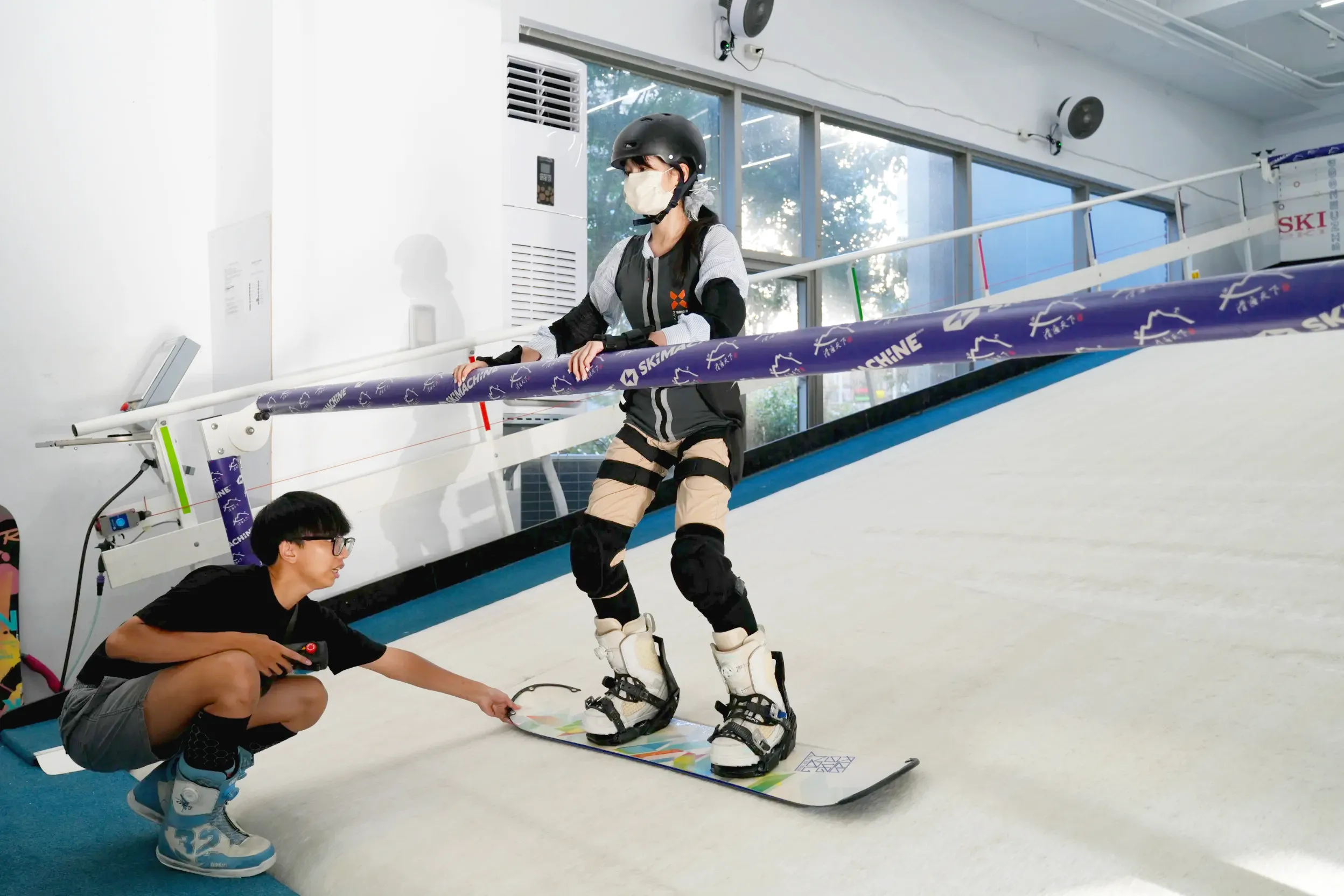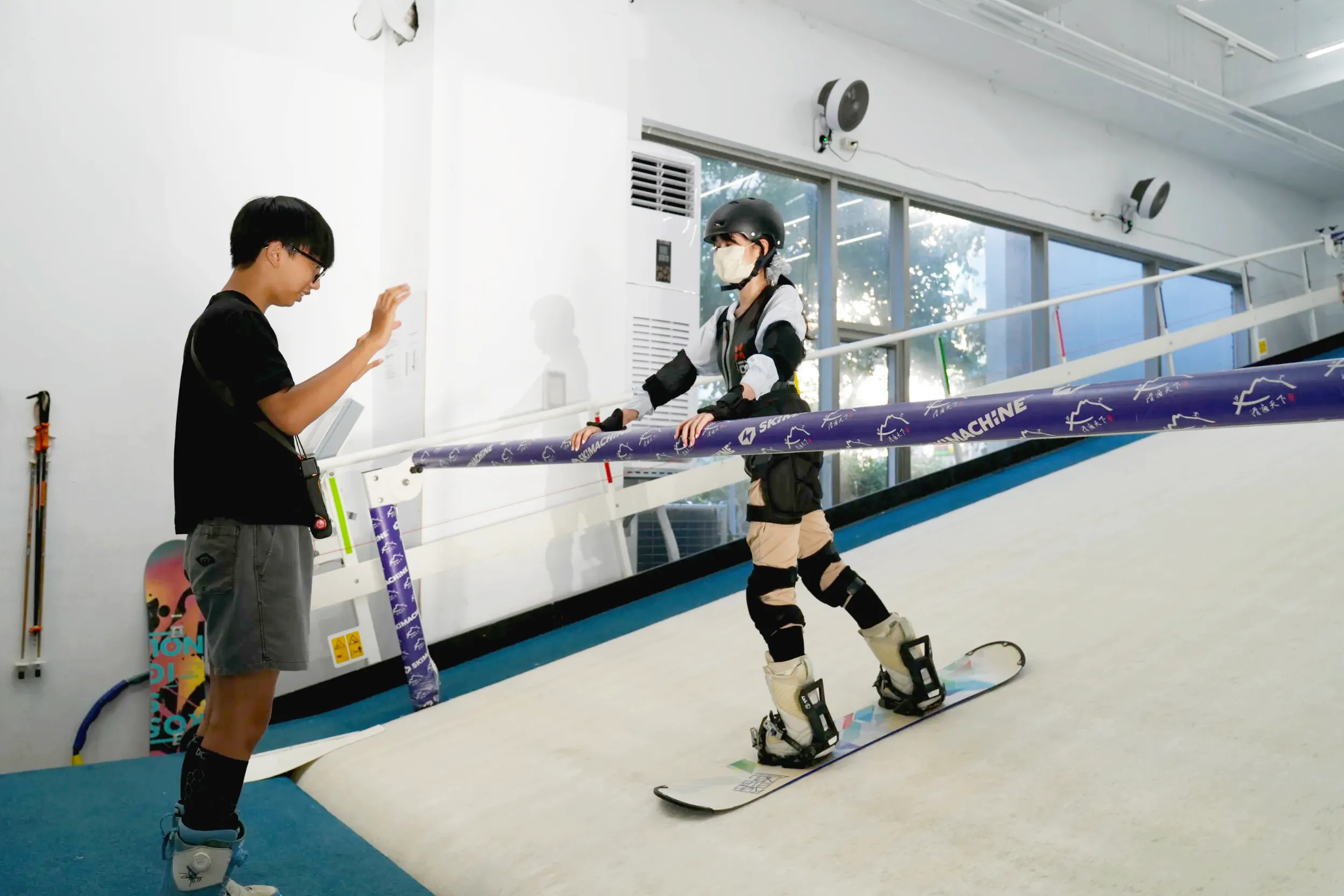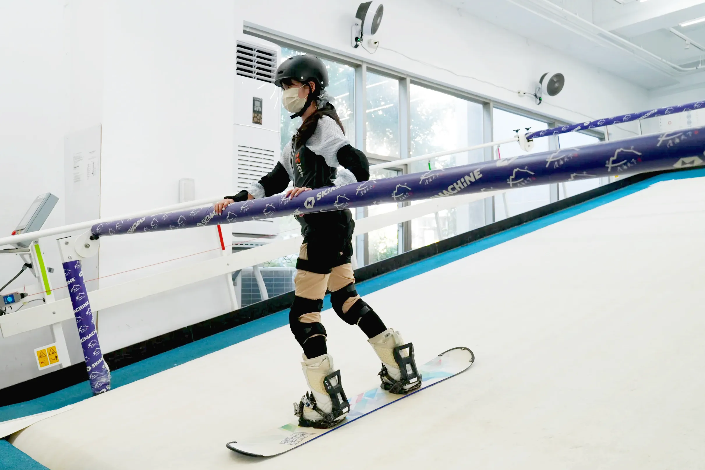 ▼「滑遍天下滑雪中心」的滑雪練習機前後都有用軟泡棉包覆的扶桿,一開始可以扶著練習,完全不用怕摔倒。
