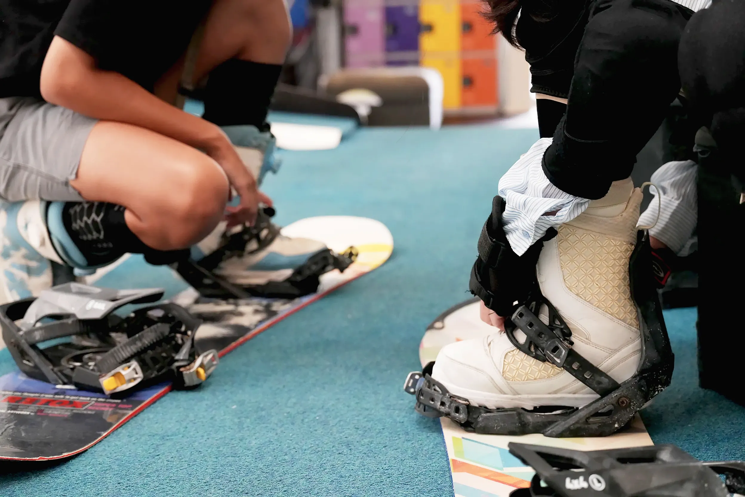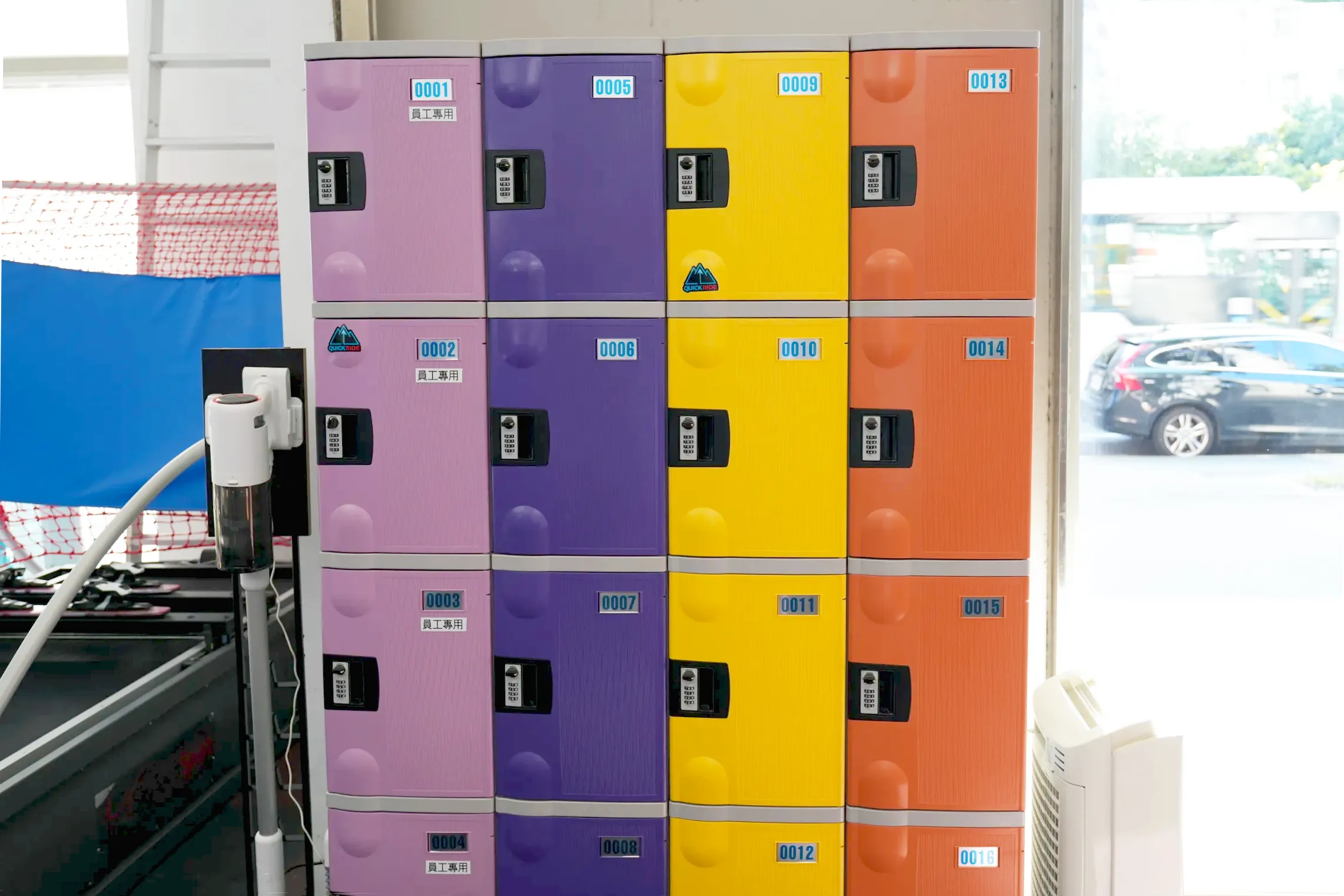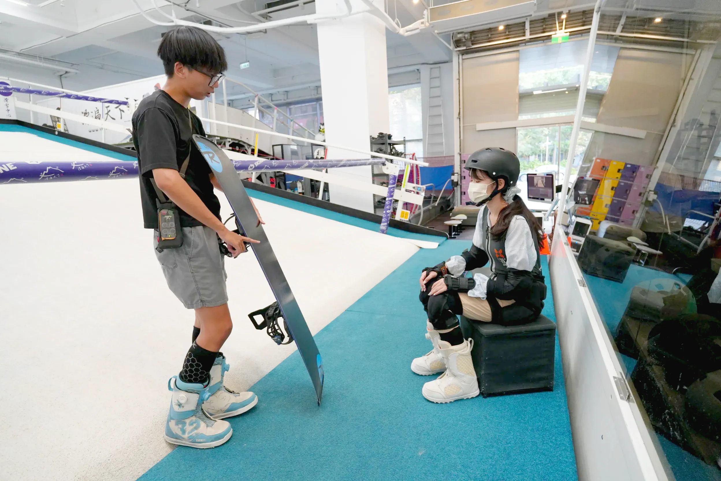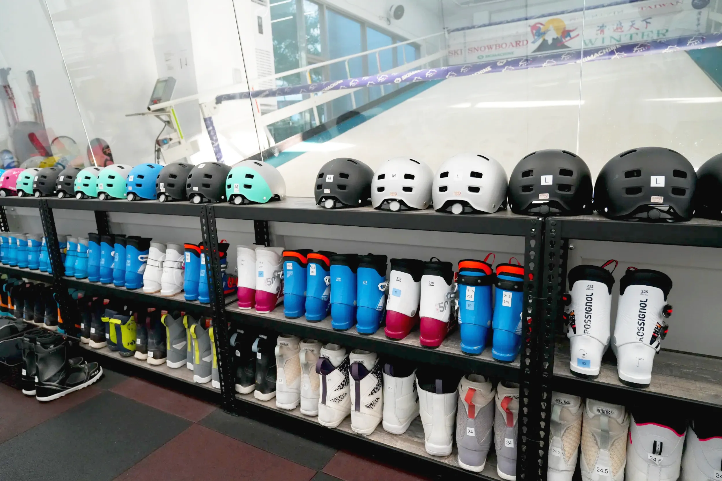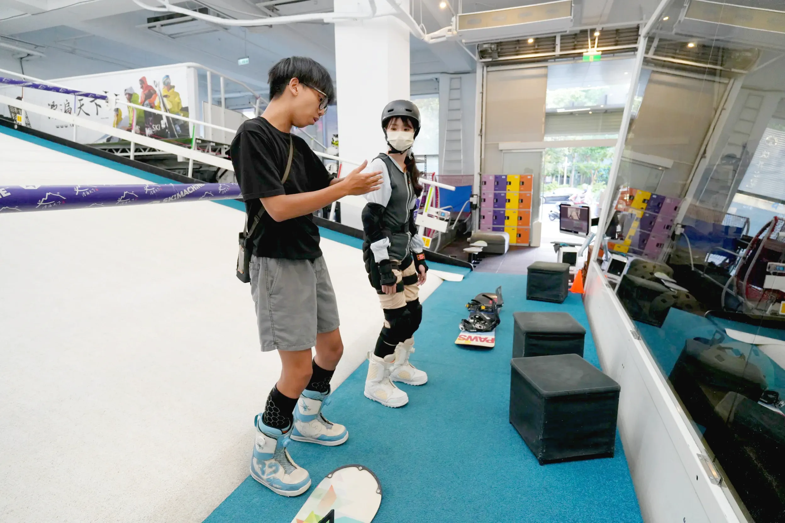 ▼店家有提供上課的學員置物櫃,可以放自己的包包、衣物等隨身物品,現場也有許多尺寸的雪鞋、安全帽,無論是大人還是小孩都可以輕鬆地來上課喔!