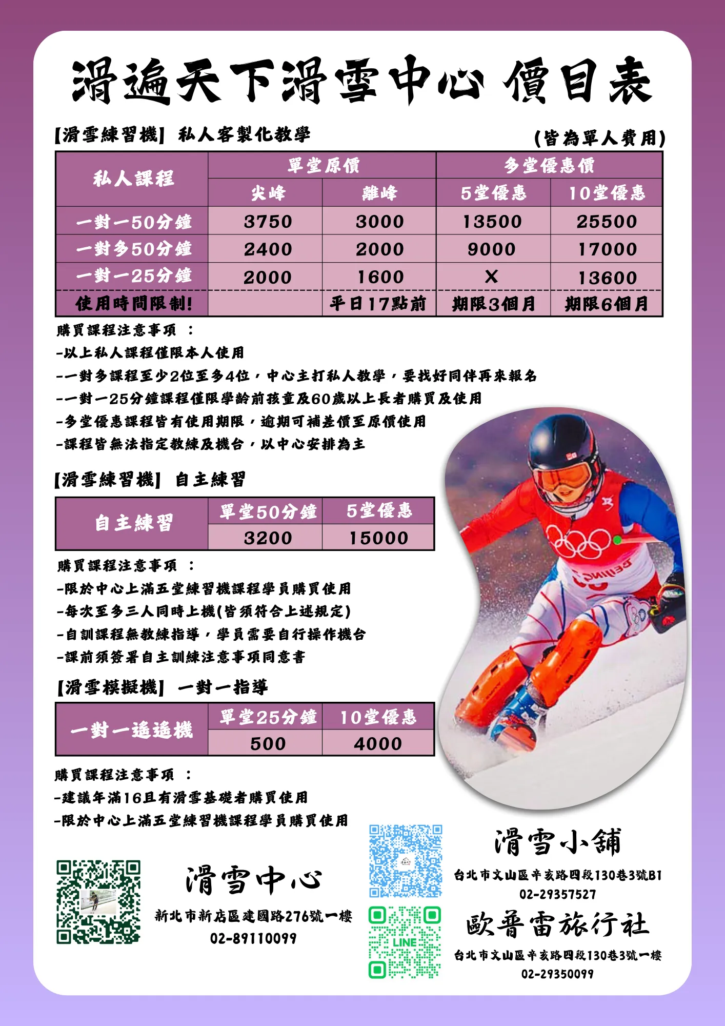▼「滑遍天下滑雪中心」的價目表有單堂和多堂優惠價,可以先來體驗單堂課後,再決定要不要報名多堂繼續學習~滑雪練習機的價格介於1600~3750元之間,模擬機(搖搖寶)的價格是一對一單堂25分鐘500元。