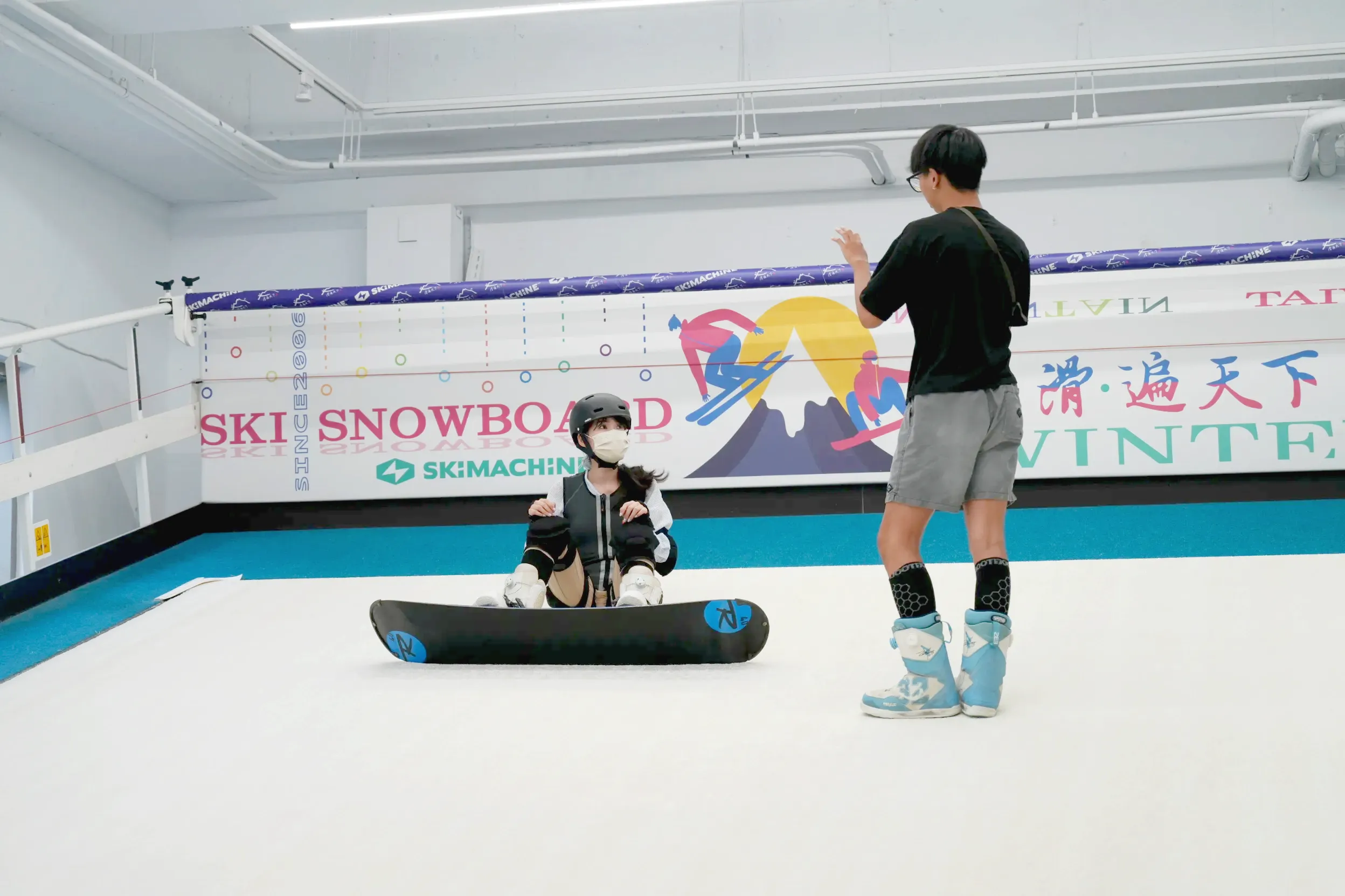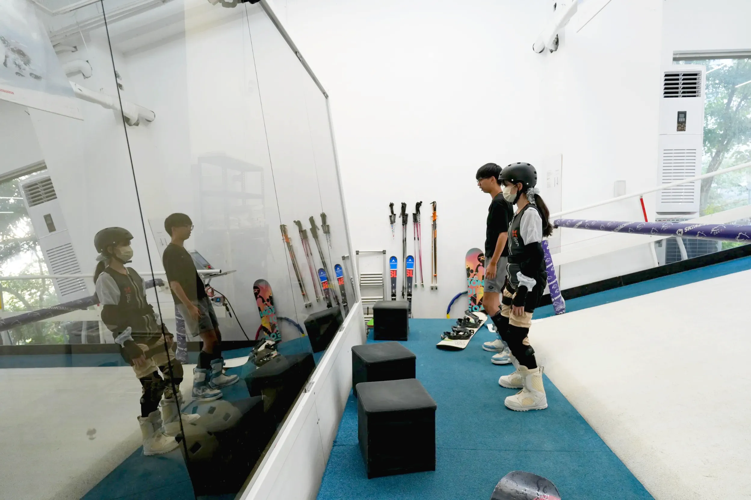▼「滑遍天下滑雪中心」上課都是採包機台制,預約的時段機台上只會有一組學員,分為一對一和一對多課程,一對多最多可以4個人一起上課,不過要自己找一起上課的朋友,至少要兩個人才能報名喔!