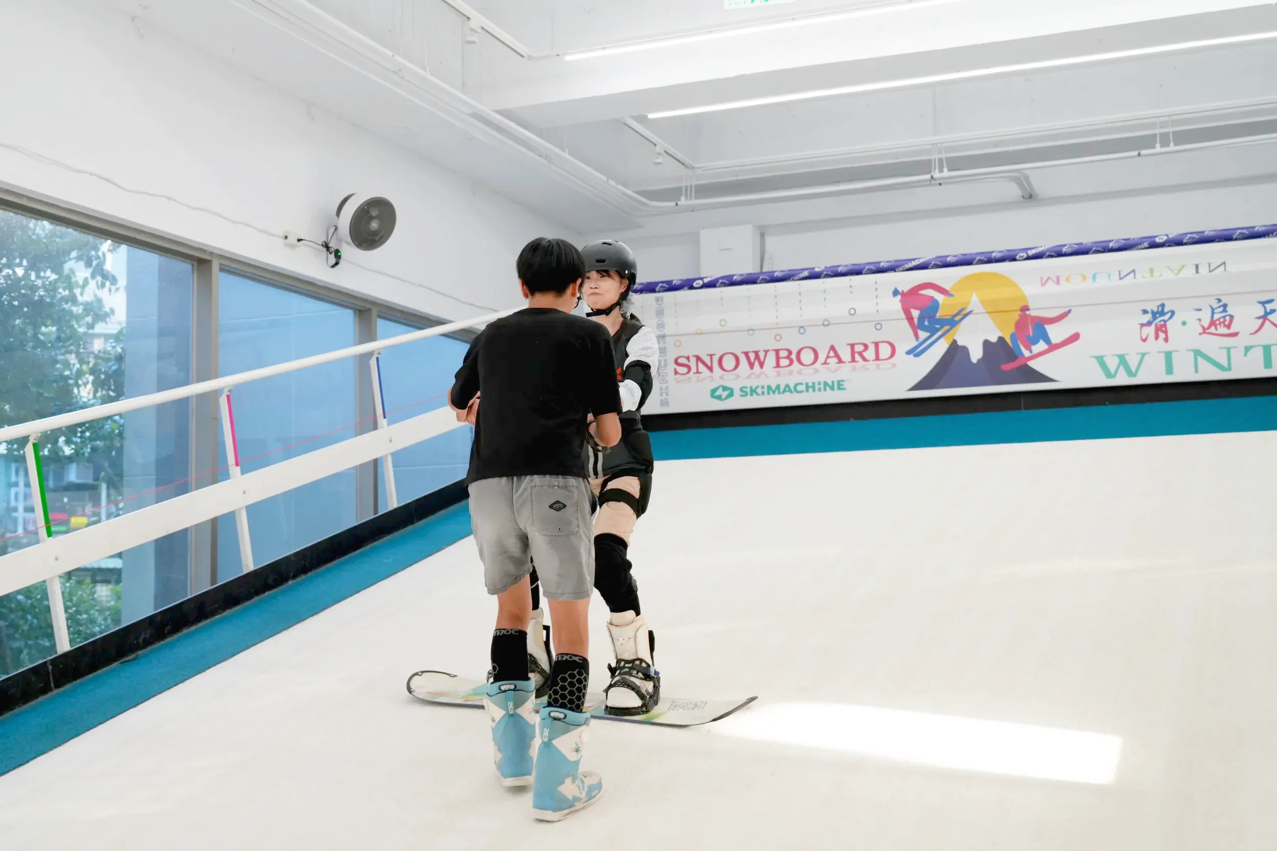▼再來會回到下面,練習如何從直向轉向橫向,這個部分我自己覺得比較難掌握,除了要維持平衡以外,還要控制單板的鋼邊煞車避免被輸送帶帶走,時間和體力上都比較消耗一點~