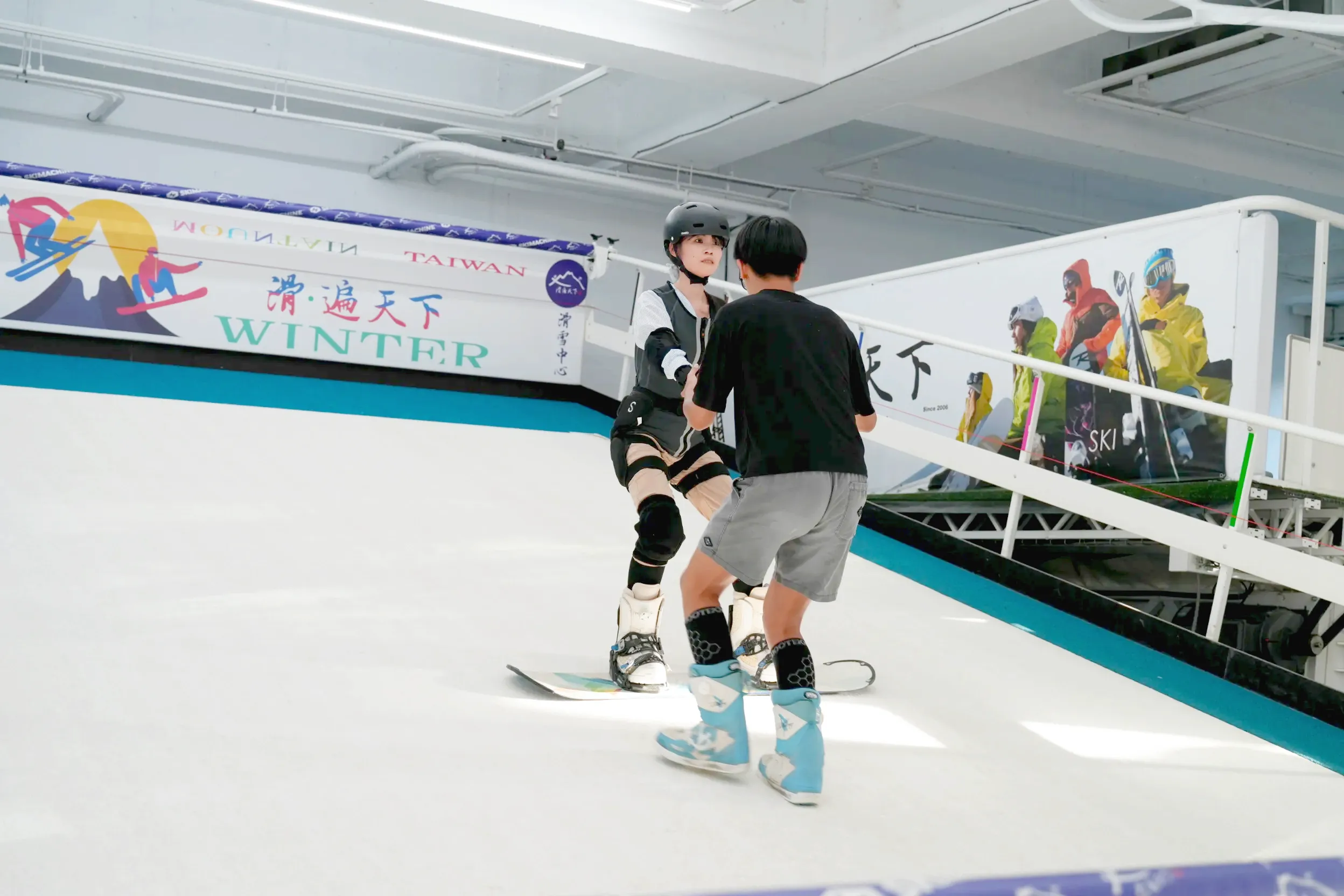 「滑遍天下滑雪中心」只要預約到機台,該時段就完全是你的天下XD不用擔心跟陌生人互撞,或是要共享同一個教練,對於什麼都不熟悉的新手來說非常的友善!這次是我人生初次的滑雪課程體驗,課程中除了學習穿設備以外,也會在教導動作的時候,同時介紹許多滑雪的術語,教練說這樣子等到去國外的雪場時,也可以比較聽的懂當地教練的教學,非常的貼心~