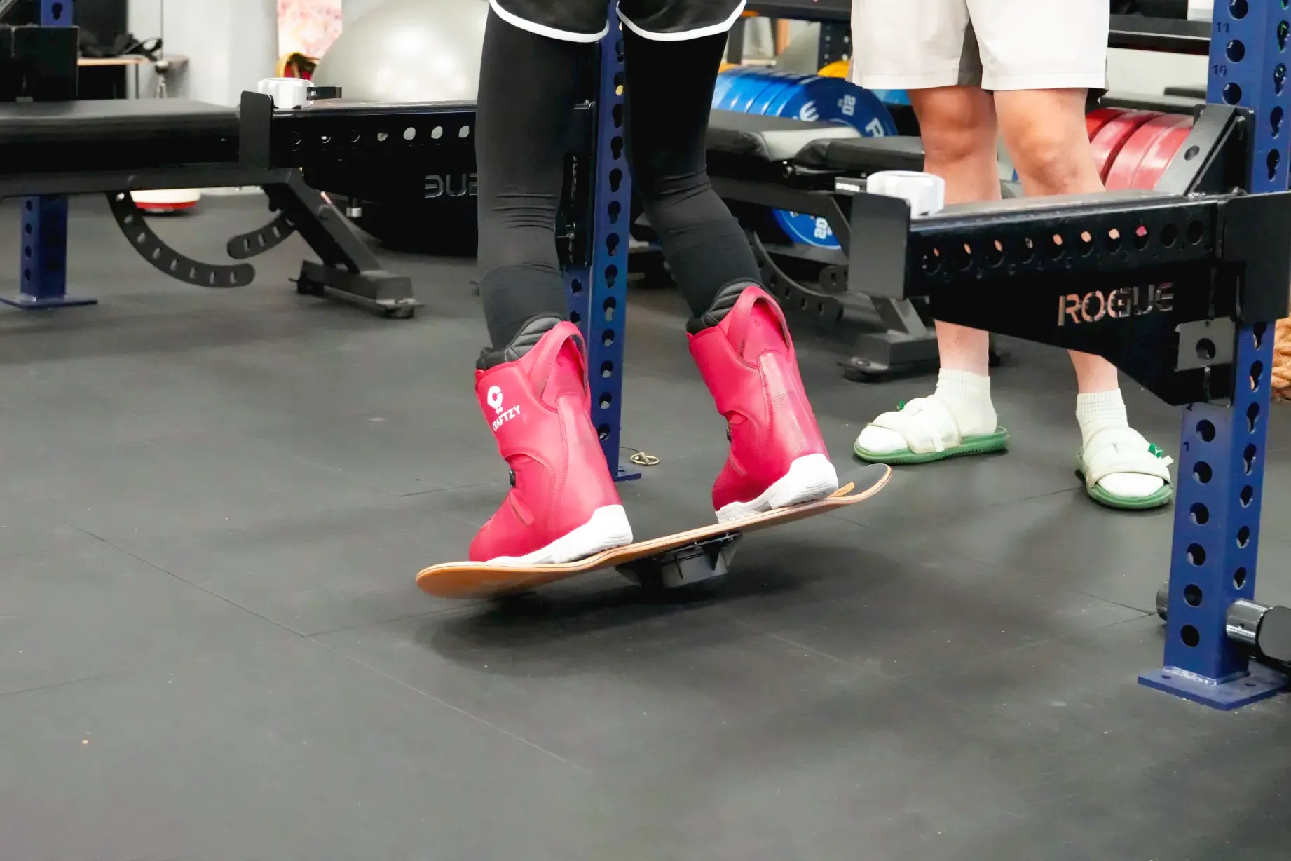 ▼由於我是新手,所以正式上模擬機前,會先使用旁邊的平衡板練習,教練也會先幫忙確認一下姿勢是否正確,讓我在上機前先暖個身。