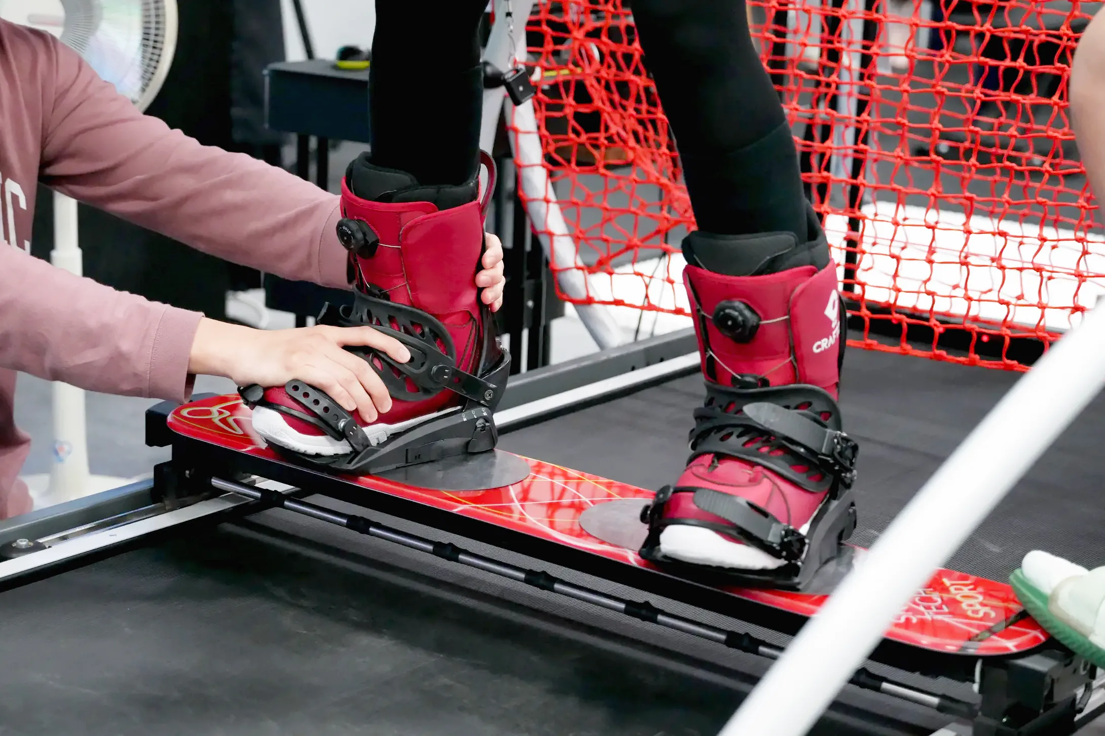▼接下來就是正式上機啦!「滑雪模擬機」雙板和單板都可以練習,我這次選擇的是單板,一開始教練會幫忙協助站上板子,跟雪地和有坡度的室內滑雪機不一樣,不用自己很艱難的爬起來,也不容易跌倒!