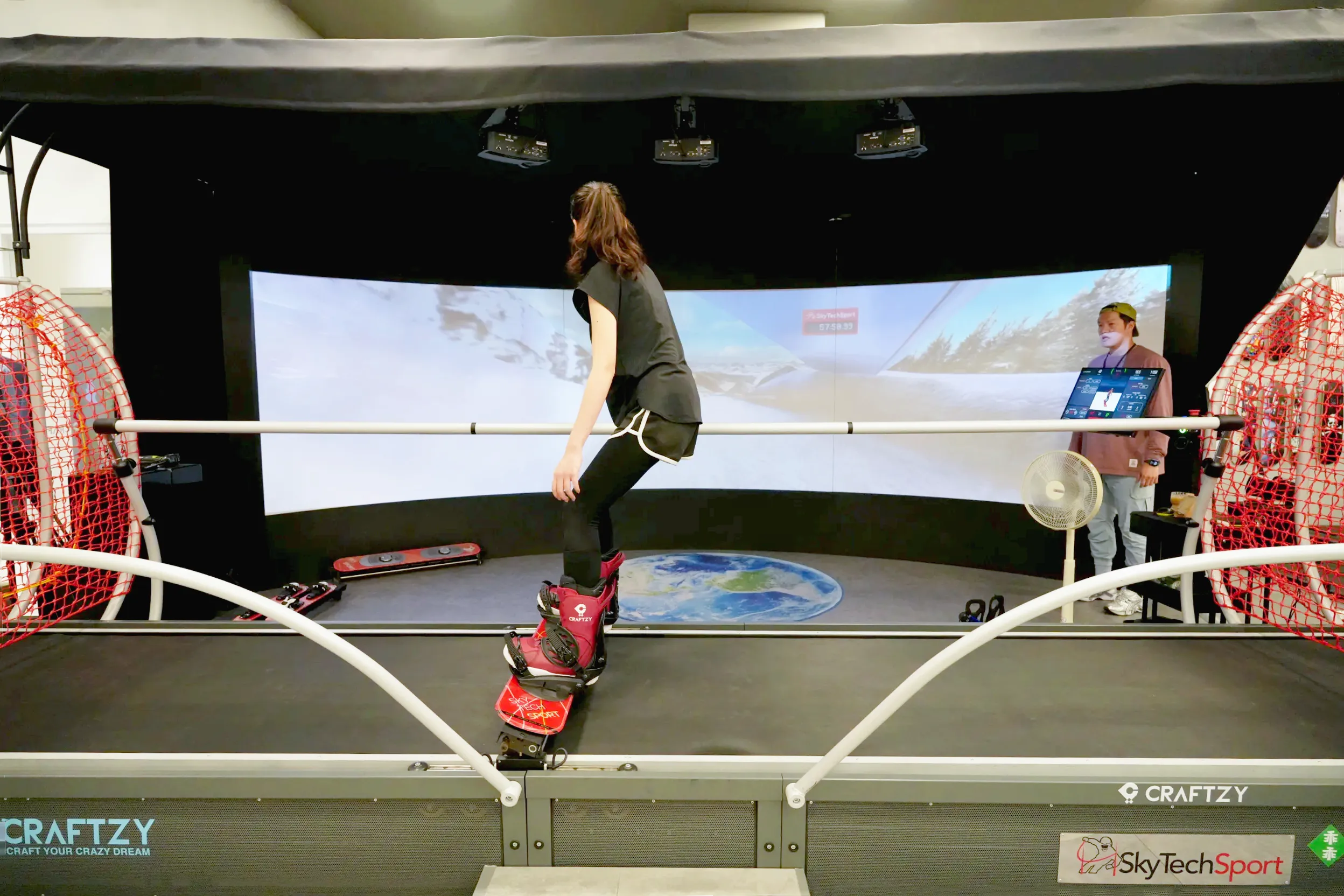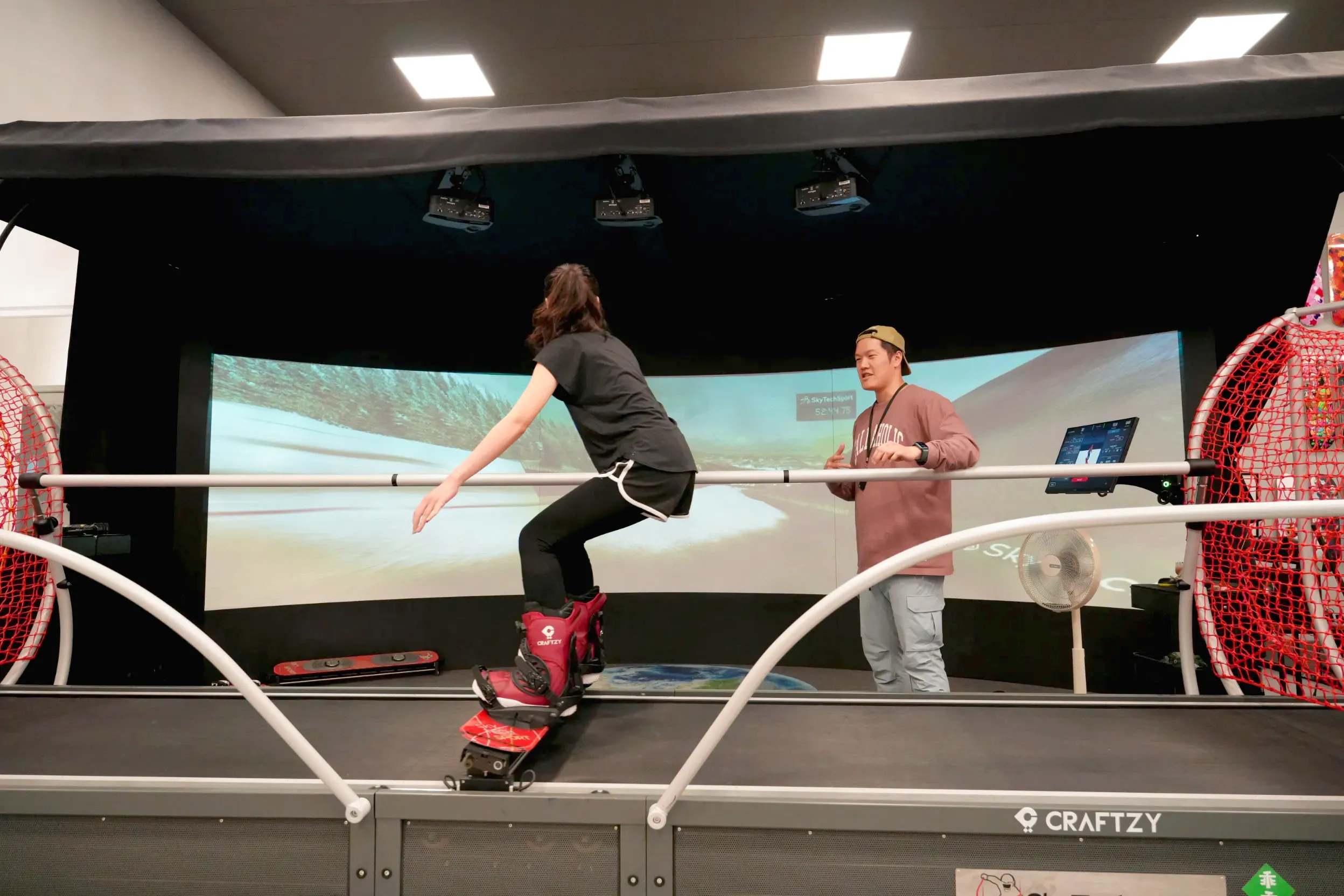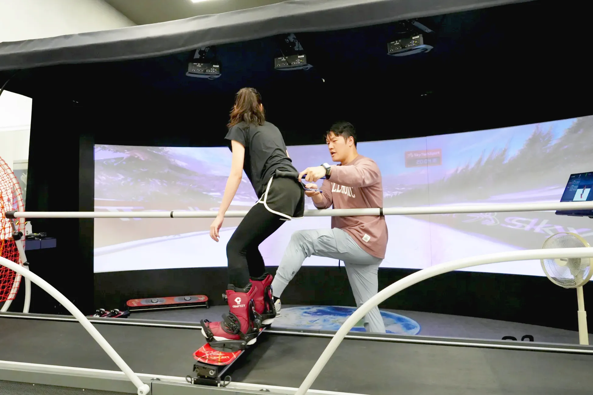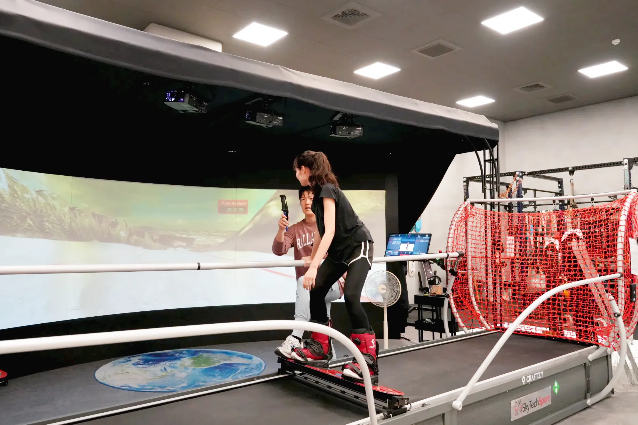 ▼模擬機配備7.3米曲面螢幕,練習的時候真的很有沉浸感,而且模擬機還可以調整不同雪況的感覺,教練就有讓我試試看雪道上有比較多小石子的模擬場地,滑起來的感覺真的不一樣,會比較凹凸不平,就可以訓練平衡的穩定。