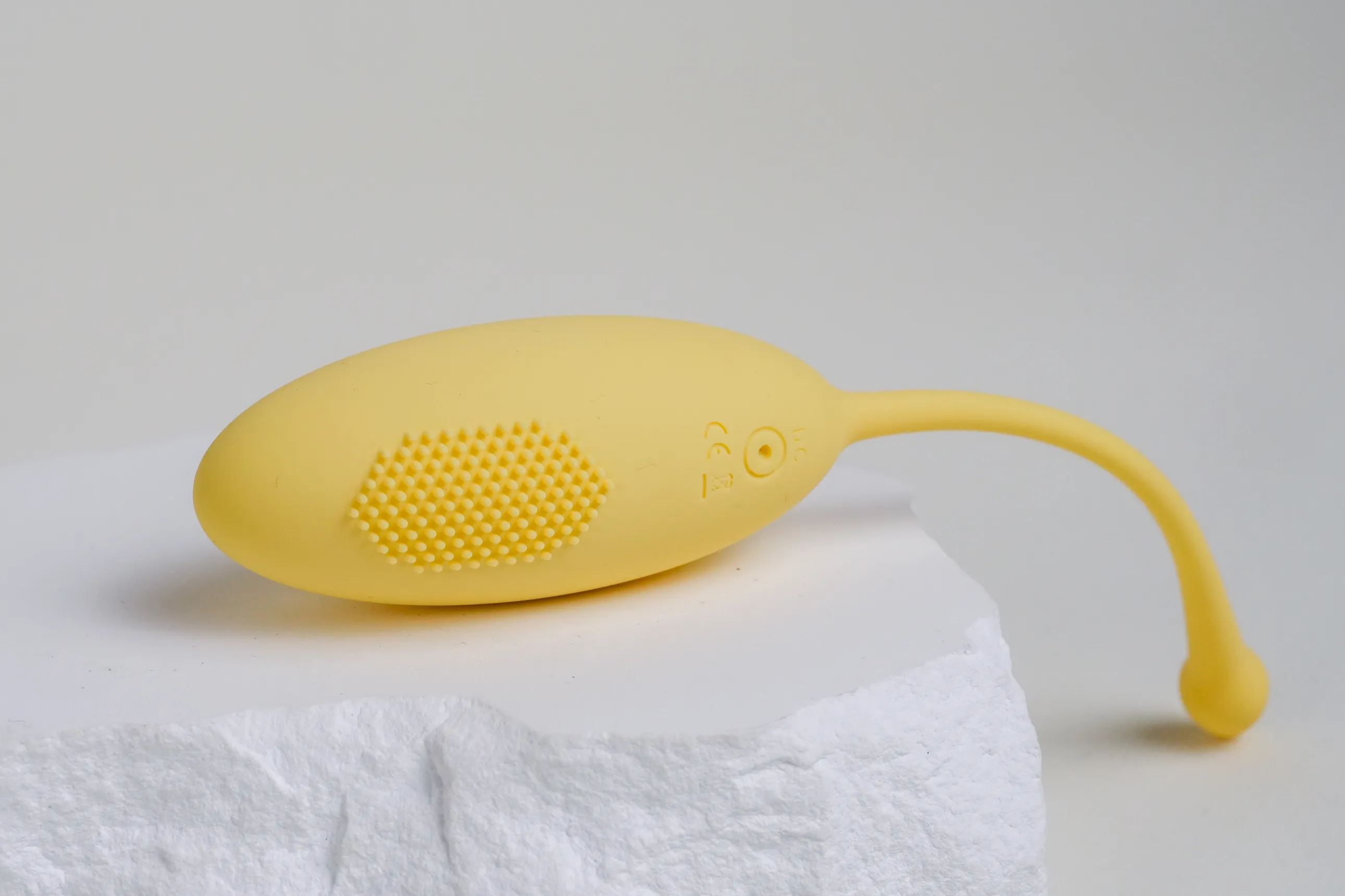 ▼「雷神跳蛋」擁有可愛的小雞黃色,主機整體採用食品級矽膠包覆,防水表現也相當不錯。細長的機身設計,搭配長長的尾巴,不容易帶來撐開的不適感,表面局部設計成細小顆粒的毛刷造型,用來加強接觸時的刺激,非常適合新手入門。