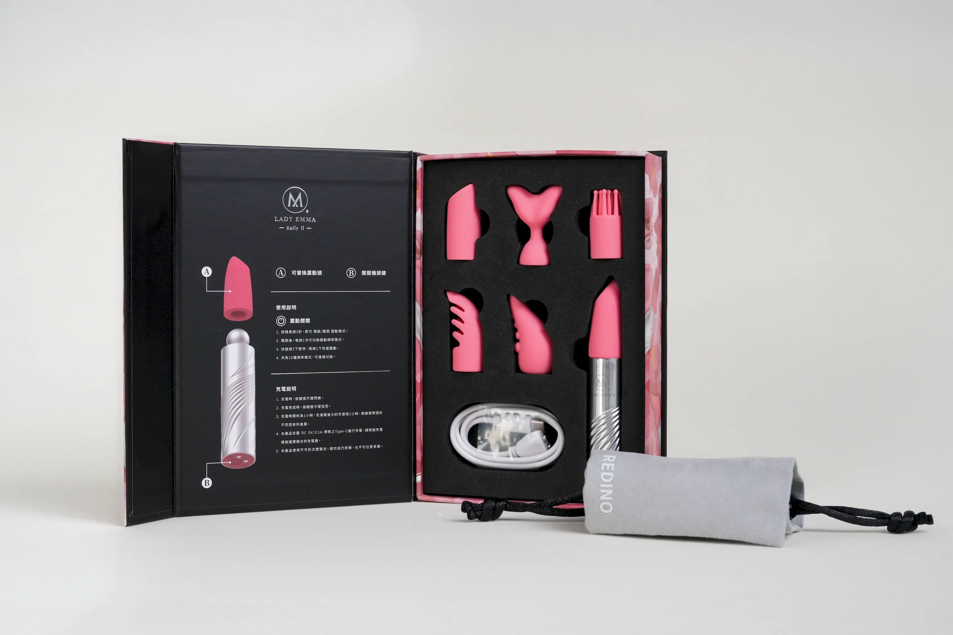 - 產品內容:震動主機 x 1、替換頭 x 6、說明卡 x 1、Type C充電線 x 1、收納袋 x 1