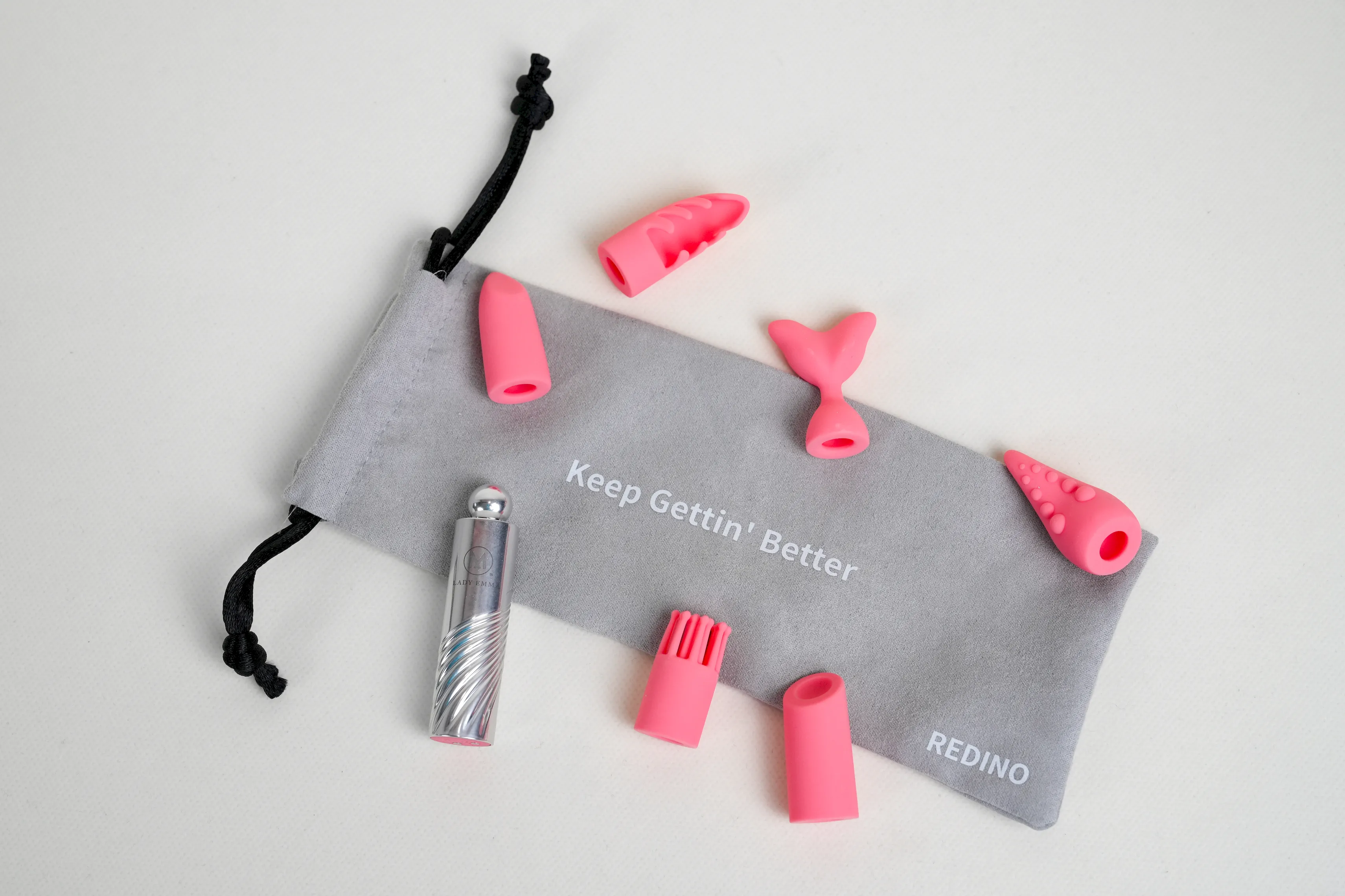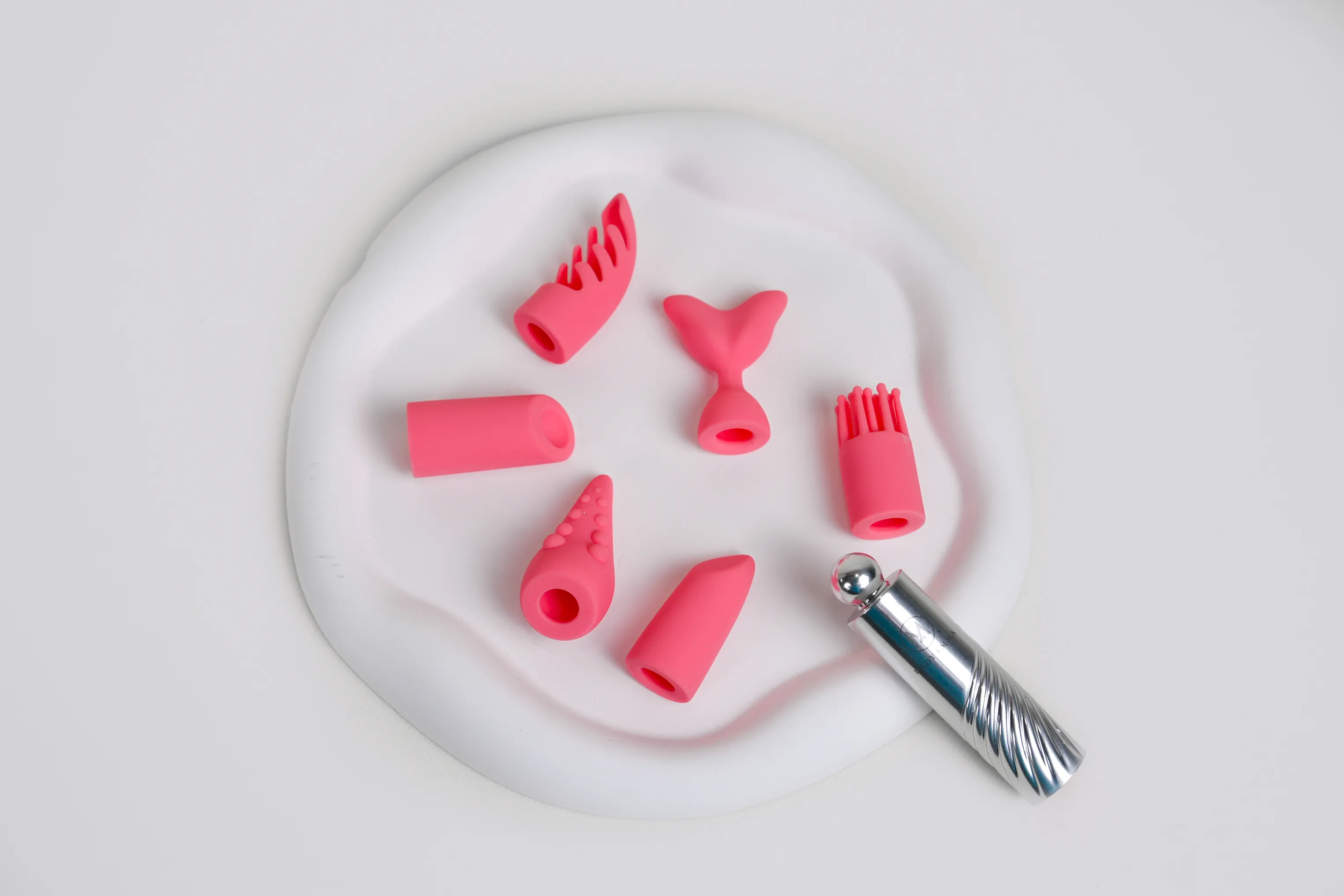 ▼「 凱莉口紅」第二代是一款不能遙控,也不能放入體內的產品,內附6種可替換的套頭皆採用食品級矽膠製成,包含口紅經典款、口紅EX款、魚尾型、珊瑚型、海草型與觸手型,可依照不同喜好自由替換使用,可玩性很高,私心還很喜歡替換時發出的啵啵聲音。