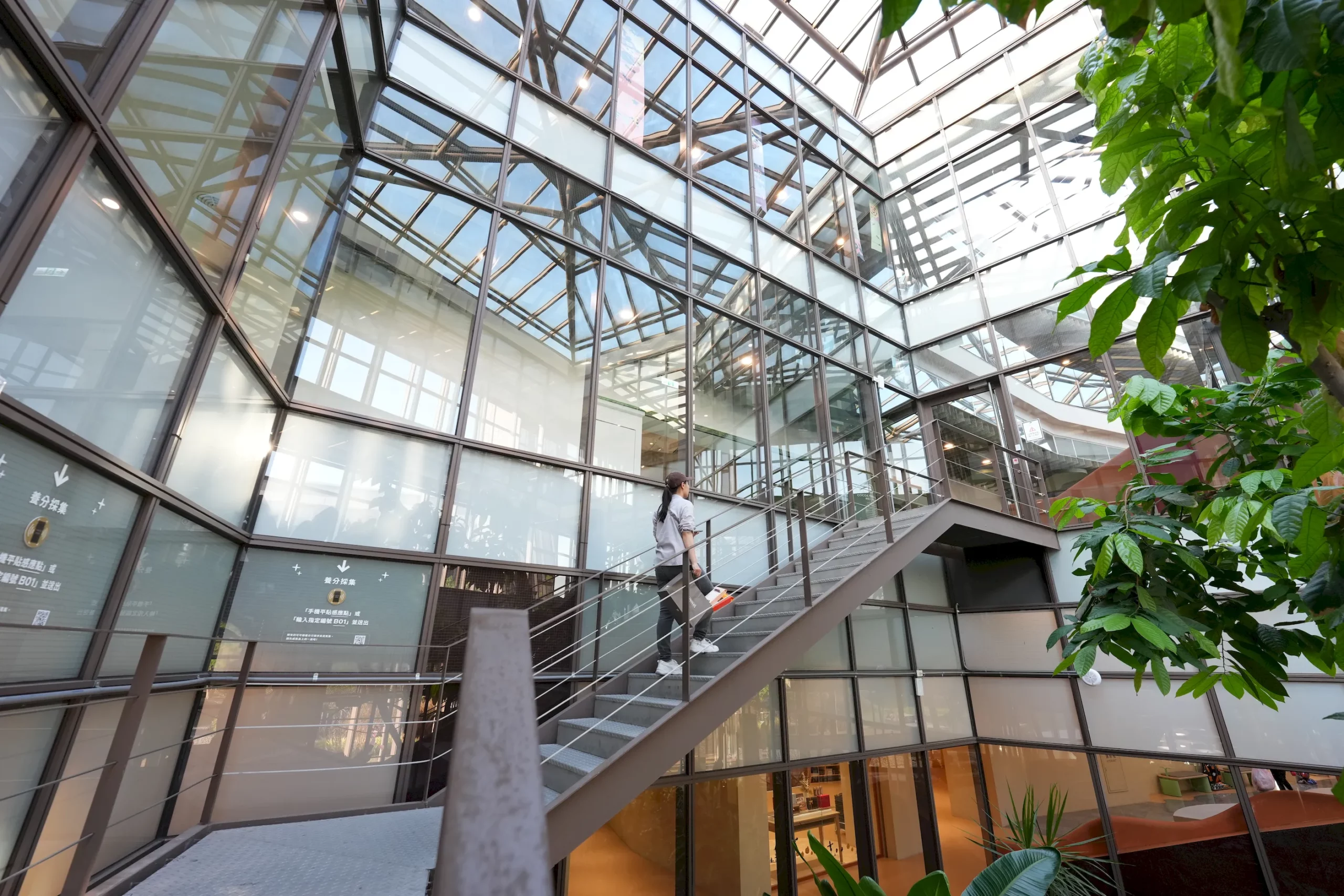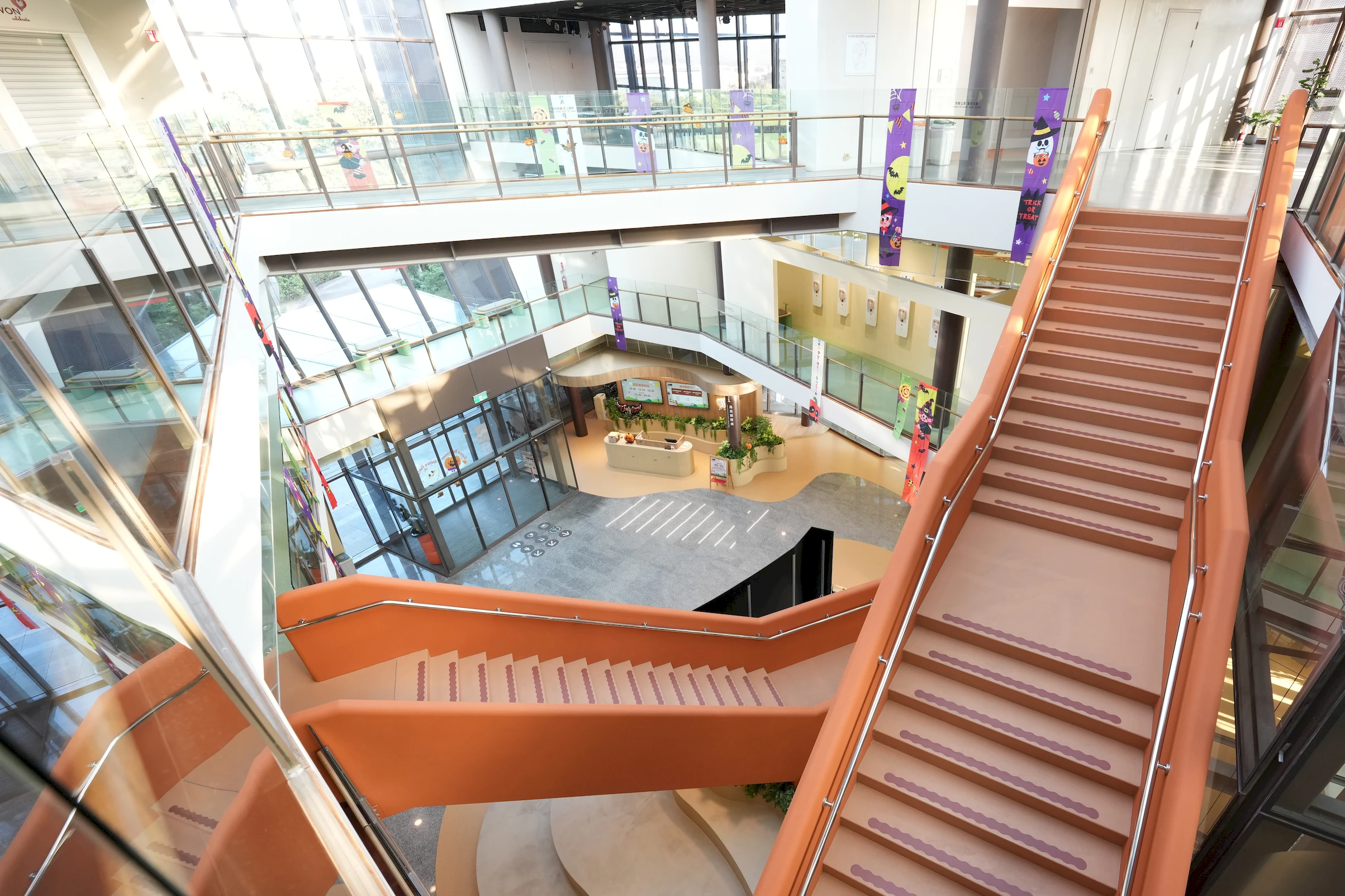▼一踏入室內,迎面而來的是明亮通透的空間,其中鮮明的橘紅階梯蜿蜒而上,連接著各個樓層,整體非常有設計感且充滿特色。