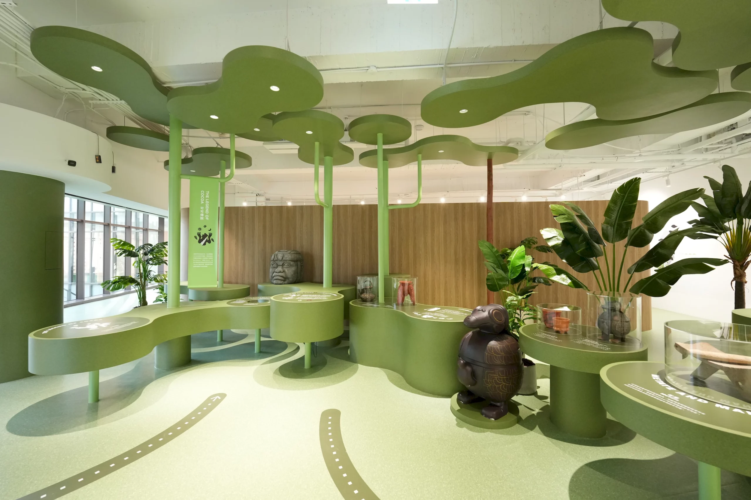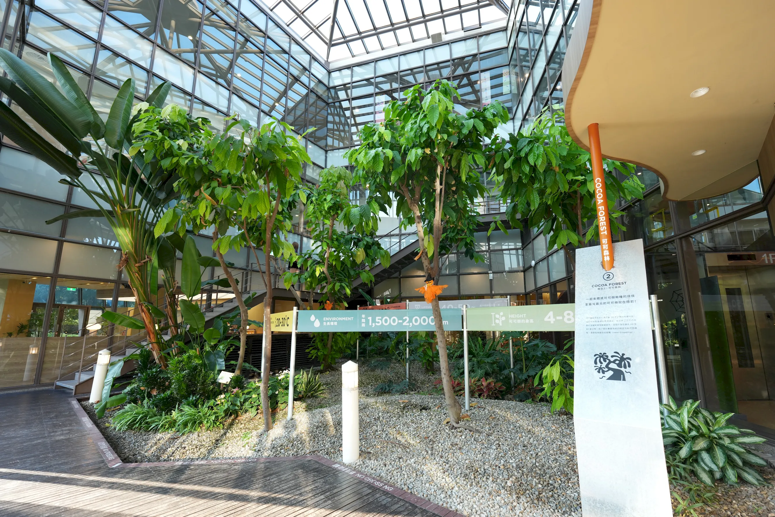 ▼從「登島口」進入後,便可以看見壯觀的可可樹景致,這個展區的設計主要是希望讓遊客體驗全臺灣最北的可可樹栽種環境,同時了解可可樹適合的生長溫度、降雨量等相關知識,此區同樣也設有遊戲代碼,遊客輸入完成任務後,就能沿著一旁的樓梯前往二樓展區。