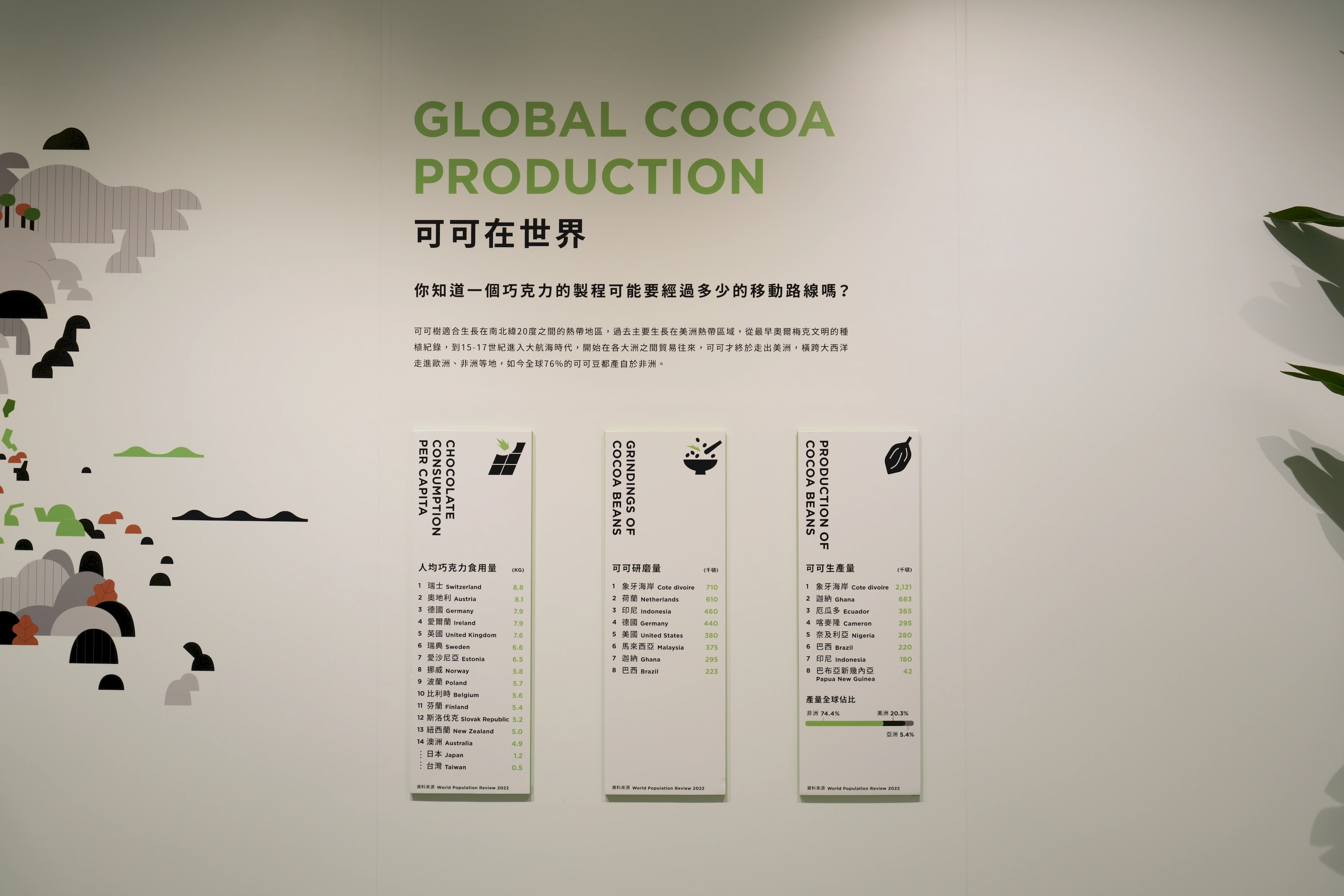 ▼再往前走,可以看到更多可可相關的小知識,例如世界各國的可可生產量與研磨量排行,以及人均巧克力食用量的排名,還有以圖像的方式呈現世界前五大可可種植生產國、世界前三大愛吃巧克力的國家等,整個展出非常有趣。