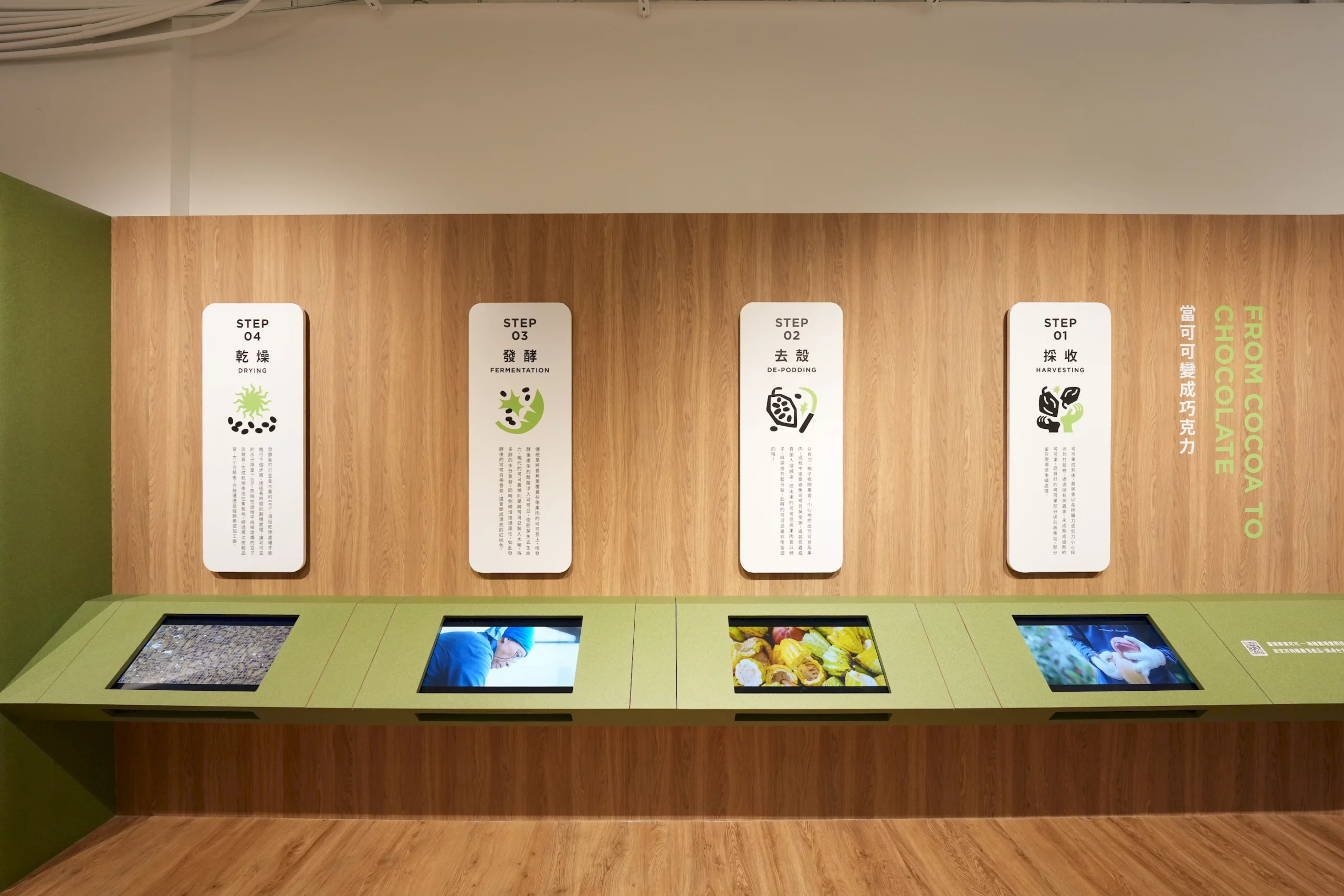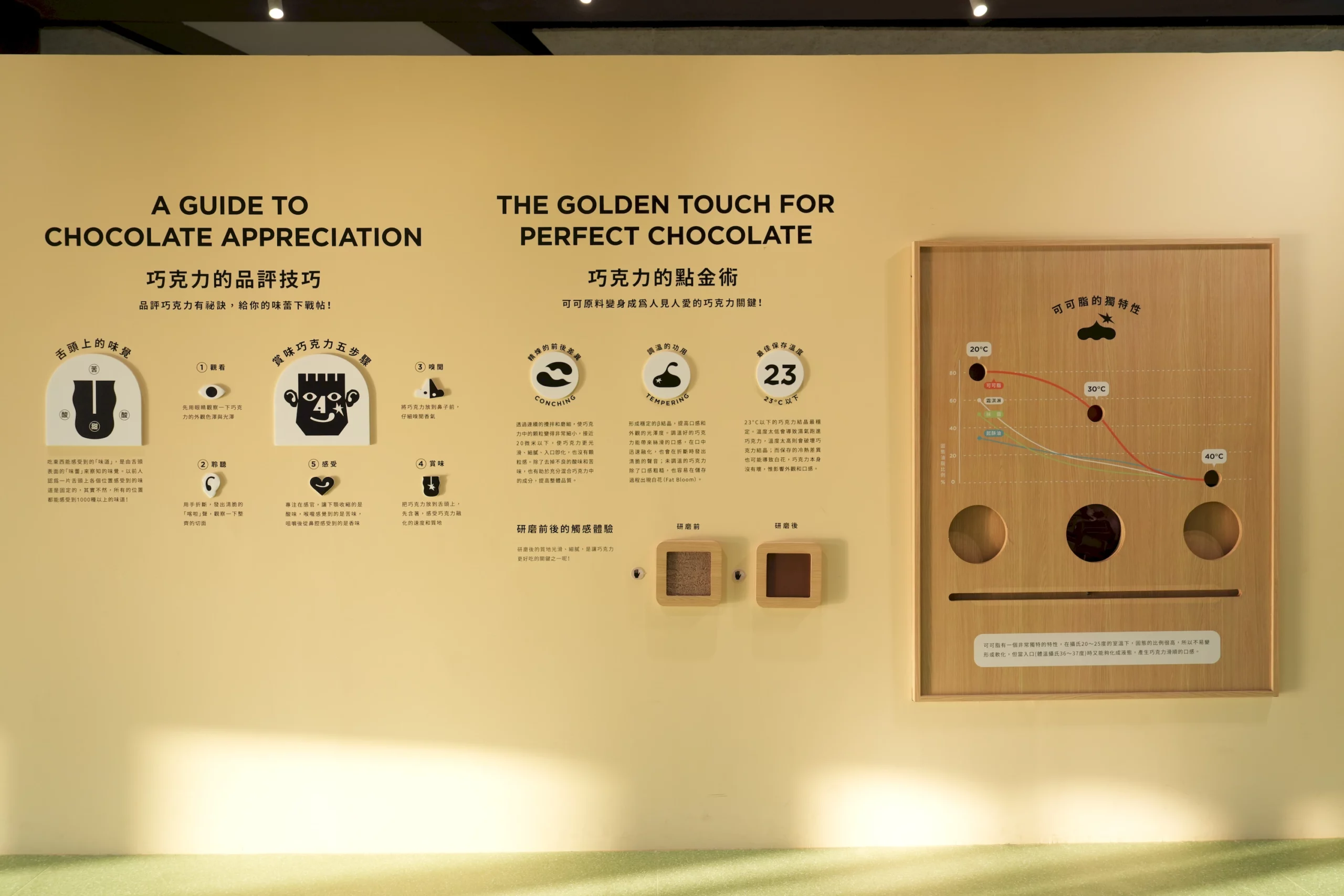 ▼「美味工坊」主要展示巧克力的專業評鑑標準,讓遊客了解如何從外觀、質地、口感與風味等面向,判斷巧克力的品質好壞。