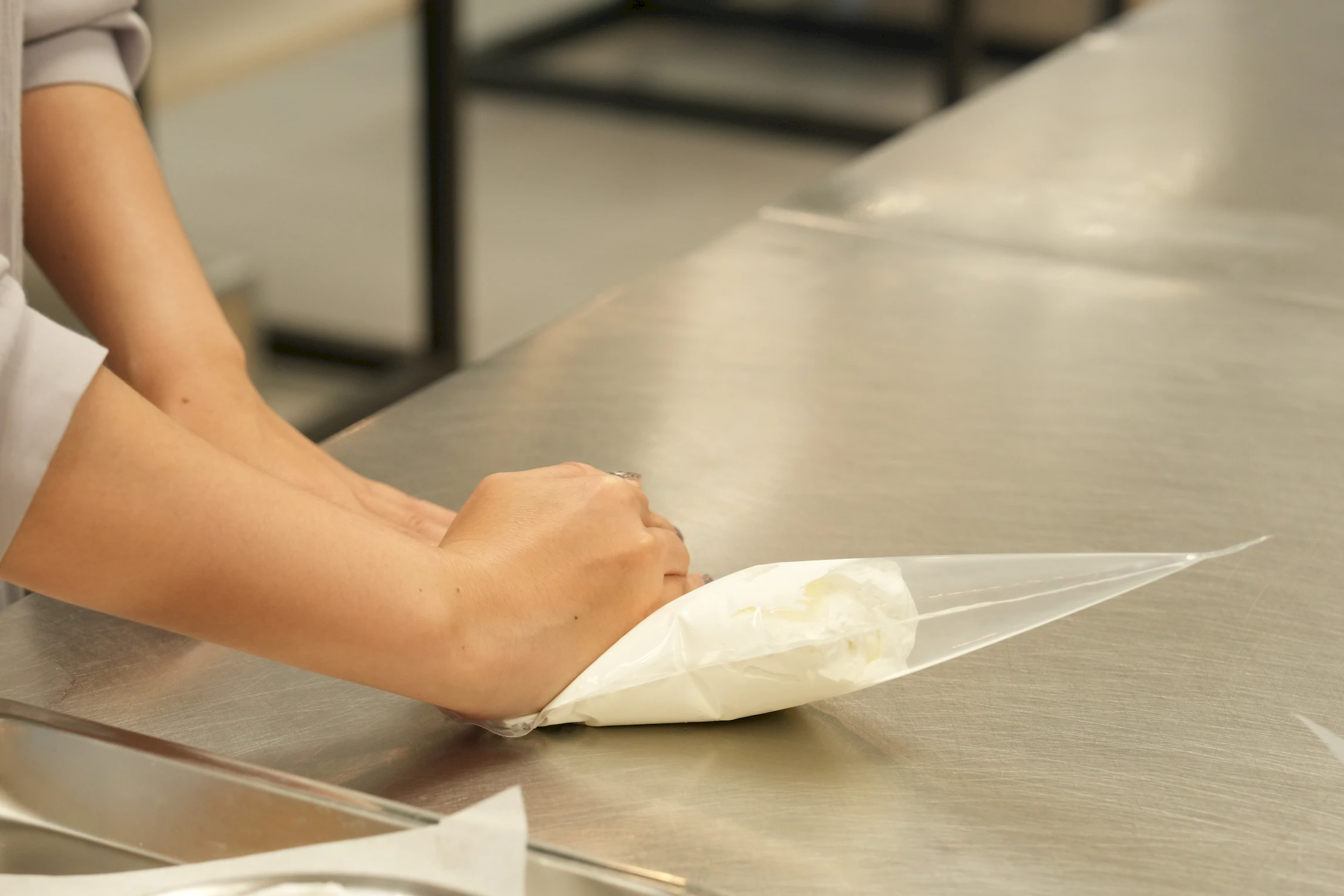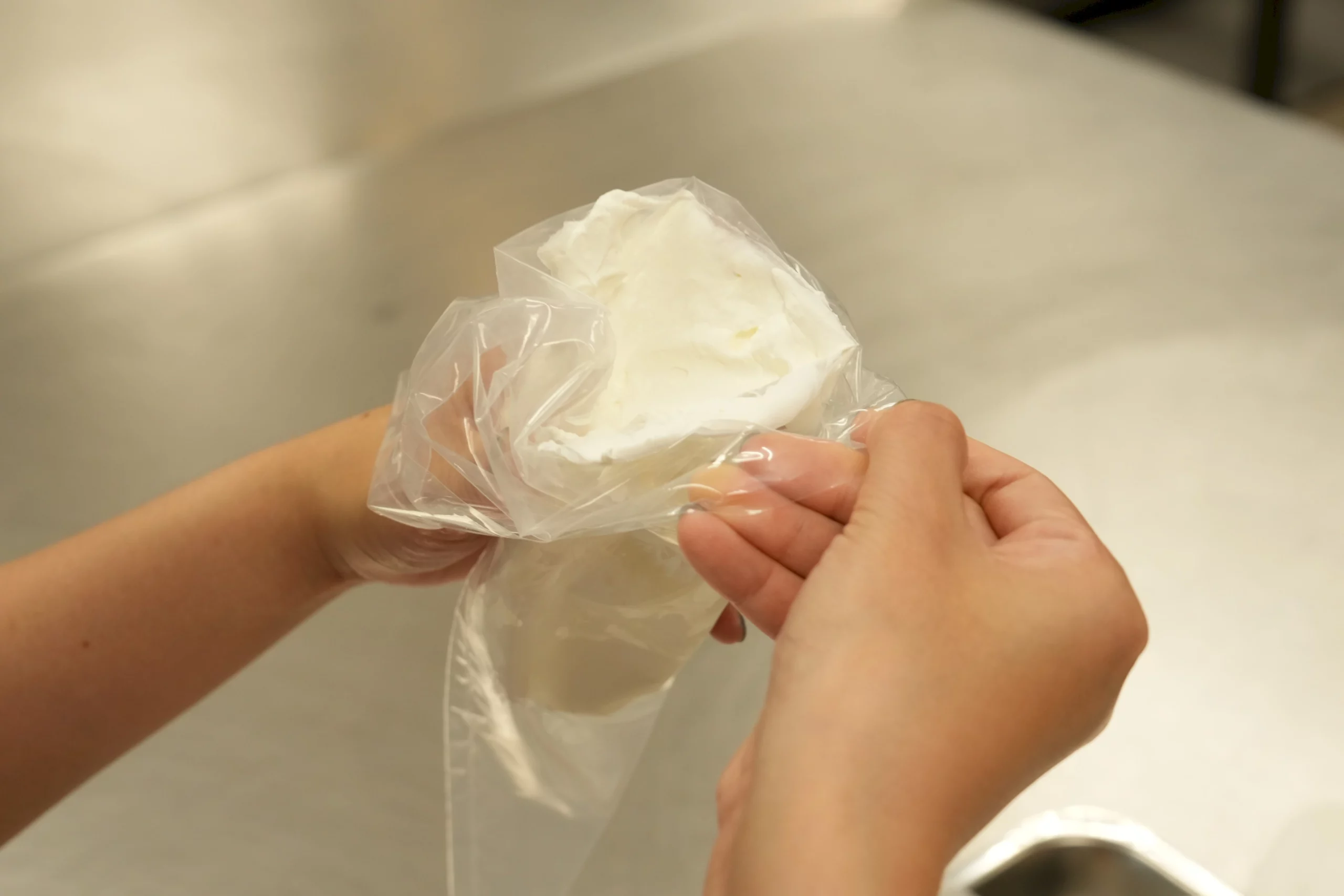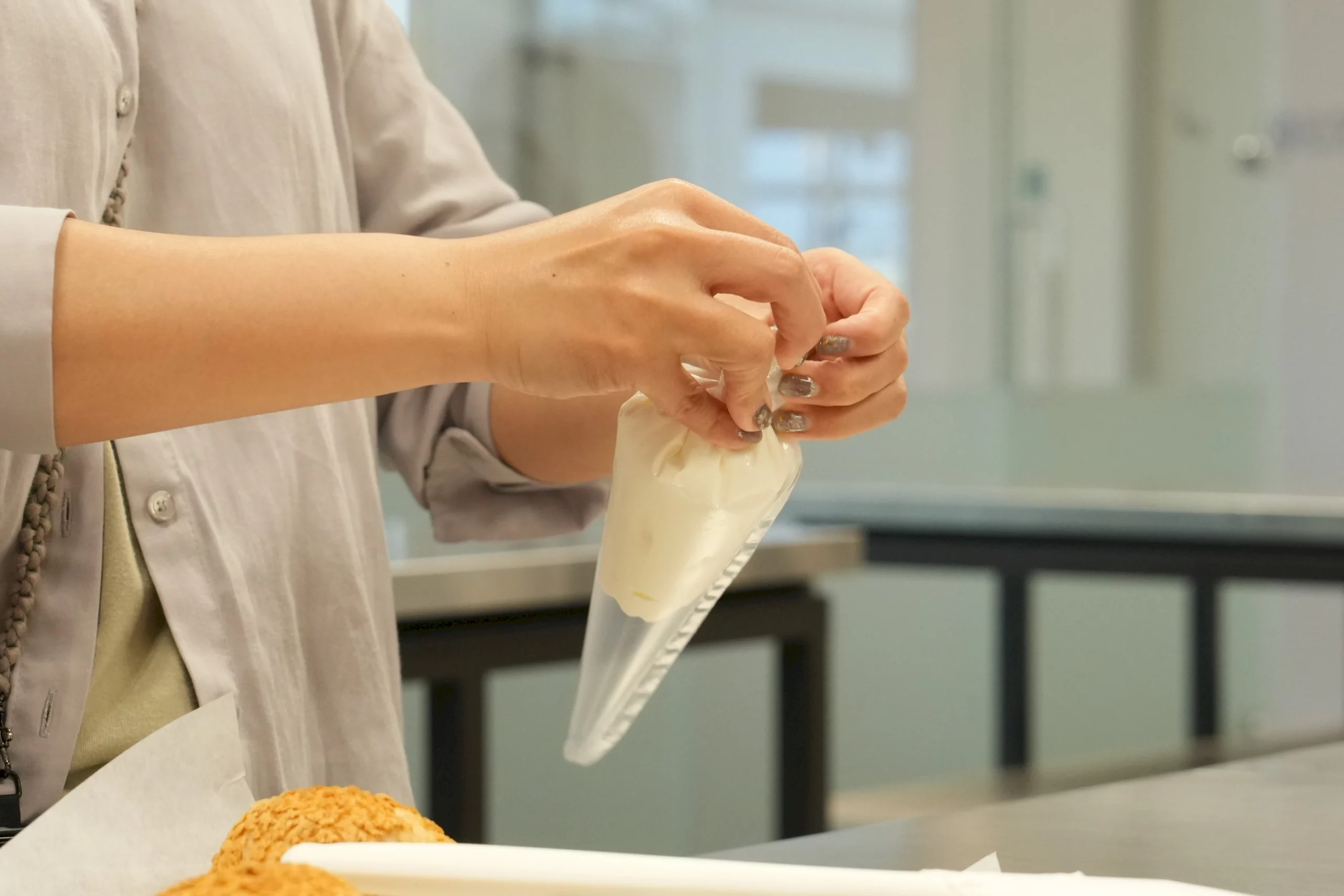 ▼接下來需要將奶油推到擠花袋的前端,並將袋口綁緊後,再用剪刀在前端剪一個小洞,剪完就可以開始將奶油擠到泡芙殼上,這個步驟老師會提醒學員,要盡量將奶油擠得飽滿,做出來的泡芙造型才會更加好看。