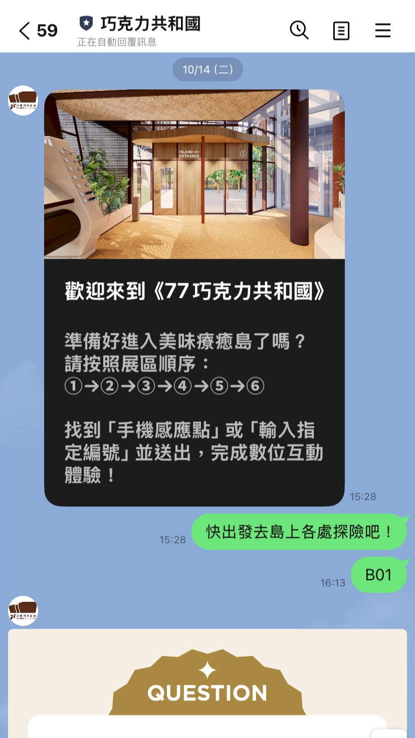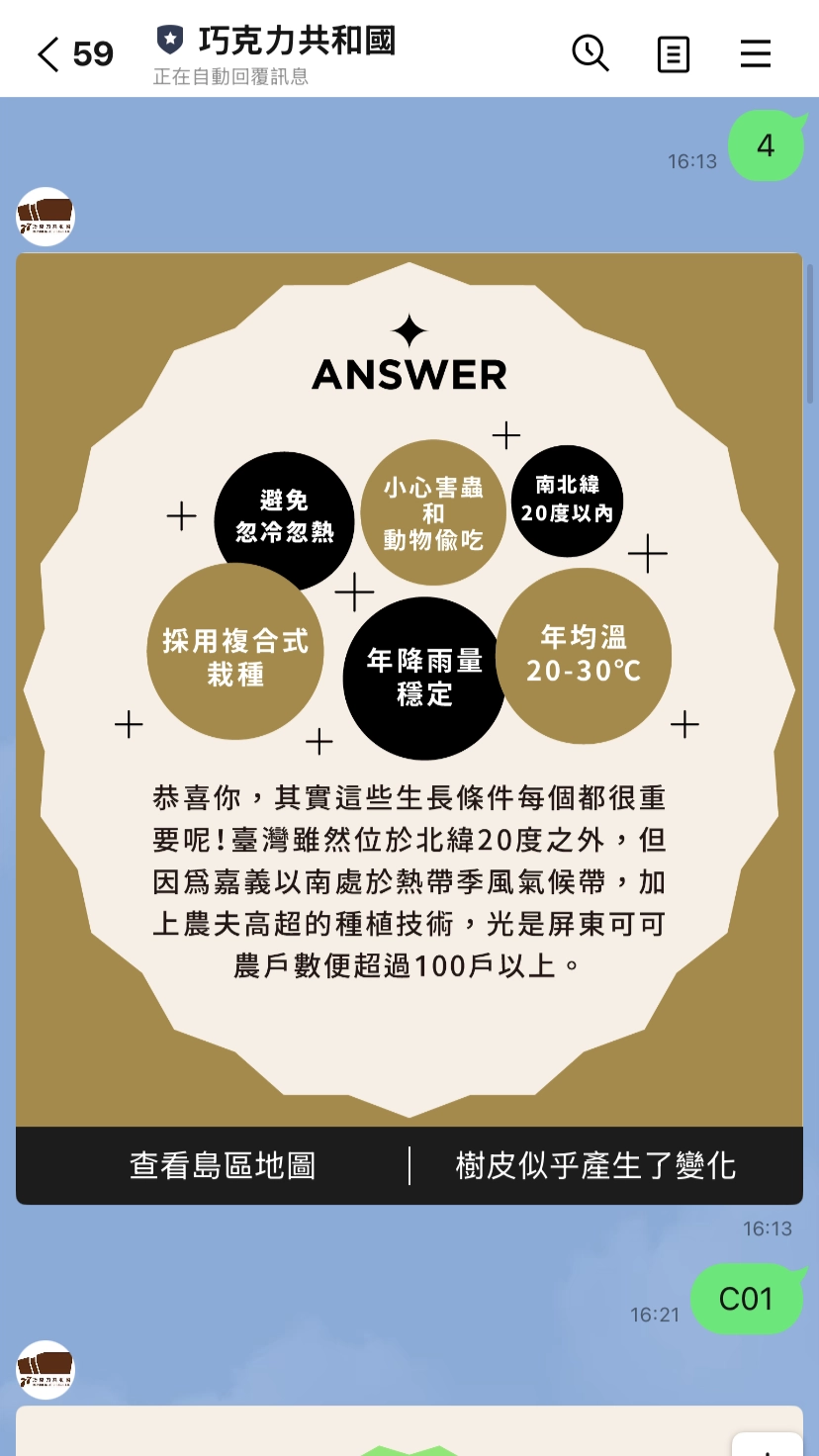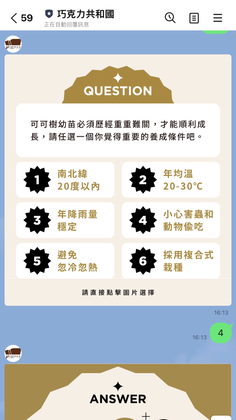 ▼加入官方LINE後,手機的頁面會出現遊戲的介紹與指示,接著只要照著指示進行遊戲即可,操作上很簡單,問題的所有選項都是正確答案,玩家隨機選擇任何一項,遊戲中的可可樹就會根據選項而有相對應的變化,整體遊戲介面設計得可愛、有巧思,內容也很簡單,適合小朋友體驗。