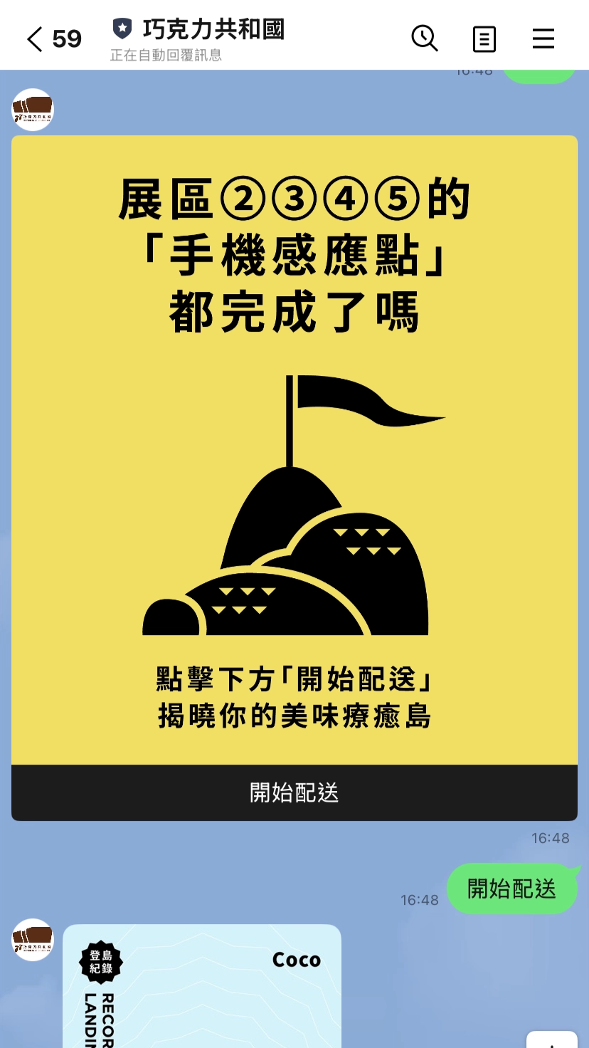 ▼確認有在所有展區輸入相應代碼後,就可以點擊開始配送的按鍵,接著就能在遊戲中找到屬於自己的命定島嶼,並獲得一棵專屬的可可樹,完成遊戲後,此次的參觀到這裡也就結束了。