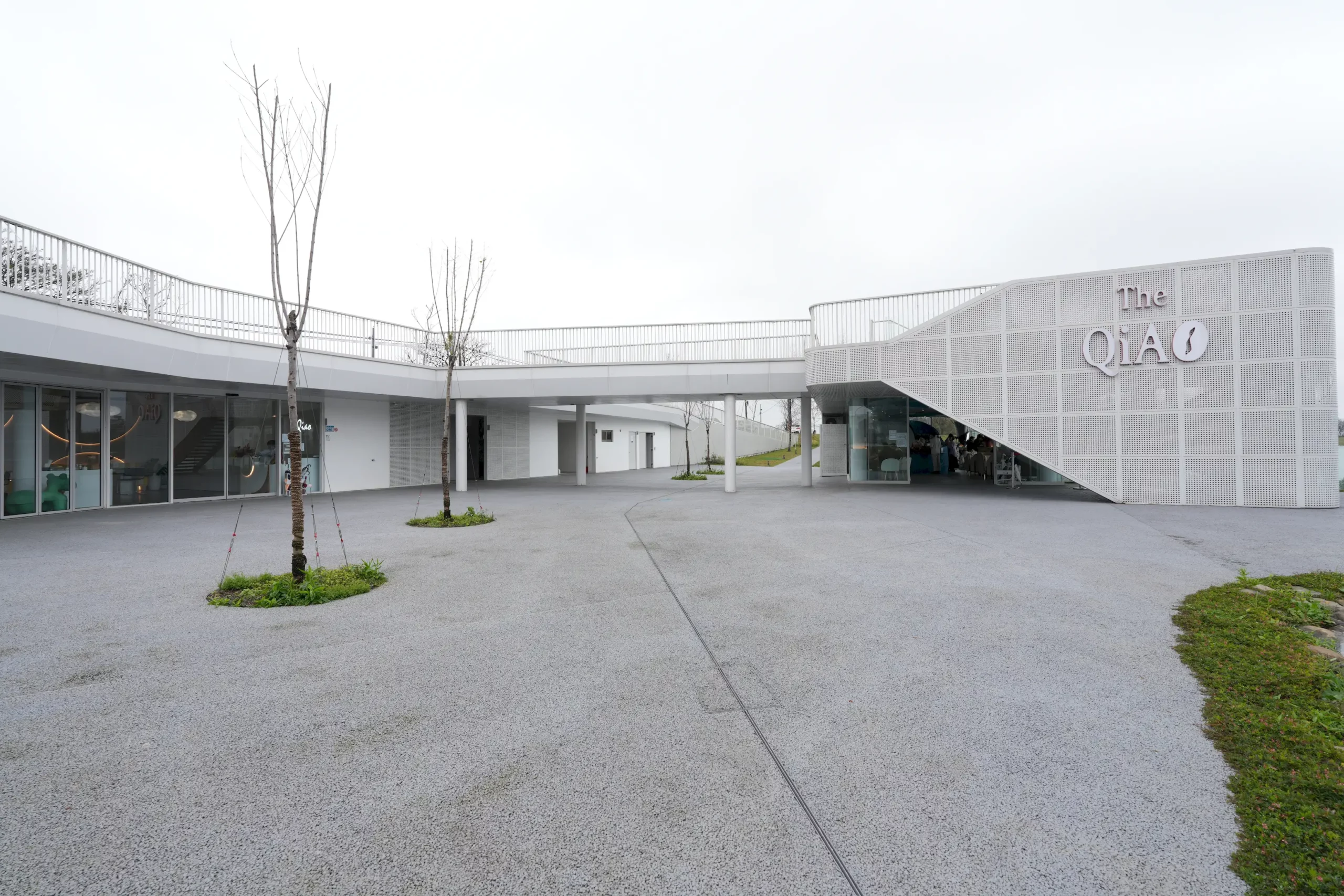 「The QiAO 喬寓咖啡」鄰近華興池生態埤塘公園,一走進公園內就會看到這棟純白建築坐落在超大片的湖面旁,每個轉角都非常好拍,店家還特意將招牌最後一個O設計成咖啡豆的外形,超級可愛又有特色。