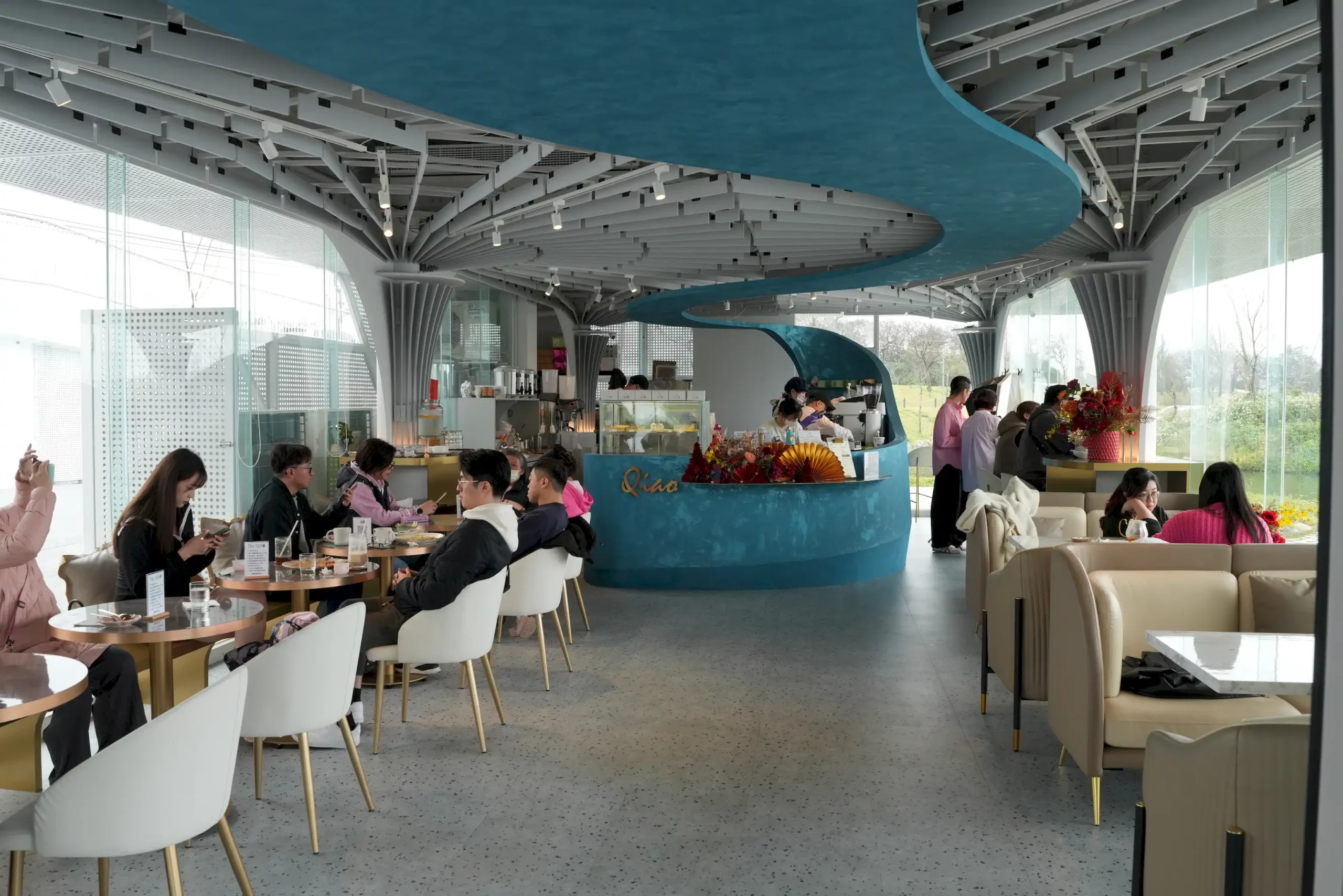 「The QiAO 喬寓咖啡」鄰近華興池生態埤塘公園,一走進公園內就會看到這棟純白建築坐落在超大片的湖面旁,每個轉角都非常好拍,咖啡廳擁有絕佳湖景視野,幸運的話還能近距離看到飛機降落,畫面震撼又特別!親子與寵物友善,是假日帶小孩或毛孩來放風的好去處。餐點選擇豐富,主食有義大利麵,甜點則以塔類與乳酪蛋糕為主;飲品除了咖啡與嚴選茶,也有多種無咖啡因選項,對不喝咖啡的人來說相當友好。可惜的是,實際品嚐後餐點表現偏普通。