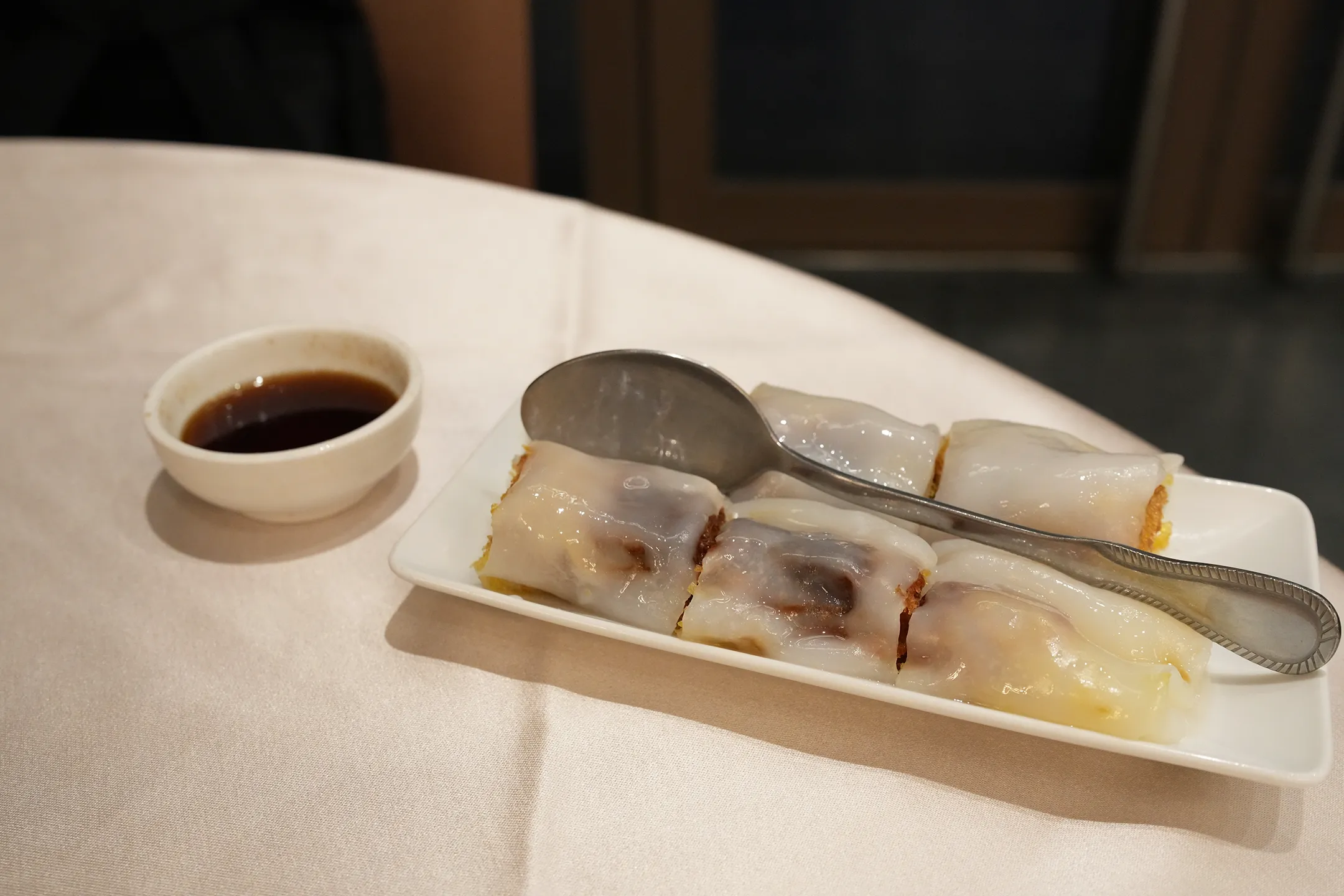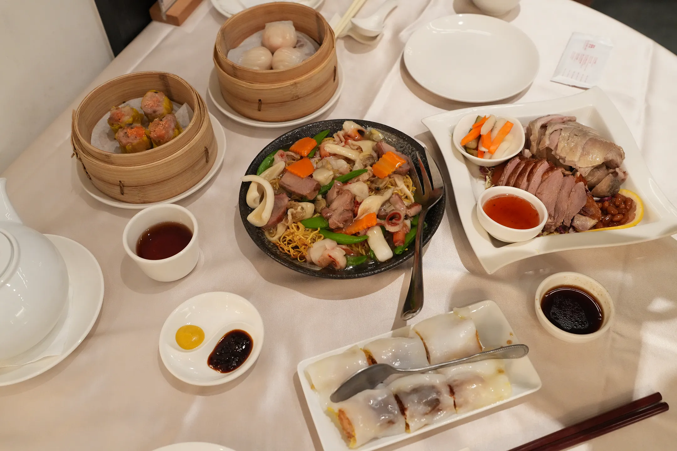 料理方面則表現參差。海鮮炒麵是當晚最亮眼的一道,料多味美,令人印象深刻;玫瑰油雞也有一定水準,值得一試。然而港式點心的表現卻令人惋惜——蝦餃皮厚,內餡以蝦泥取代整隻蝦,少了應有的彈牙口感;燒賣更是完全嚐不到蝦香,只剩單調的肉味;主打新品的鮮蝦腸粉雖然腸粉皮質地出眾,但內部使用的卻不是鮮蝦,而是炸蝦捲,整體因油膩感過重而大打折扣。店內招牌櫻桃鴨口感略乾柴,也讓人不免感到失望,整體而言,朝桂餐的餐點口味中規中矩,但菜單品項豐富多元。