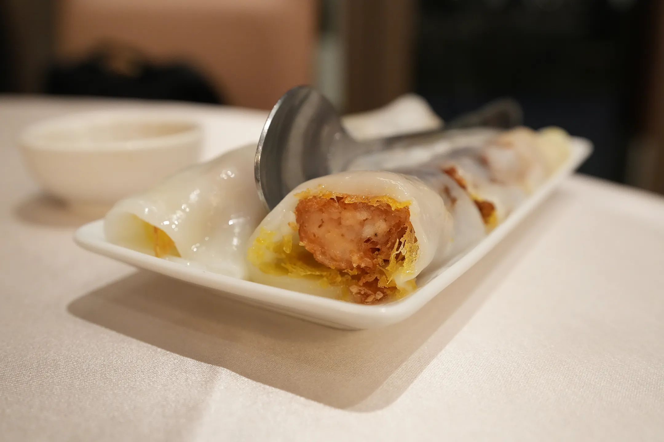 ▼點餐的時候,服務生向我們推薦他們的新品「迷惘鮮蝦腸粉」。腸粉端上桌後,外皮果然Q彈細滑,一咬下去卻先迎來一層酥脆帶油的口感,既不是油條,卻有幾分相似的酥香,內裡包裹的並非菜單所寫的鮮蝦,而是炸蝦捲,由於和腸粉搭配反差較大,吃起來會有稍重的油膩感,也與當初介紹的內容略有不同,讓我們吃得相當困惑。