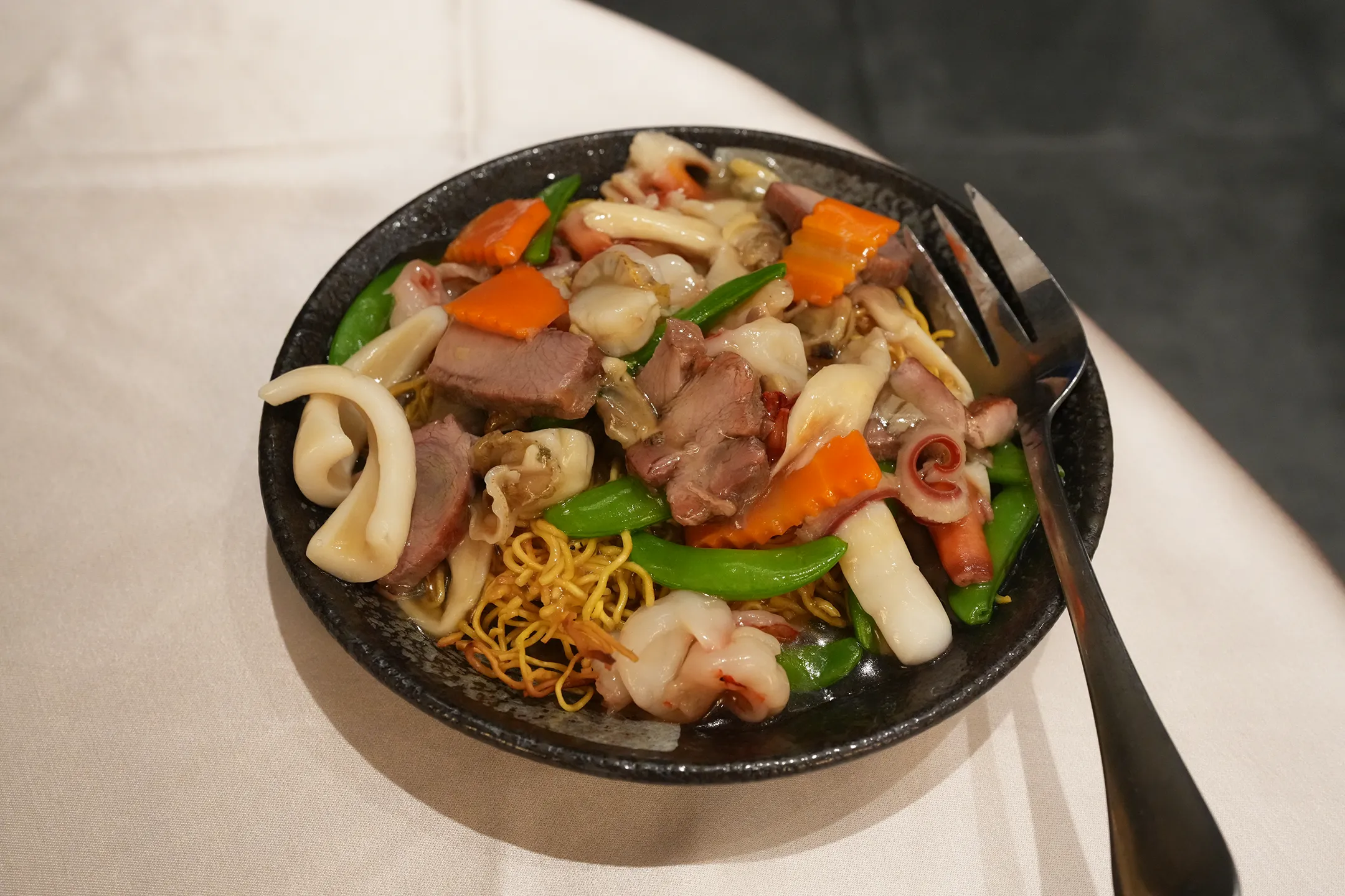 ▼「海鮮炒麵」是這餐令我們相當滿意的一道料理,麵體選用經典的港式公仔麵,炒製後根根分明、口感彈牙,帶著鑊氣的香氣撲鼻而來,海鮮的份量料多實在。整體調味拿捏得恰到好處,鹹淡適中,海鮮的鮮甜與麵體充分融合,越吃越順口。
